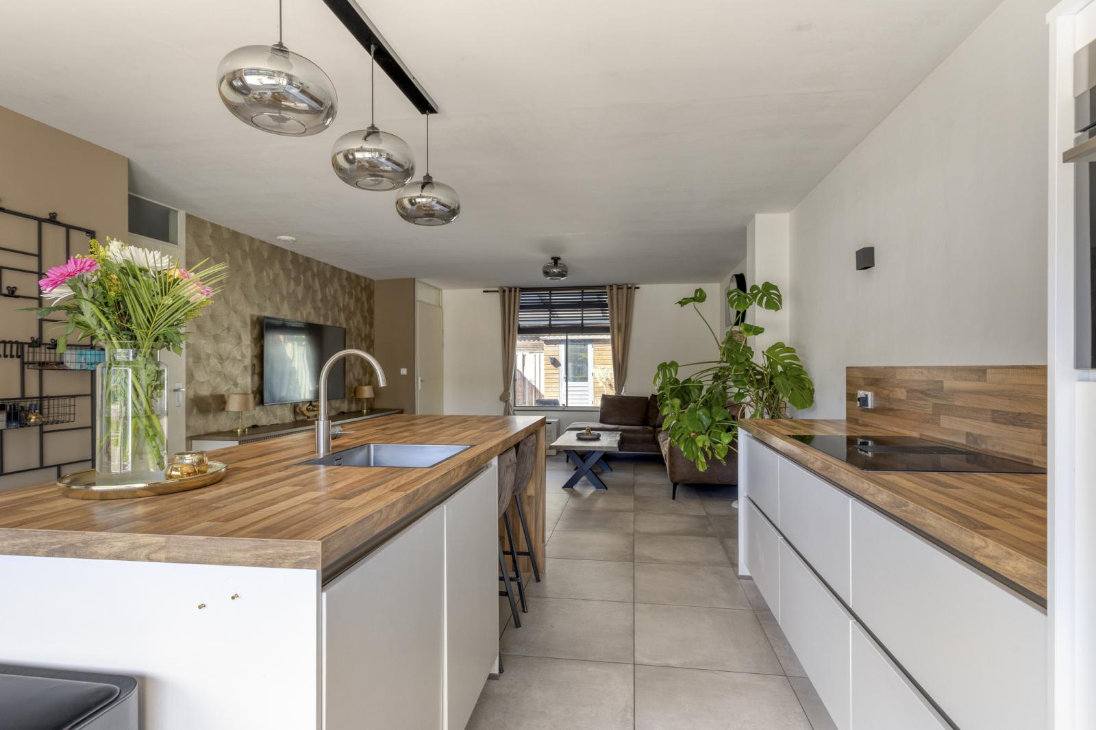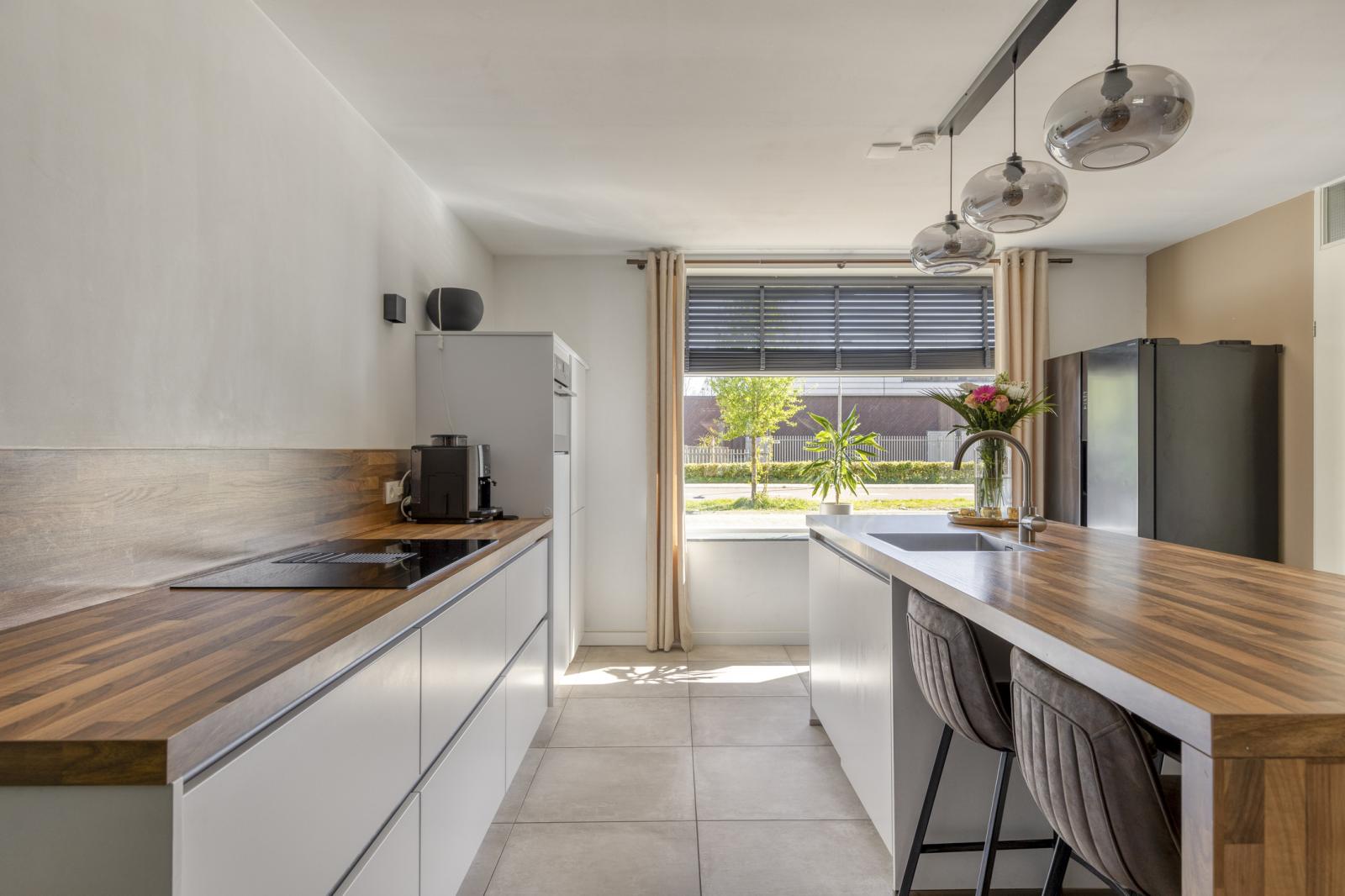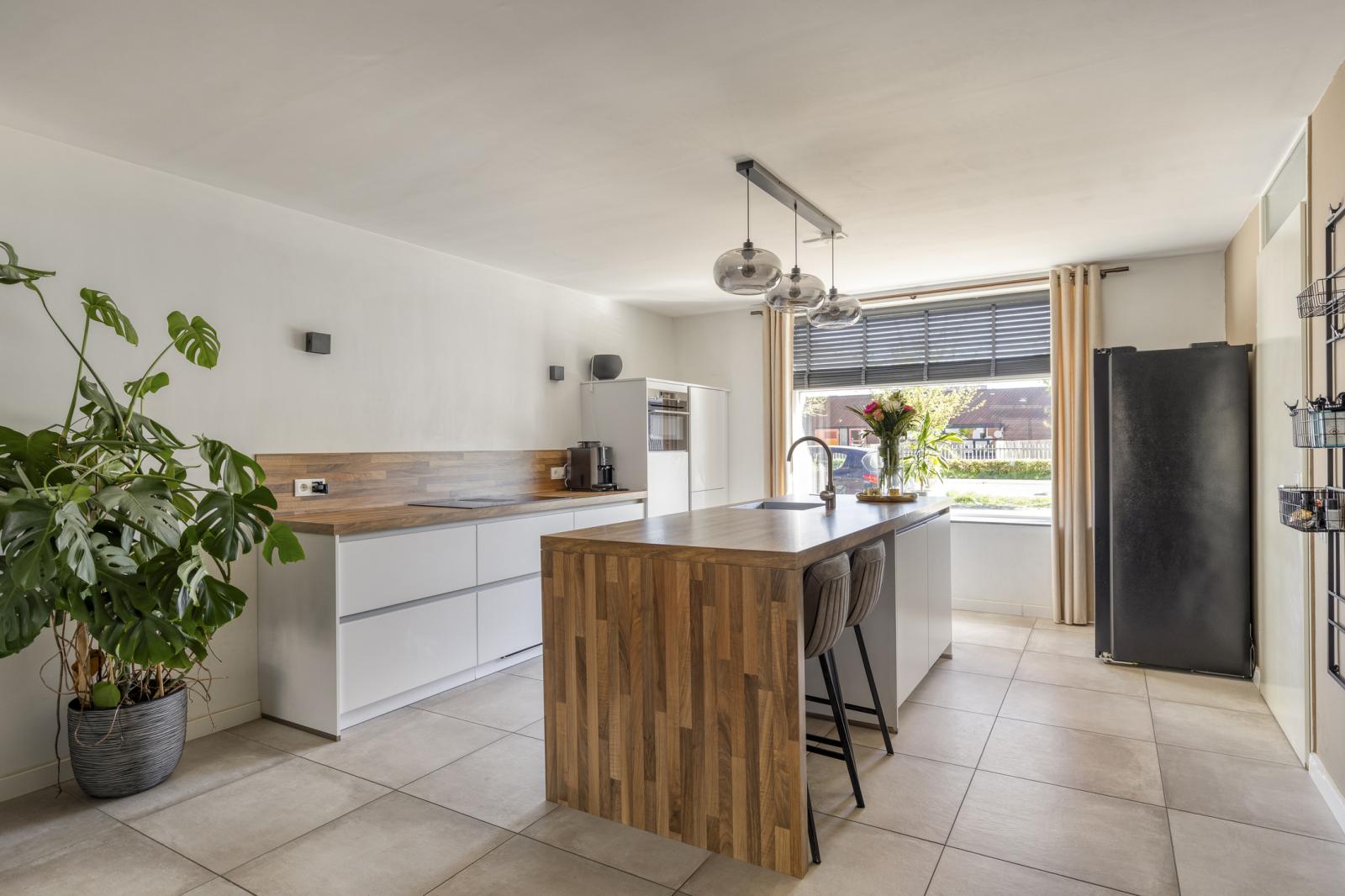Dan de keuken, en wat voor een keuken. Aan de voorzijde bevindt zich een stijlvolle leefkeuken met strakke witte kasten, een warmtonen houten werkblad en een centraal kookeiland, compleet met spoelbak en verlengd aanrechtblad zodat je er ook aanschuift voor een ontbijt of een goed gesprek. De keuken is voorzien van een inductiekookplaat met geïntegreerde afzuiging, vaatwasser, koelkast en brede lades, ruimte voor alles wat een kok nodig heeft. Sfeervolle hangende glazen lampen boven het eiland maken het geheel compleet.