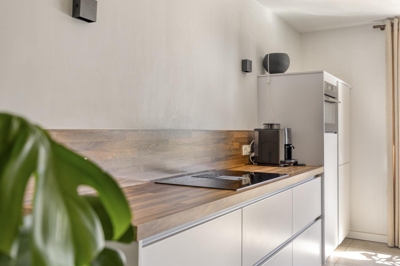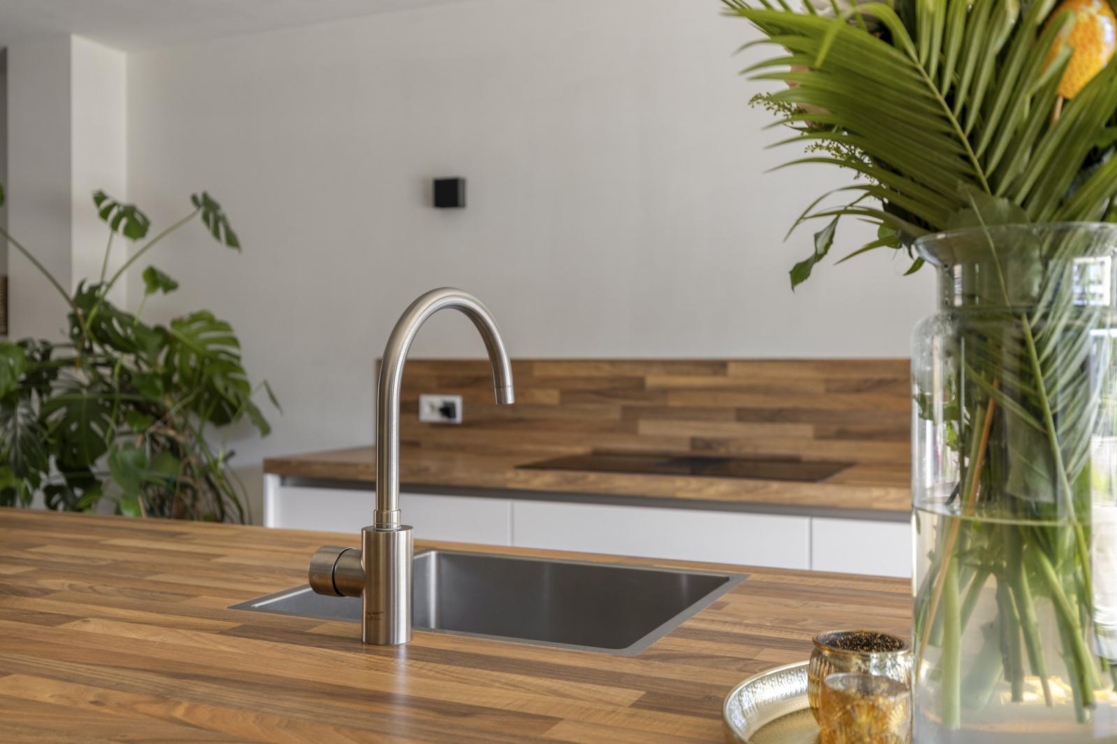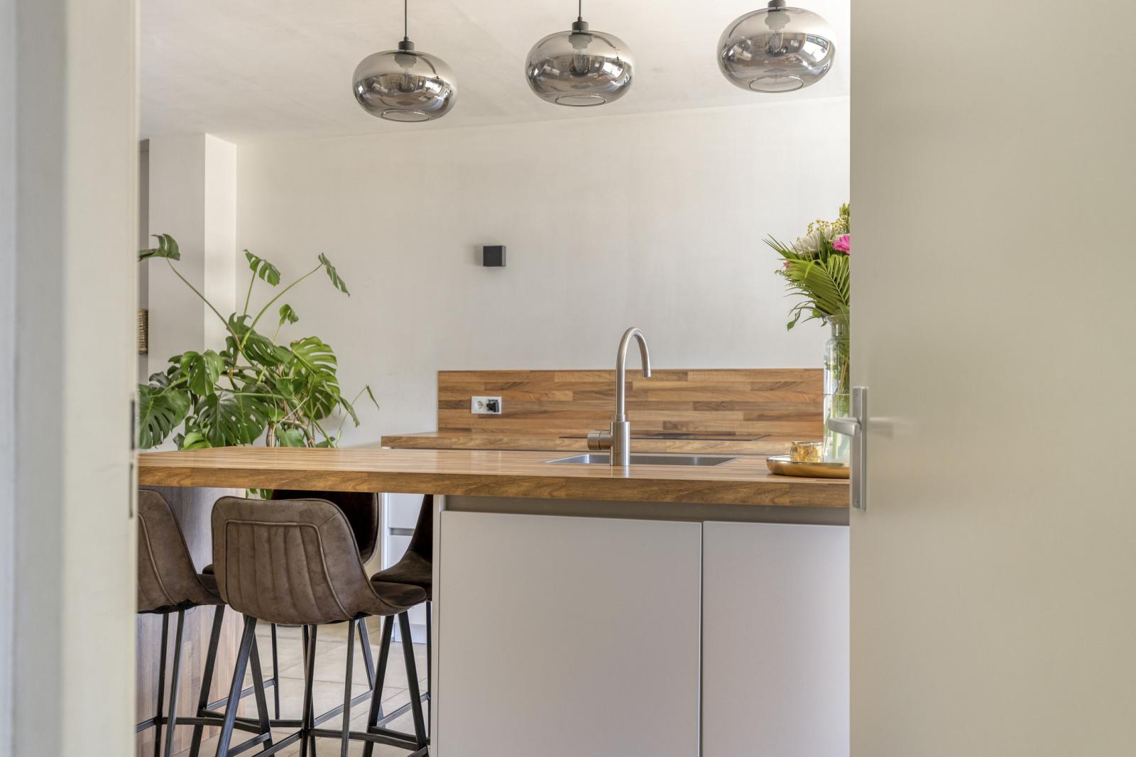 Dan de keuken, en wat voor een keuken. Aan de voorzijde bevindt zich een stijlvolle leefkeuken met strakke witte kasten, een warmtonen houten werkblad en een centraal kookeiland, compleet met spoelbak en verlengd aanrechtblad zodat je er ook aanschuift voor een ontbijt of een goed gesprek. De keuken is voorzien van een inductiekookplaat met geïntegreerde afzuiging, vaatwasser, koelkast en brede lades, ruimte voor alles wat een kok nodig heeft. Sfeervolle hangende glazen lampen boven het eiland maken het geheel compleet.