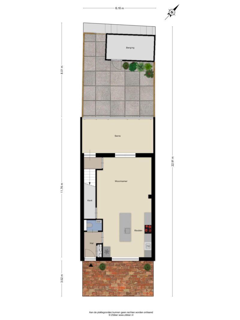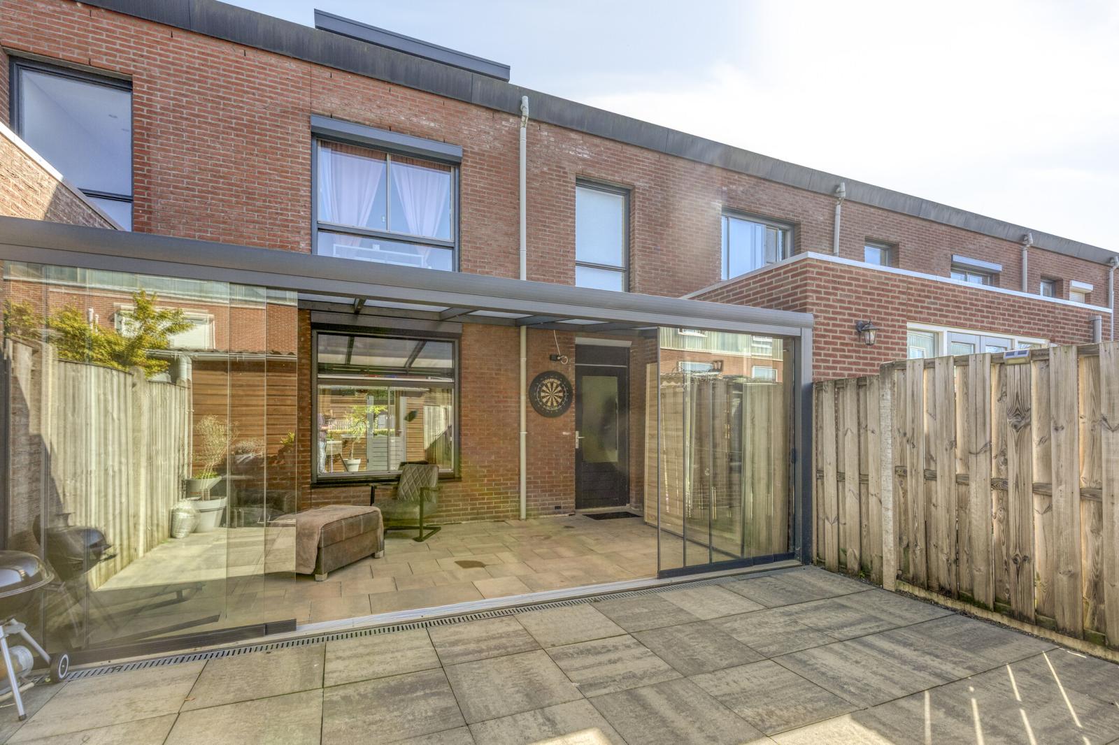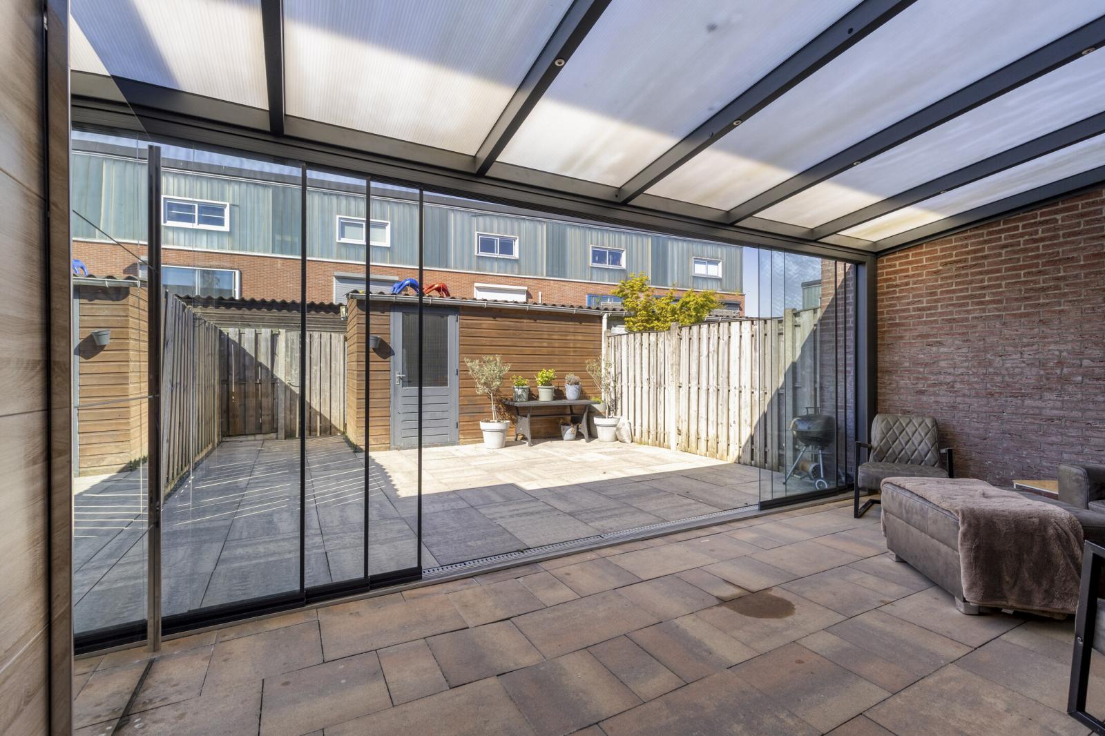 De achtertuin ligt op het noorden, heerlijk beschut en met een prettige balans tussen zon en schaduw. Op warme dagen blijft het er aangenaam koel, terwijl je toch volop kunt genieten van de zon in de loop van de middag en vroege avond. De royale overdekte veranda van 17,6 m² met glazen schuifdeuren maakt buiten leven het hele jaar door mogelijk: beschut bij regen, open bij mooi weer. De tuin is onderhoudsvriendelijk aangelegd met strakke tegels, en in de houten berging berg je moeiteloos je fiets en tuingereedschap op.