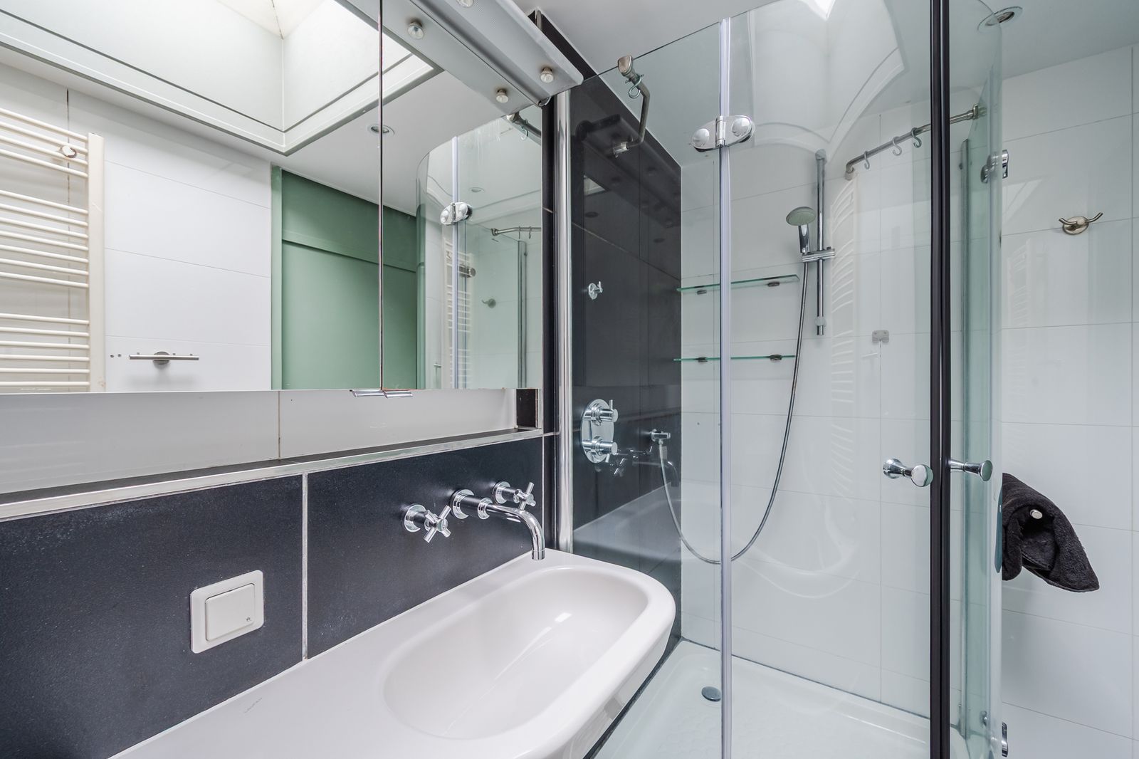 Via de overloop met open trap naar de zolder bereik je de ruime achterslaapkamer (ca. 19 m²) met airco en toegang tot het dakterras. De moderne badkamer is uitgerust met een wastafel, douchecabine, dubbele jacuzzi en inbouwspots. Aan de voorzijde bevinden zich drie goed bemeten slaapkamers en een handige inbouwkast voor extra bergruimte. Op de overloop bevindt zich een separate toiletruimte.