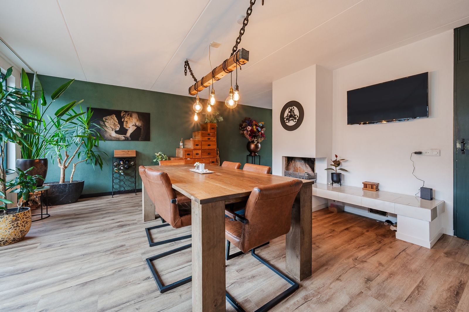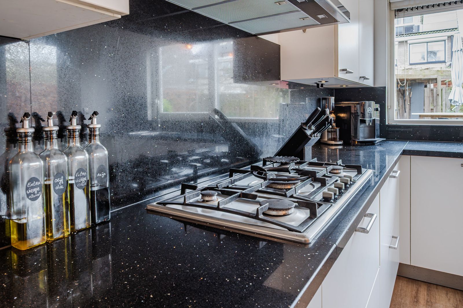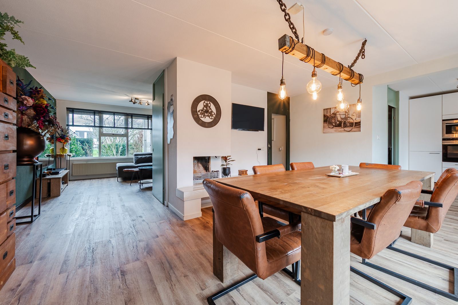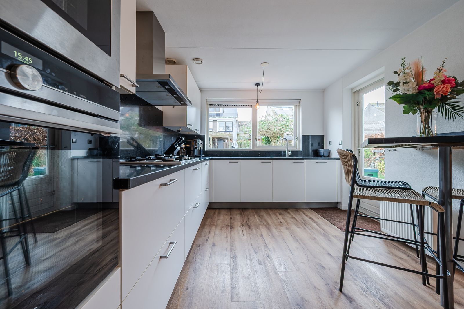 De riante woon-/eetkamer (ca. 45 m²) met vloerverwarming en openhaard is op meerdere manieren in te delen. Via de schuifpui heb je directe toegang tot de achtertuin. De flinke L-vormige hoekkeuken is voorzien van een dubbele spoelbak, vaatwasser (2024), koelkast (2023), oven (2024), stoomoven, Quooker (2026), gaskookplaat en een praktische baropstelling. Naast de keuken bevindt zich de bijkeuken met aansluitingen voor wasmachine en droger, de cv-ketel en de omvormer voor de zonnepanelen.