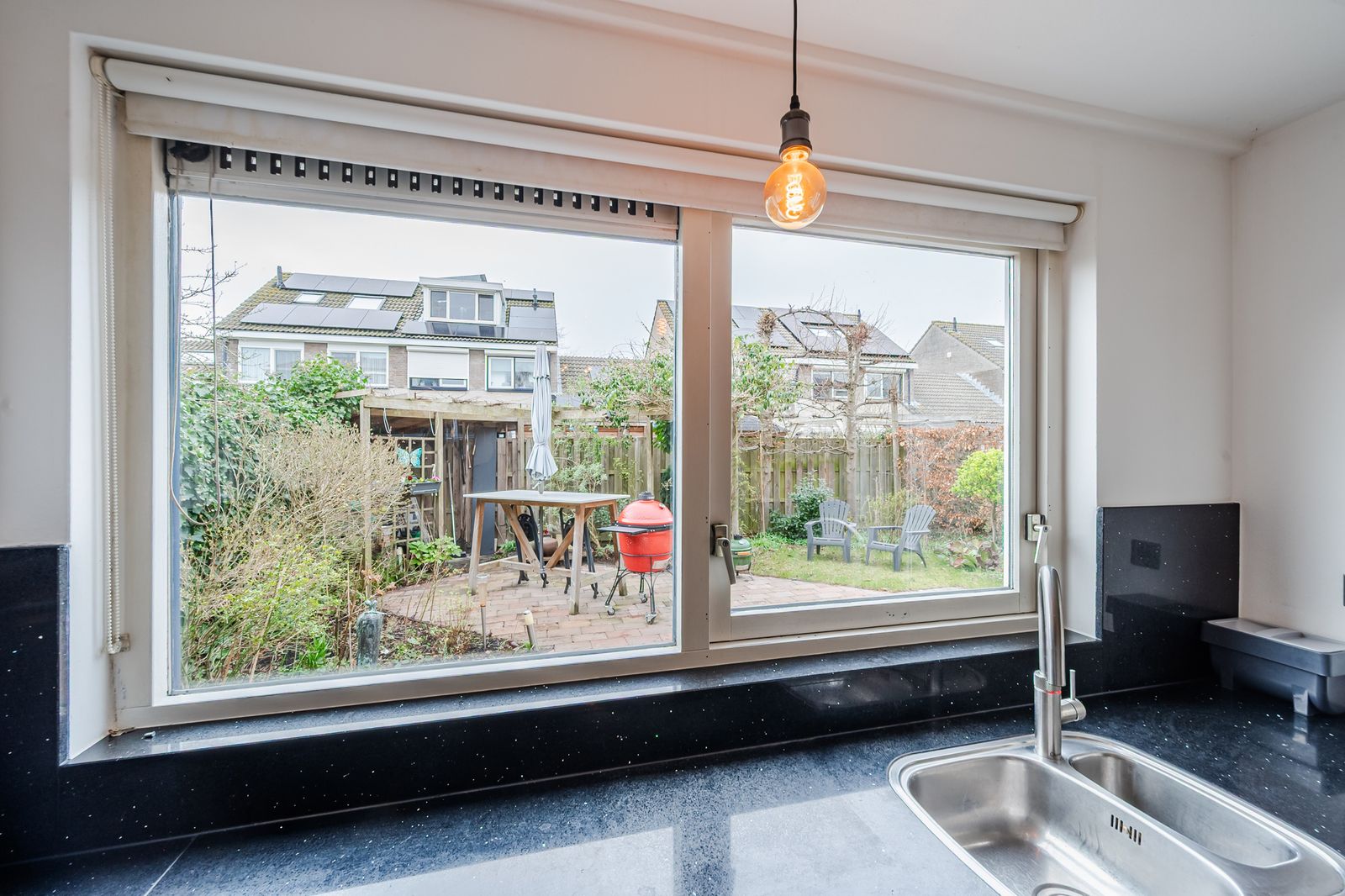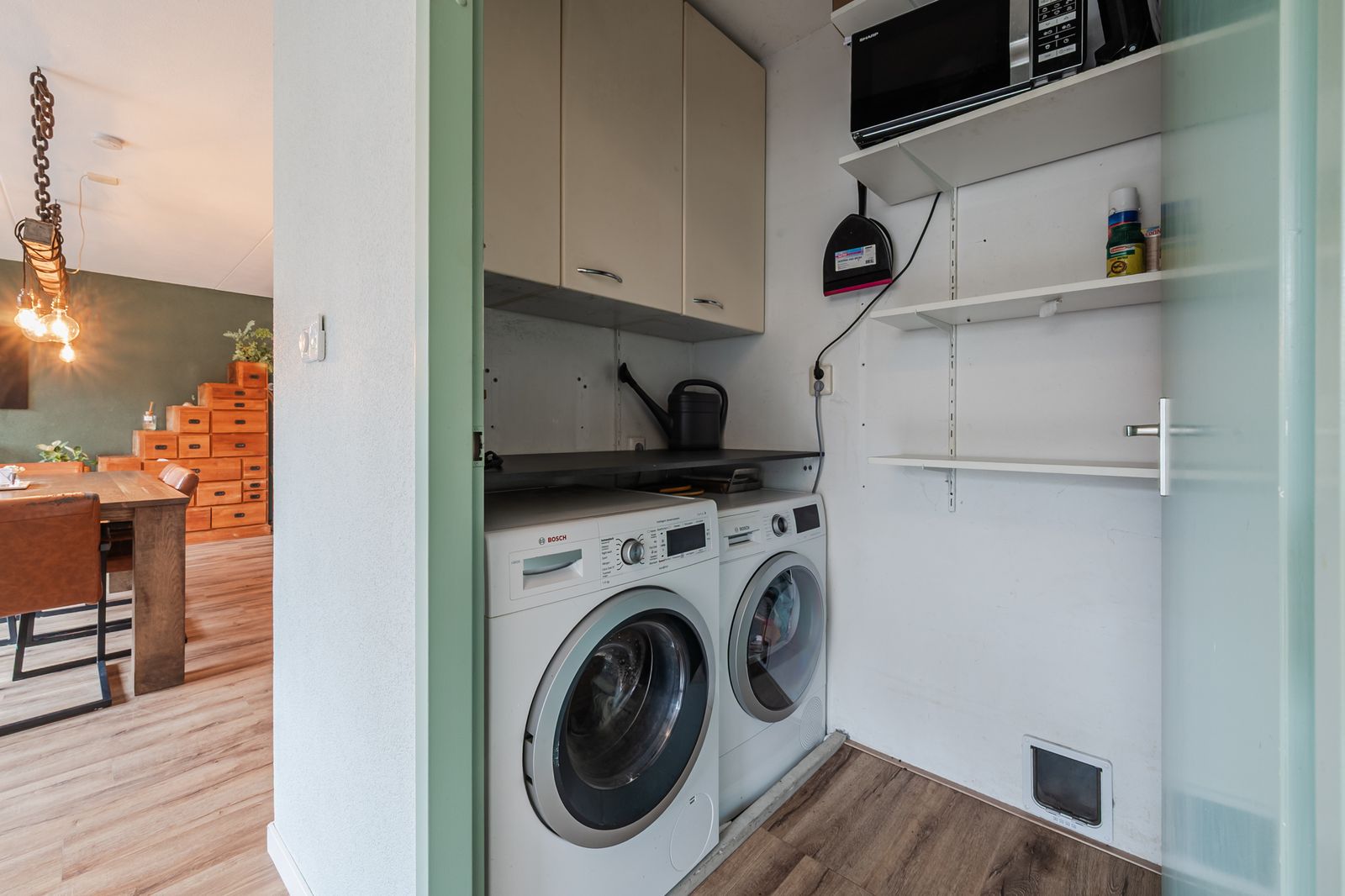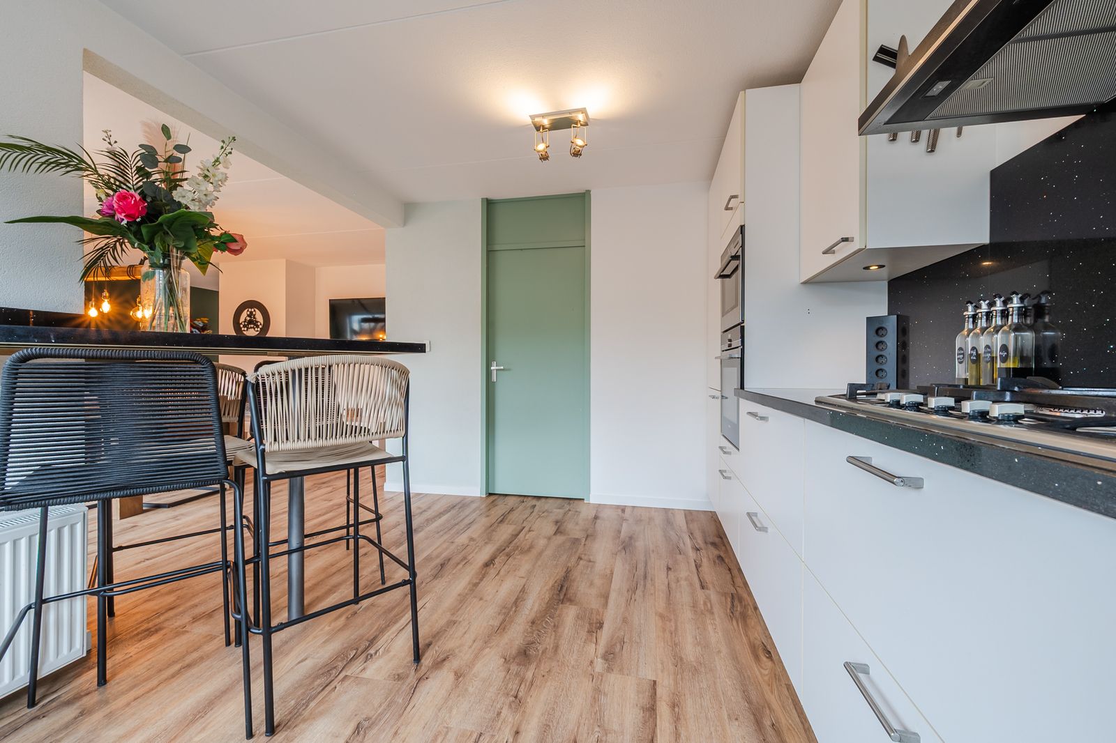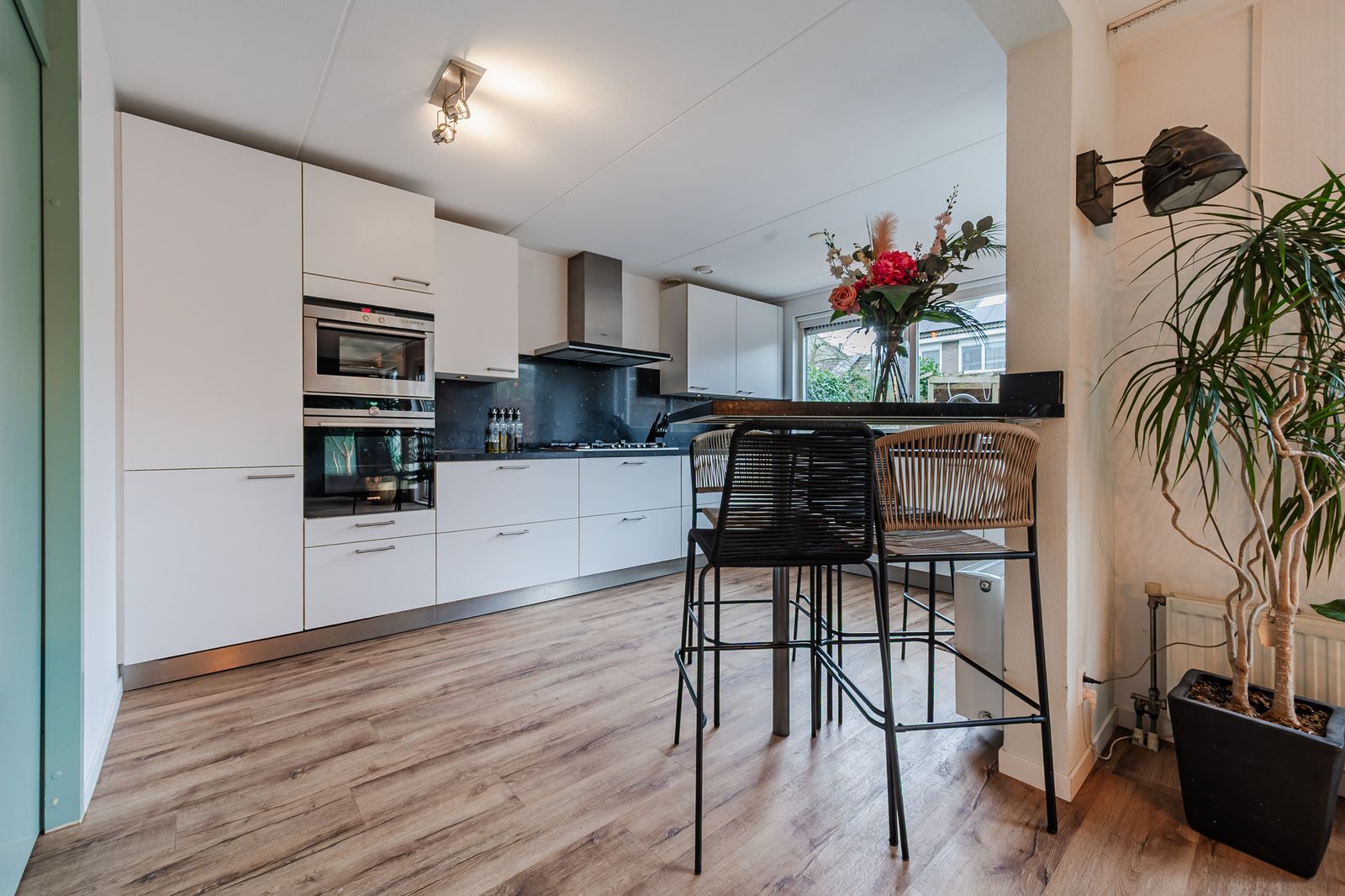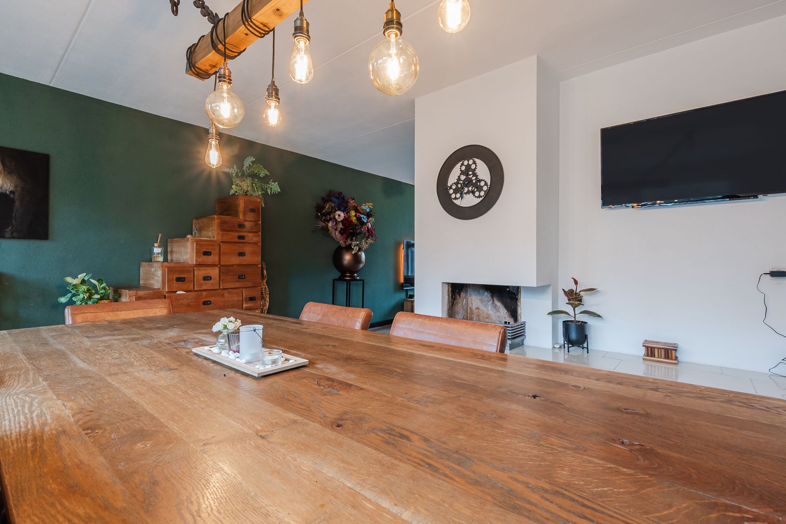 De riante woon-/eetkamer (ca. 45 m²) met vloerverwarming en openhaard is op meerdere manieren in te delen. Via de schuifpui heb je directe toegang tot de achtertuin. De flinke L-vormige hoekkeuken is voorzien van een dubbele spoelbak, vaatwasser (2024), koelkast (2023), oven (2024), stoomoven, Quooker (2026), gaskookplaat en een praktische baropstelling. Naast de keuken bevindt zich de bijkeuken met aansluitingen voor wasmachine en droger, de cv-ketel en de omvormer voor de zonnepanelen.