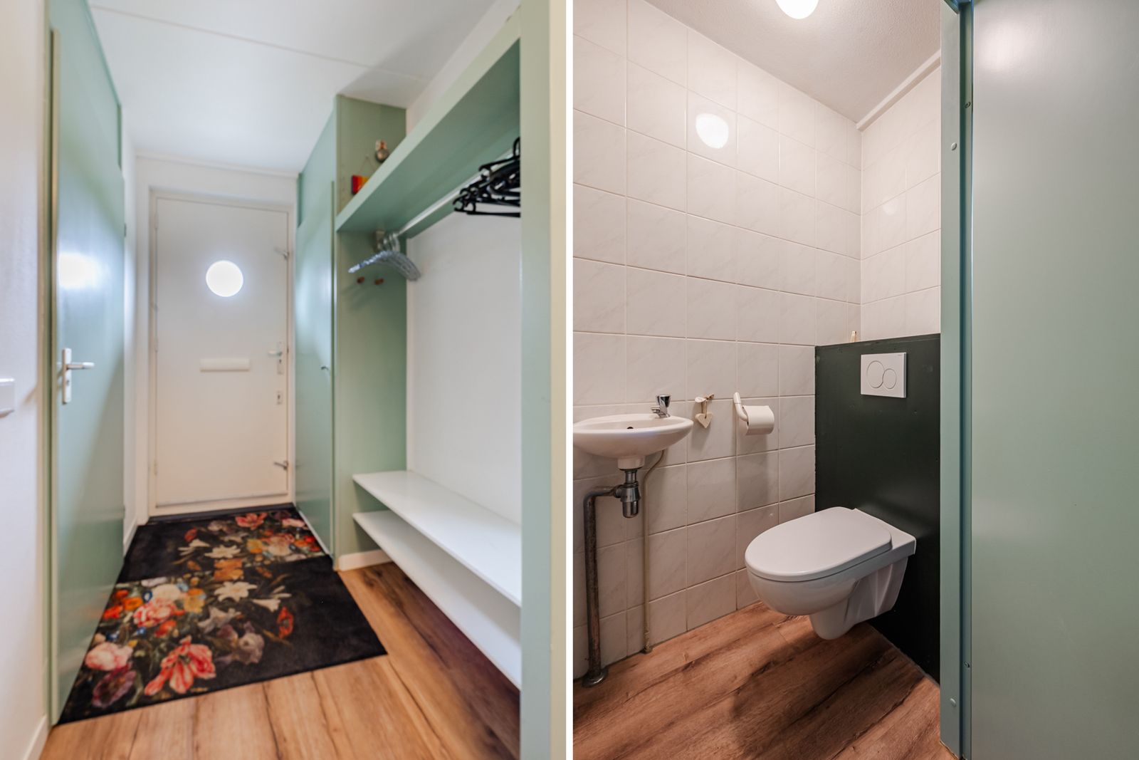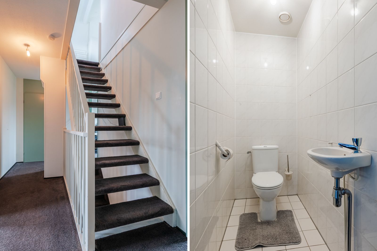 De betegelde toiletruimte is voorzien van een zwevend toilet en fonteintje.