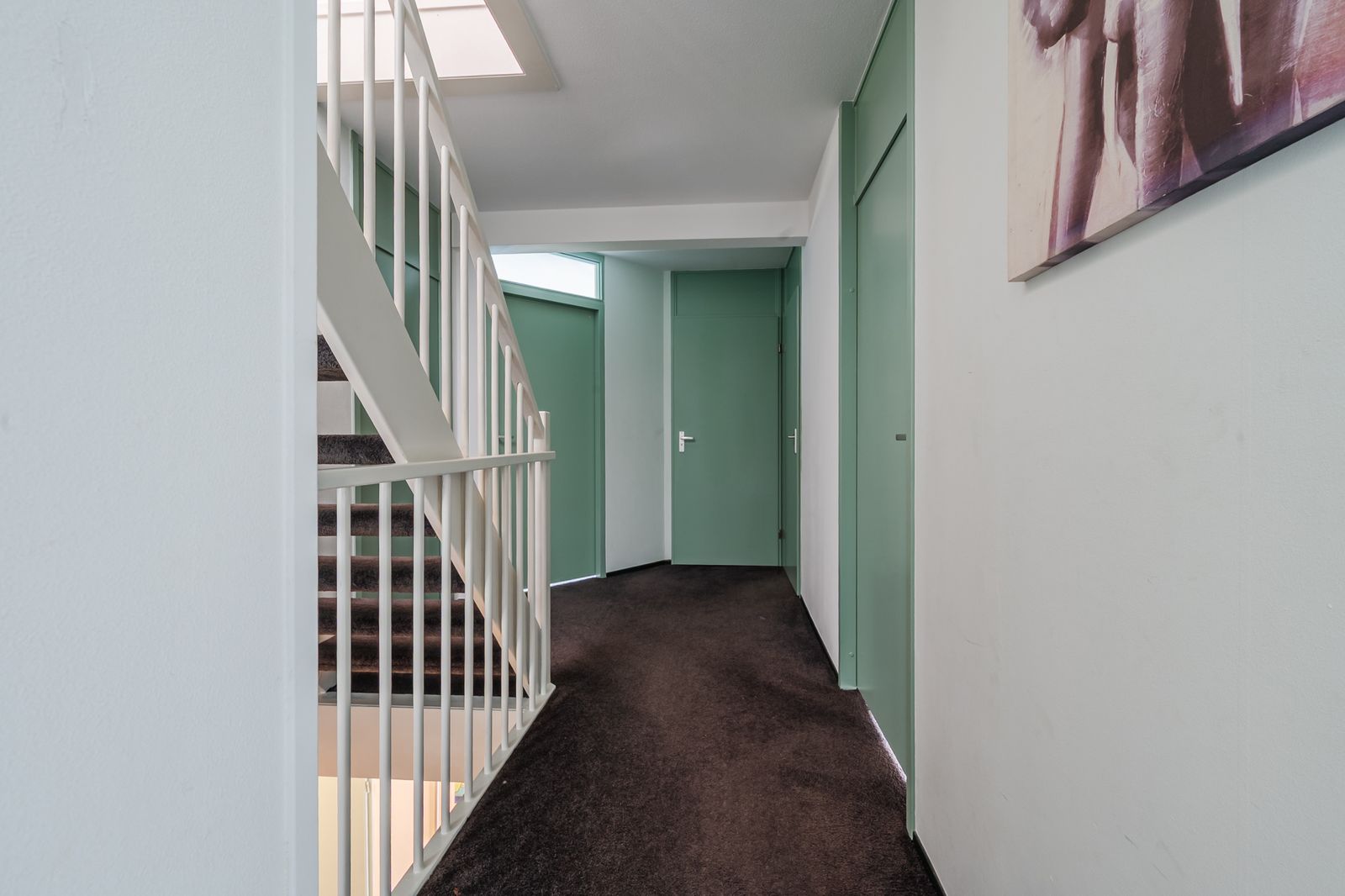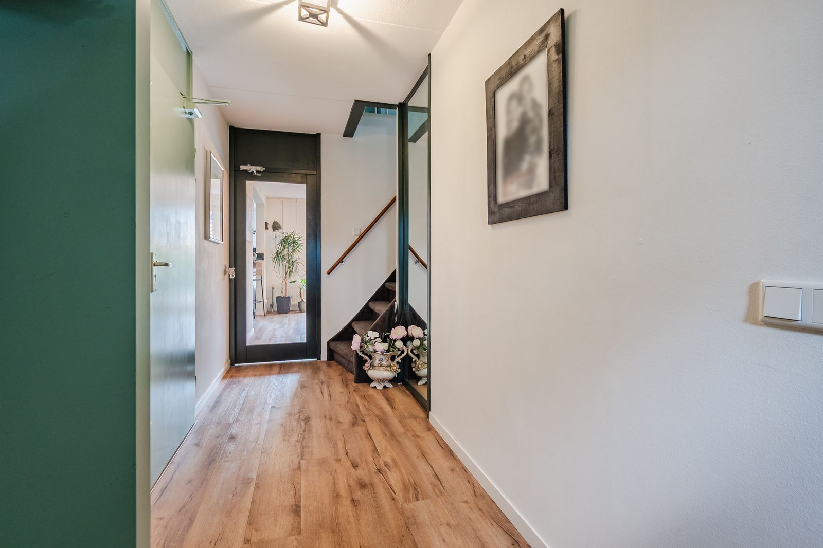 Binnenkomst in de lange hal, met deur naar de garage en trapopgang.