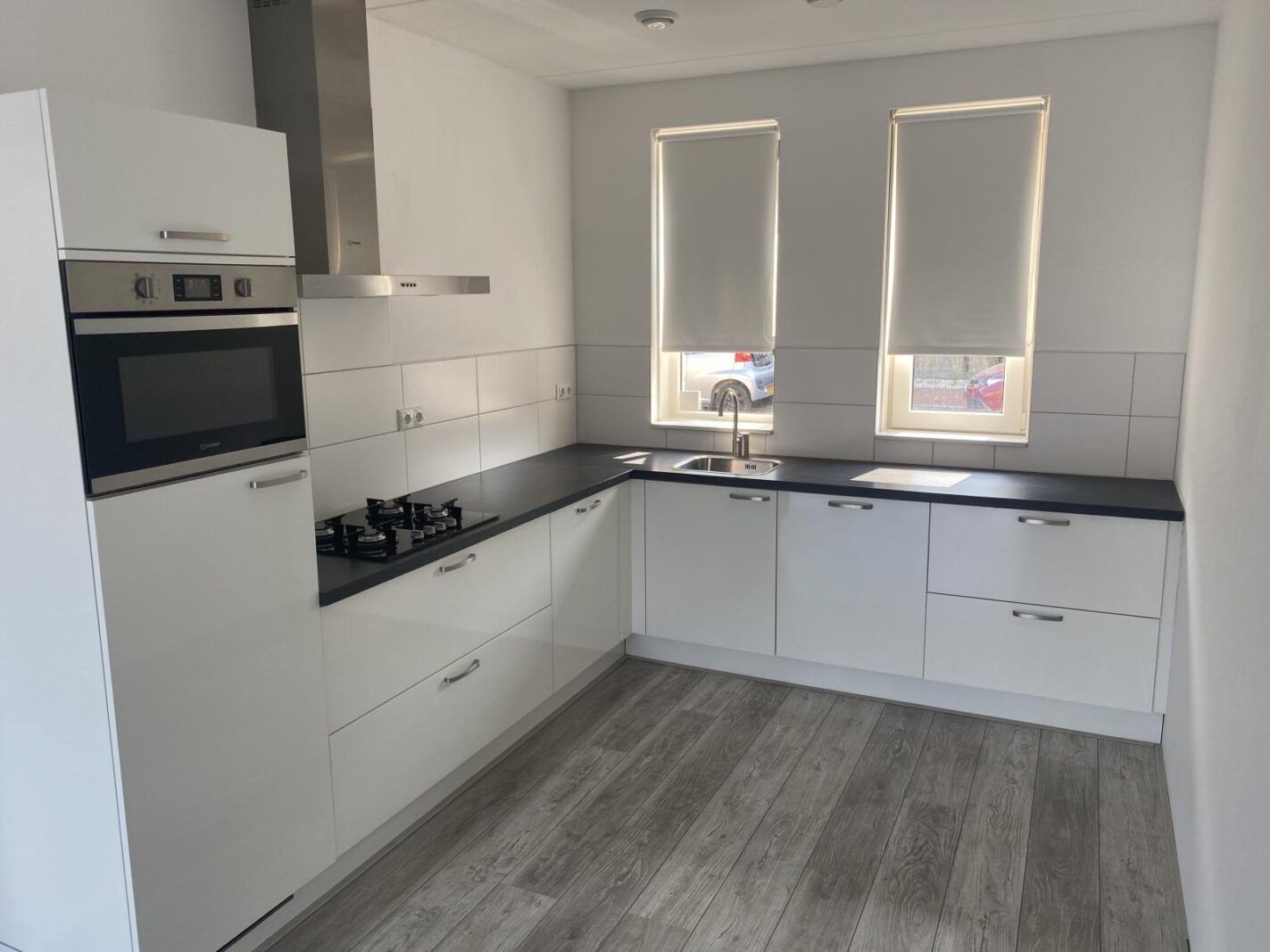 Ground floor: Entrance, hallway, separate floating toilet with hand basin, meter cupboard, and a cupboard under the stairs. Spacious living room/kitchen of approx. 38 m² with French doors providing access to the spacious backyard. The semi-open kitchen is equipped with a refrigerator with a freezer compartment, gas hob, extractor hood, combination microwave/oven, and dishwasher.