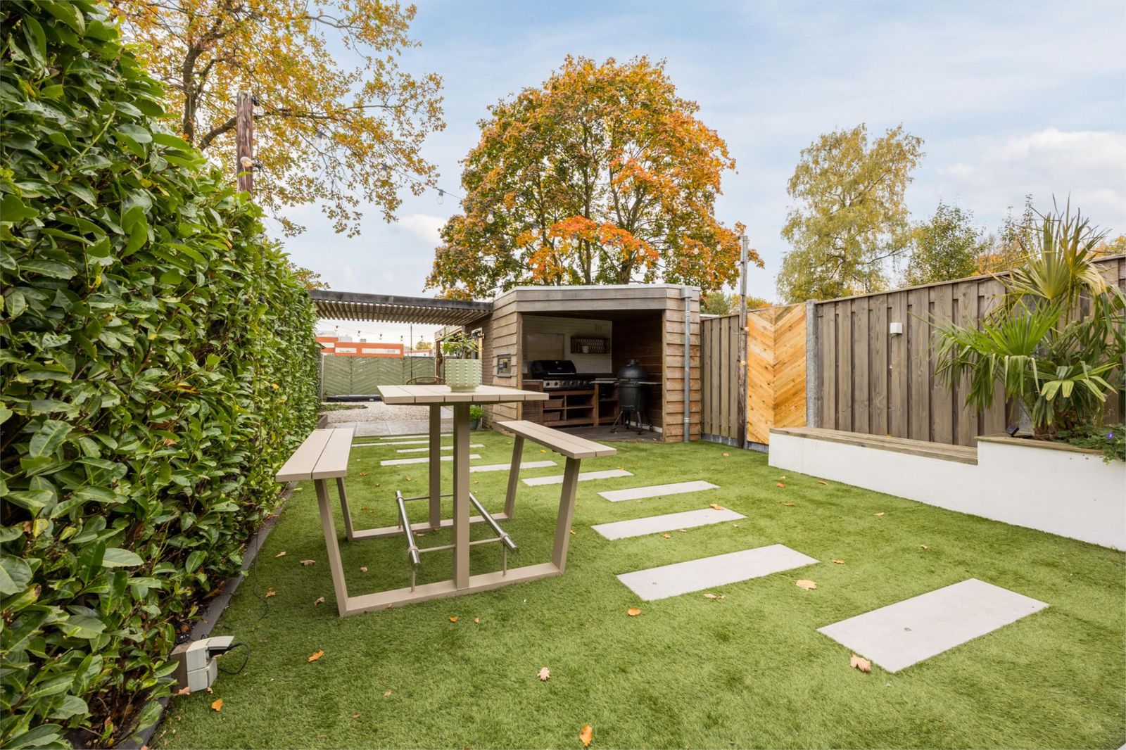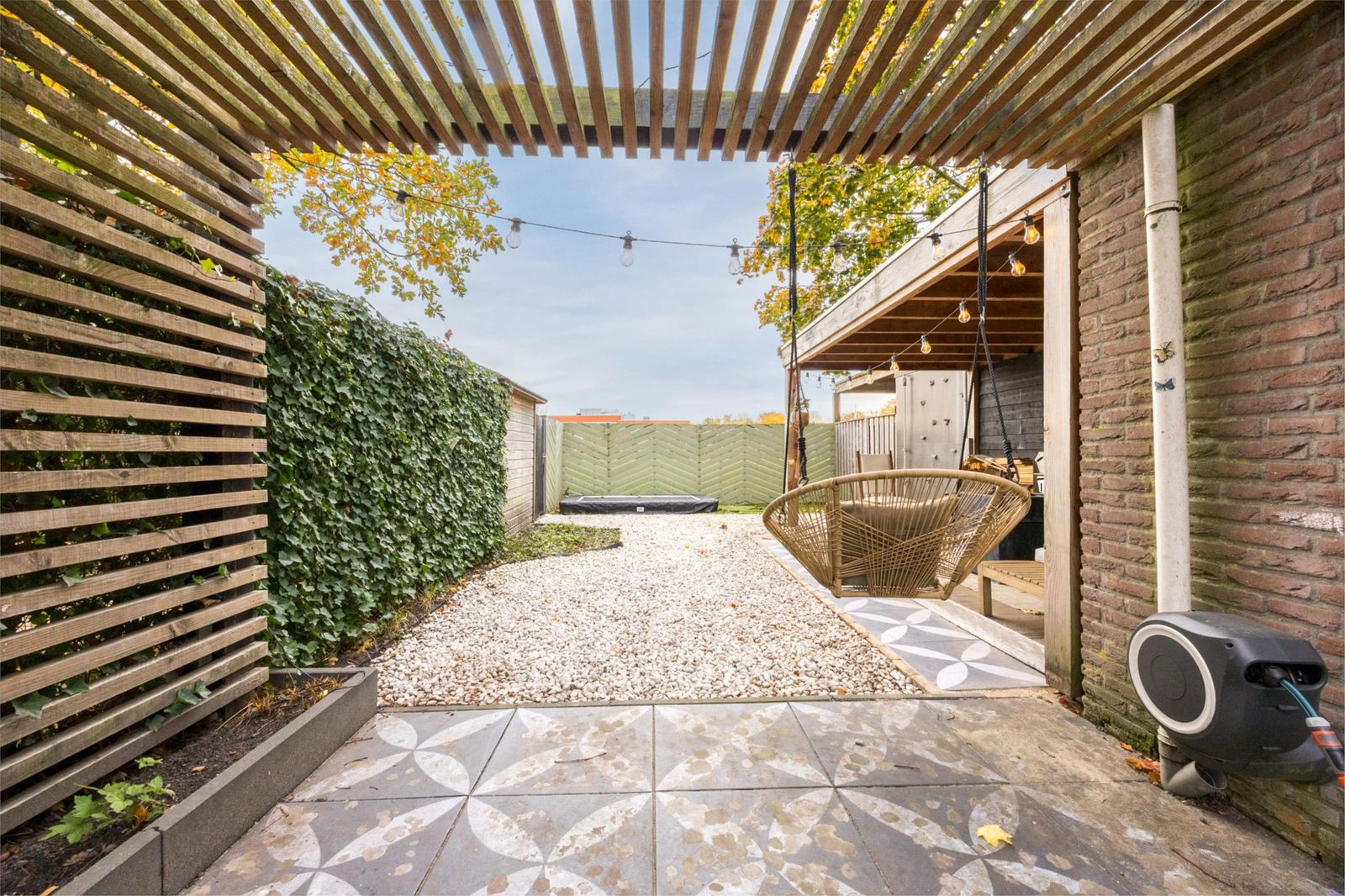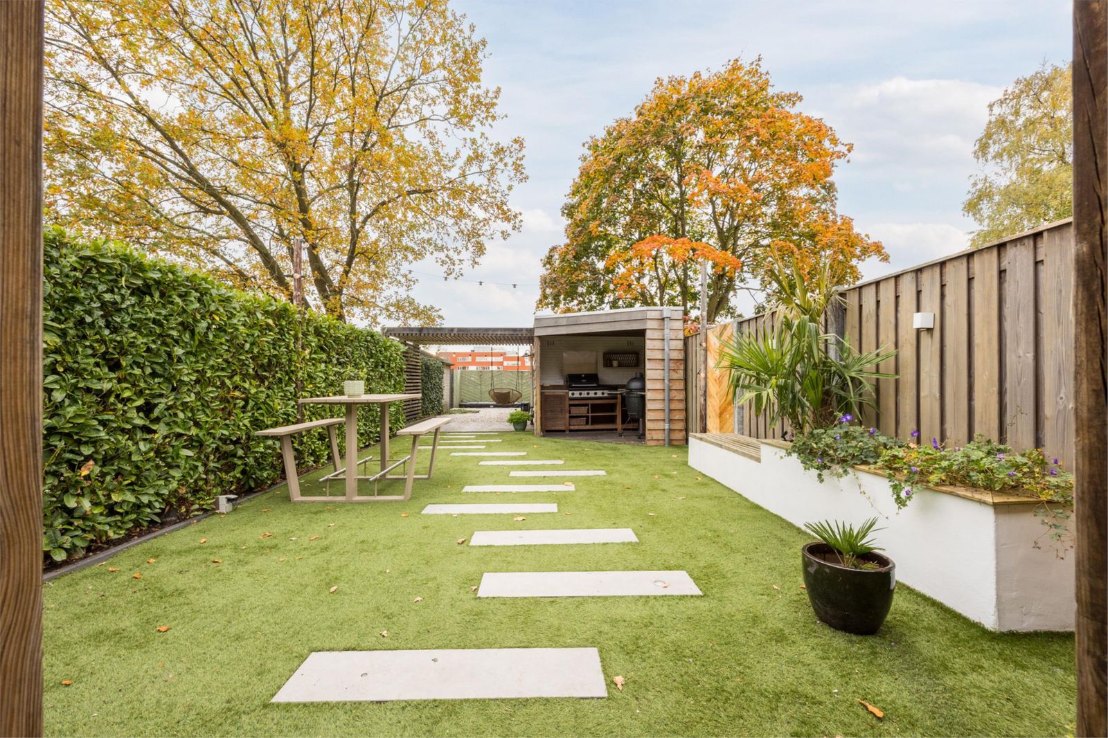 Ook buiten is het volop genieten. De achtertuin ligt op het zuiden en heeft met een diepte van circa 24 meter verrassend veel ruimte.