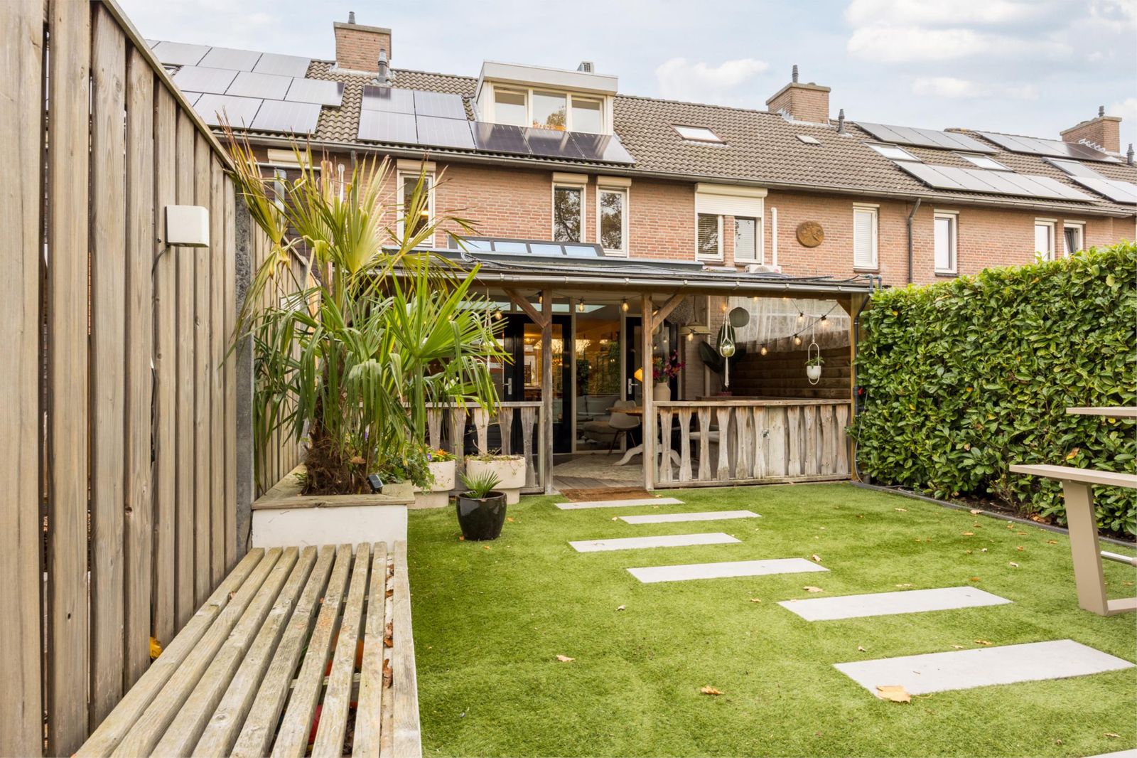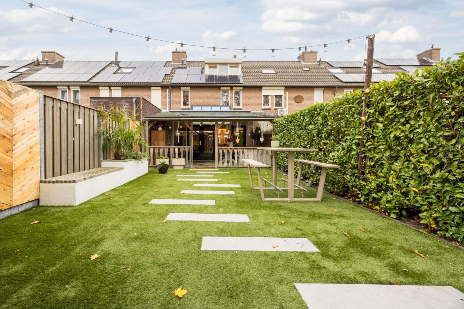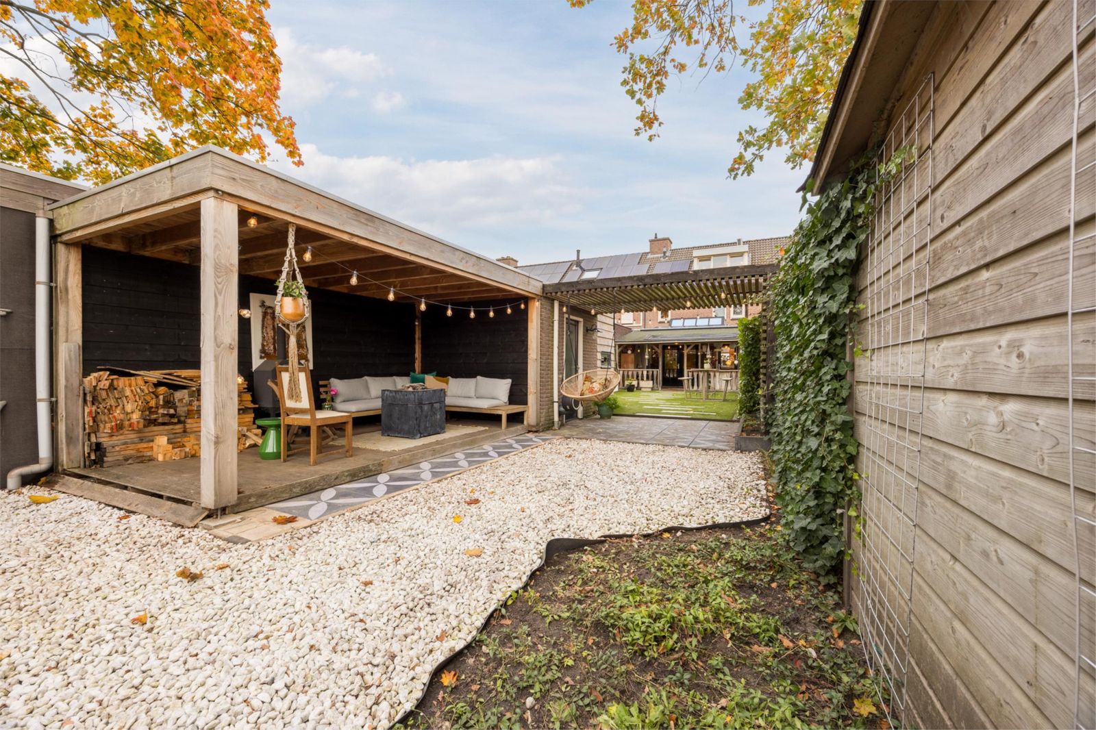 Ook buiten is het volop genieten. De achtertuin ligt op het zuiden en heeft met een diepte van circa 24 meter verrassend veel ruimte.