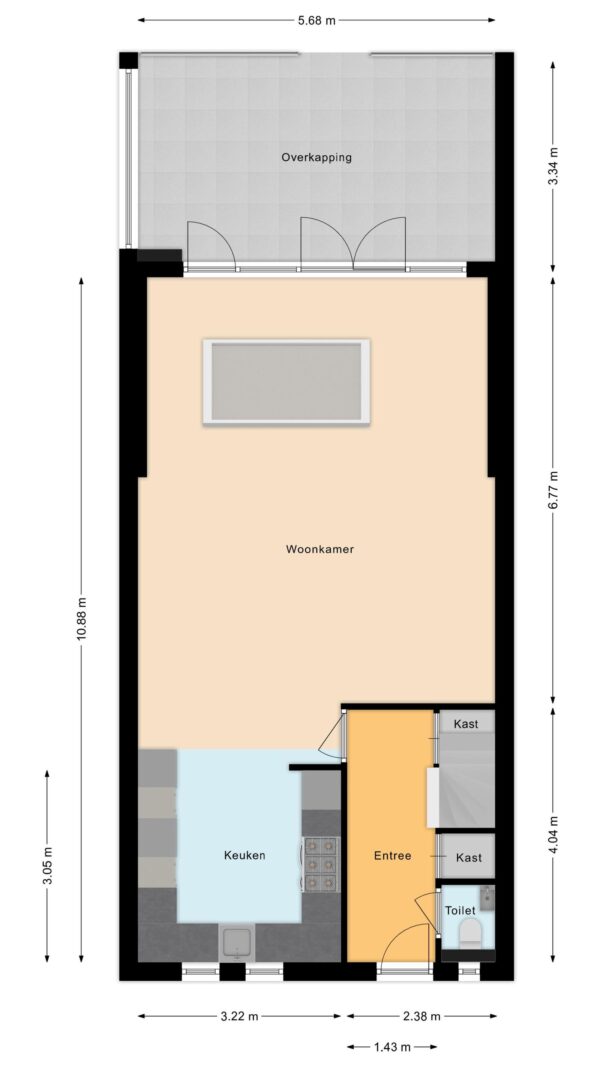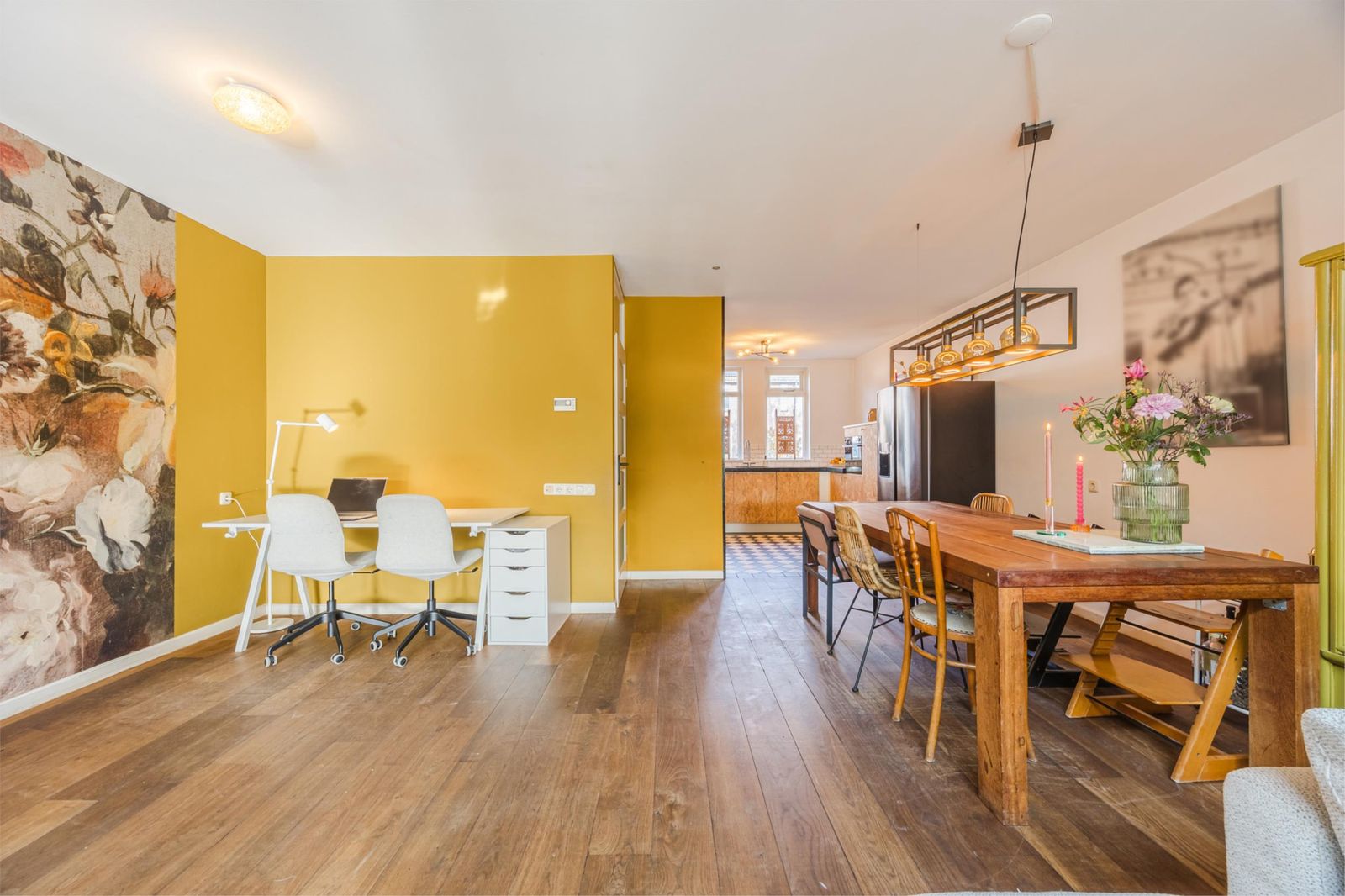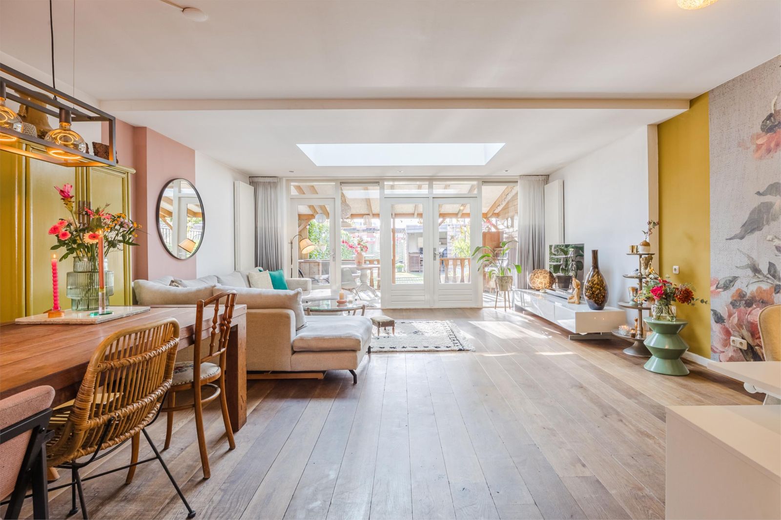 De woonkamer biedt volop ruimte voor zowel een comfortabele zithoek als een grote eethoek waar je met familie en vrienden uitgebreid kunt tafelen. Via de openslaande deuren stap je zo de zonnige achtertuin in, waardoor binnen en buiten mooi in elkaar overlopen.