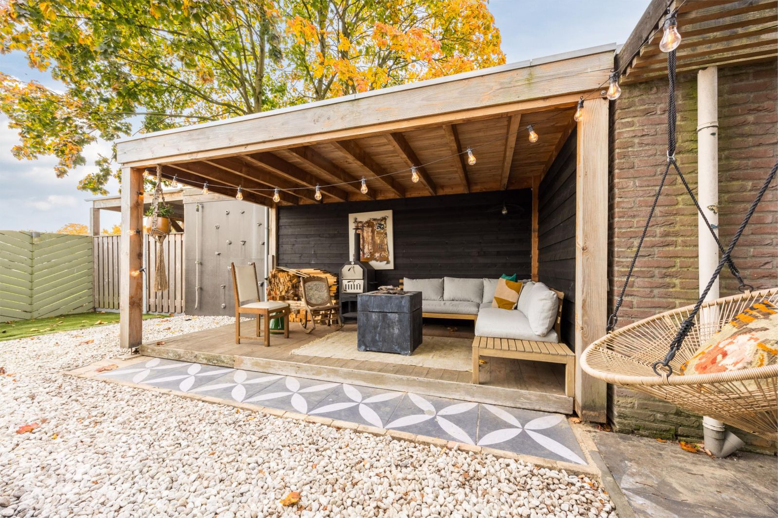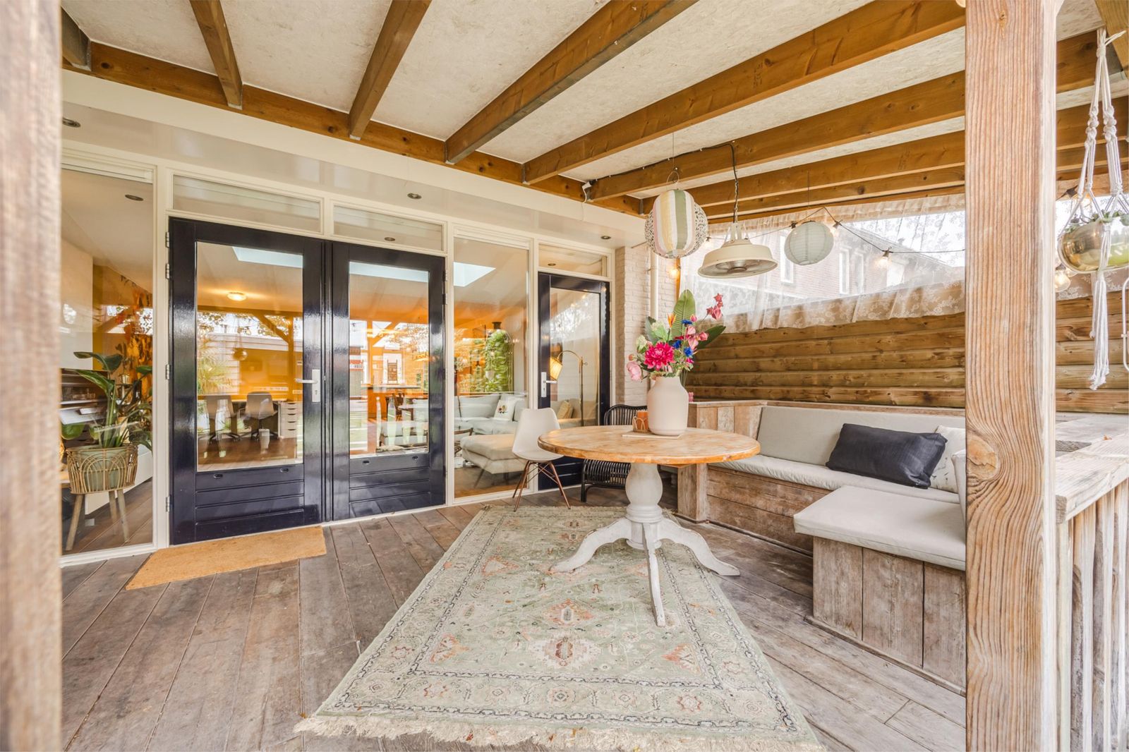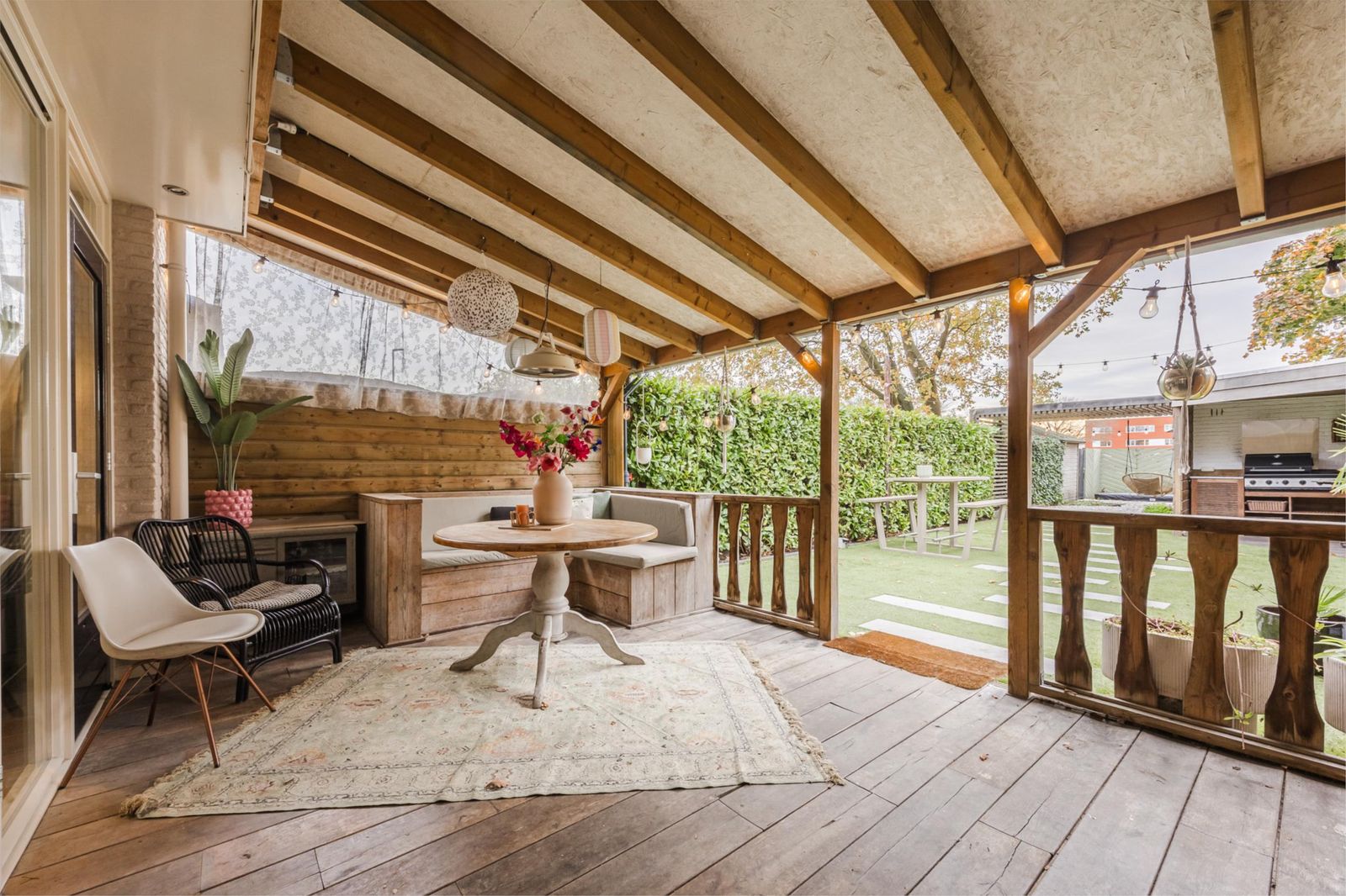 Direct aan de woning bevindt zich een sfeervolle veranda waar je heerlijk kunt ontspannen. Achter in de tuin staat een extra overkapping die perfect is als loungeplek of praktische bergruimte.