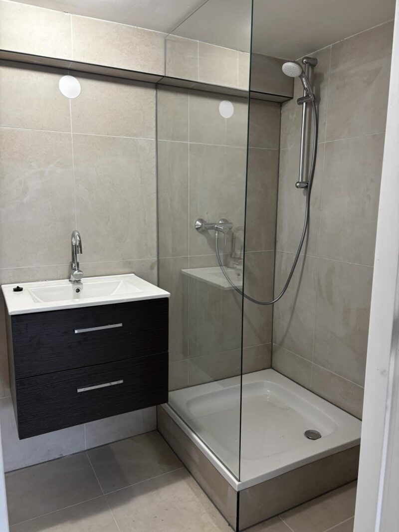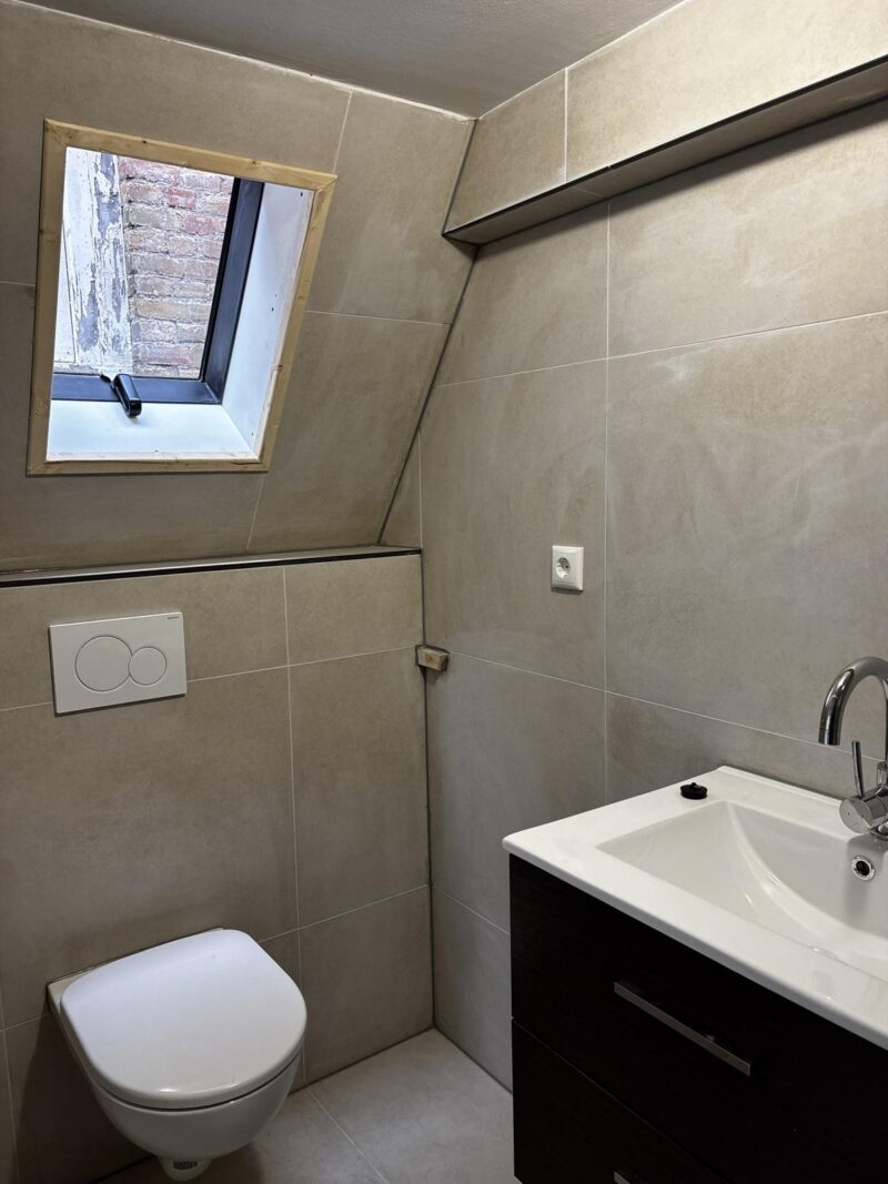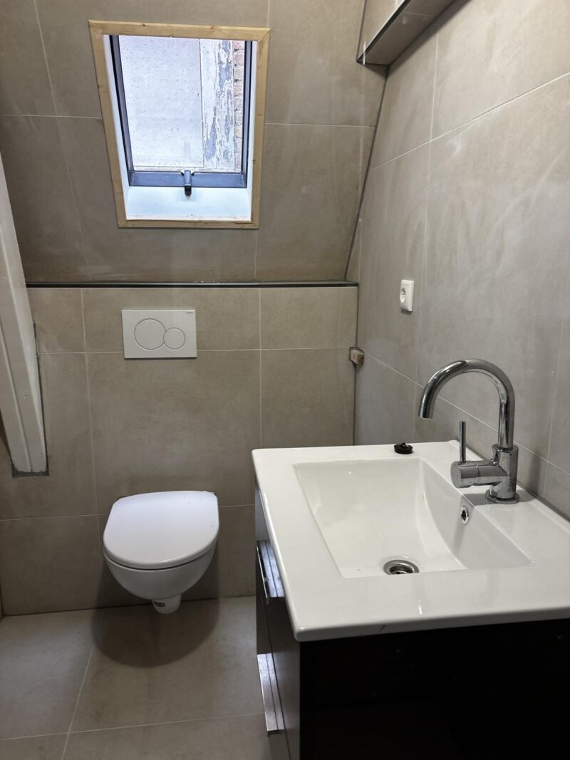- Badkamer: De moderne badkamer is voorzien van vloerverwarming, een toilet, een douche en een wastafel.