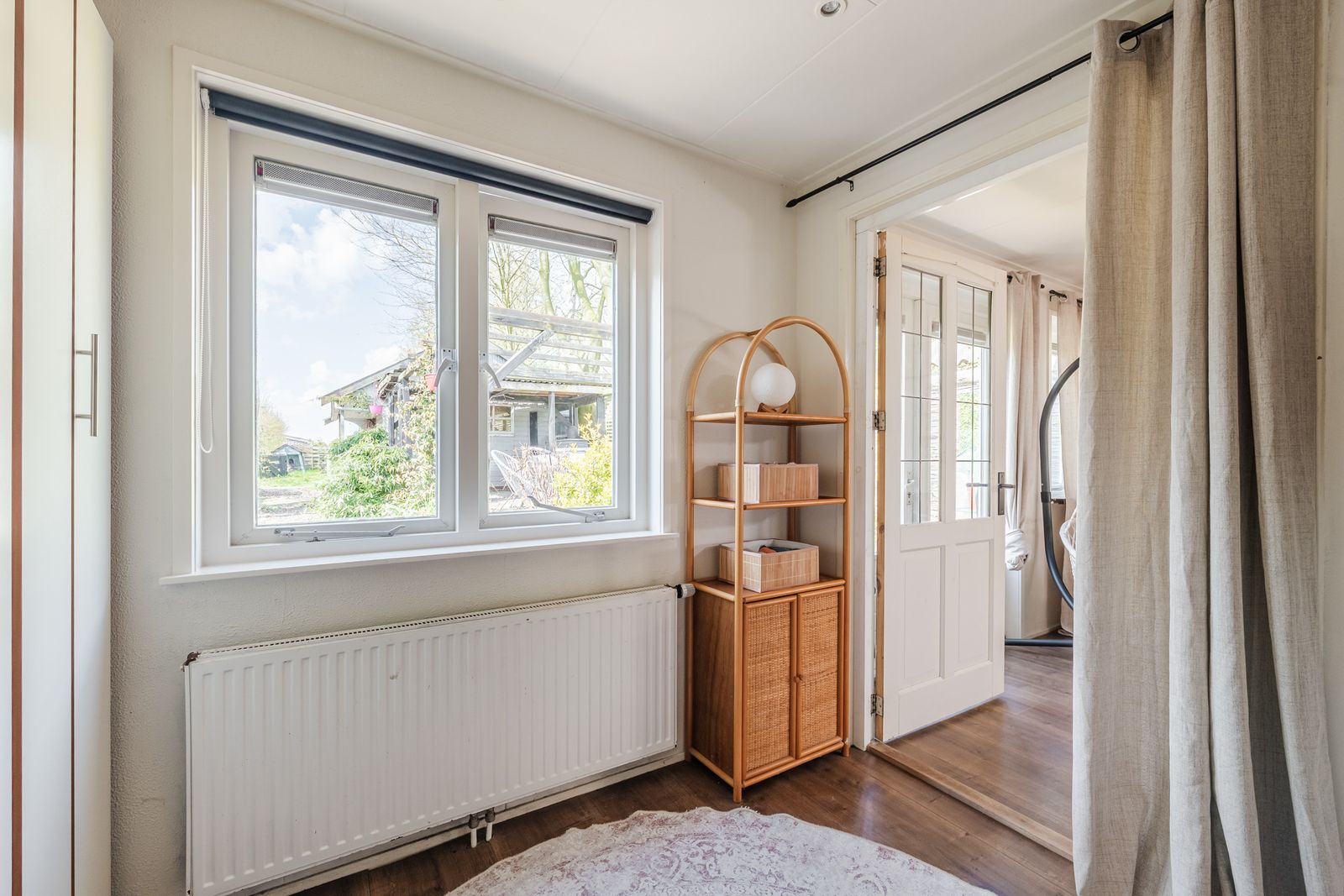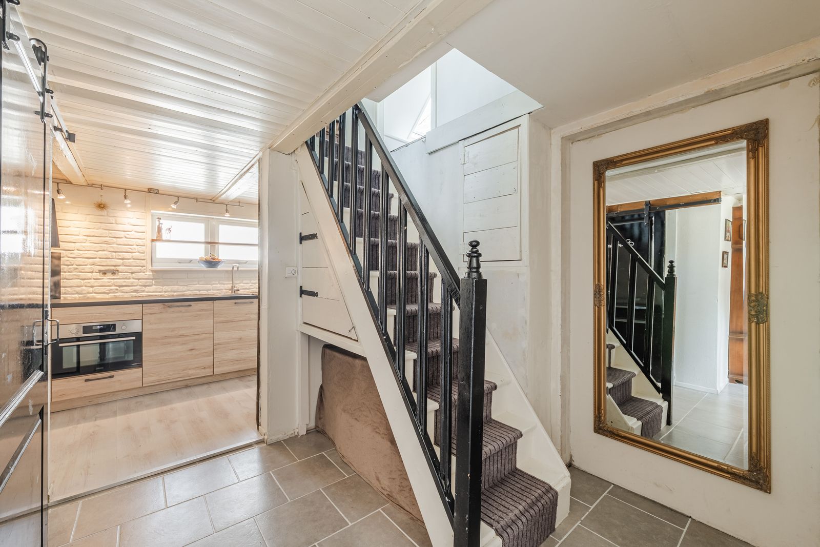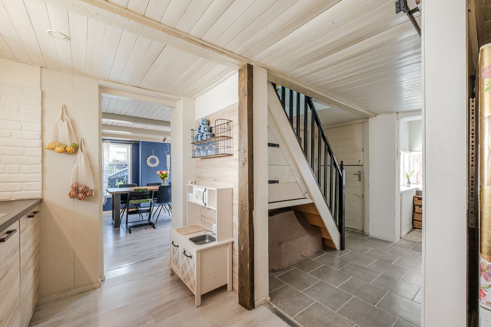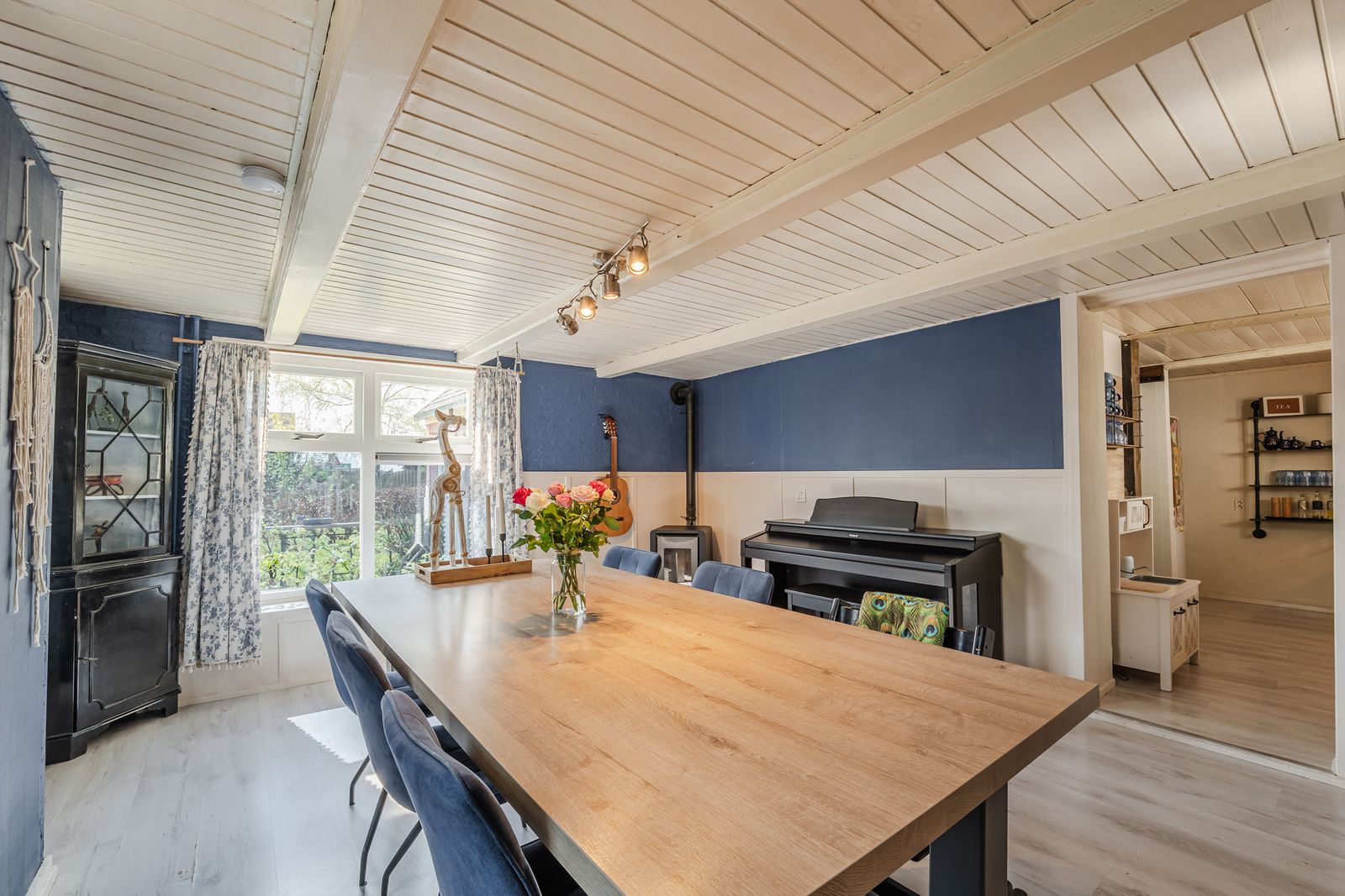 Bij binnenkomst via de zij-entree loop u via de hal vernieuwde keuken in, compleet met moderne keukenapparatuur. Aan de voorzijde van de woning vindt u een sfeervolle eetkamer met balkenplafond en laminaatvloer, perfect voor gezellige avonden met familie en vrienden. Vanuit de centrale hal is de badkamer bereikbaar, en biedt alle benodigde voorzieningen, waaronder een toilet, wastafelmeubel en douche. De wasmachineaansluiting en de cv-installatie bevinden zich in een afgesloten ruimte.