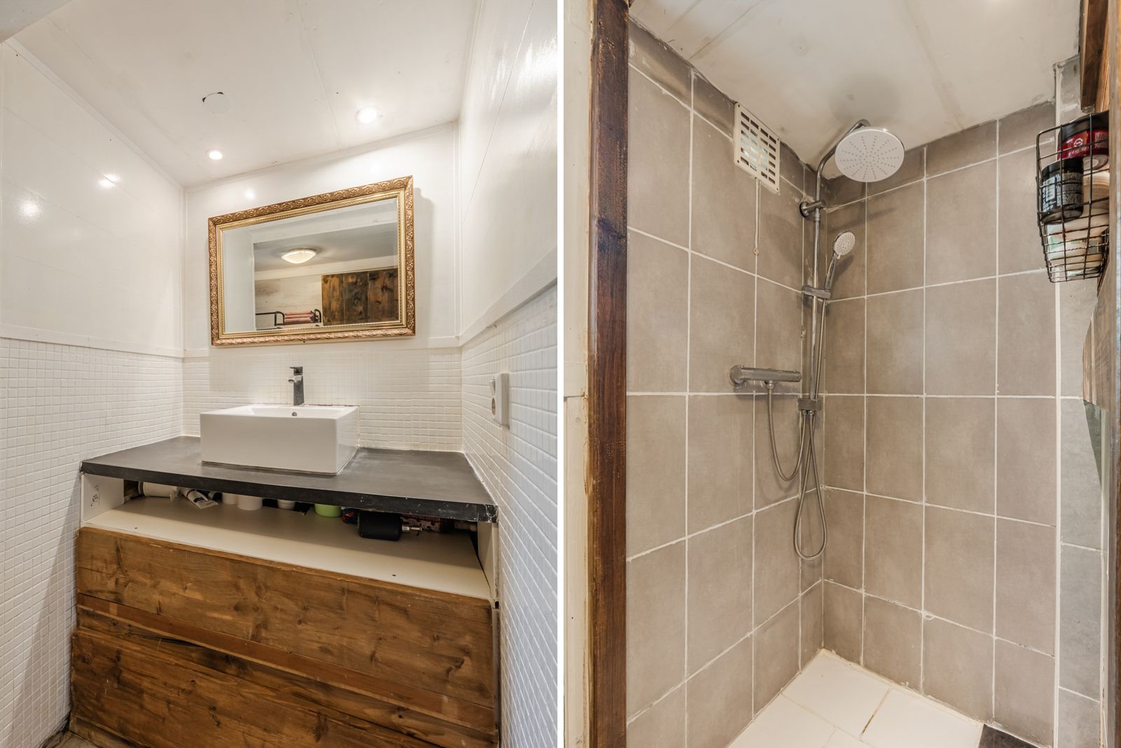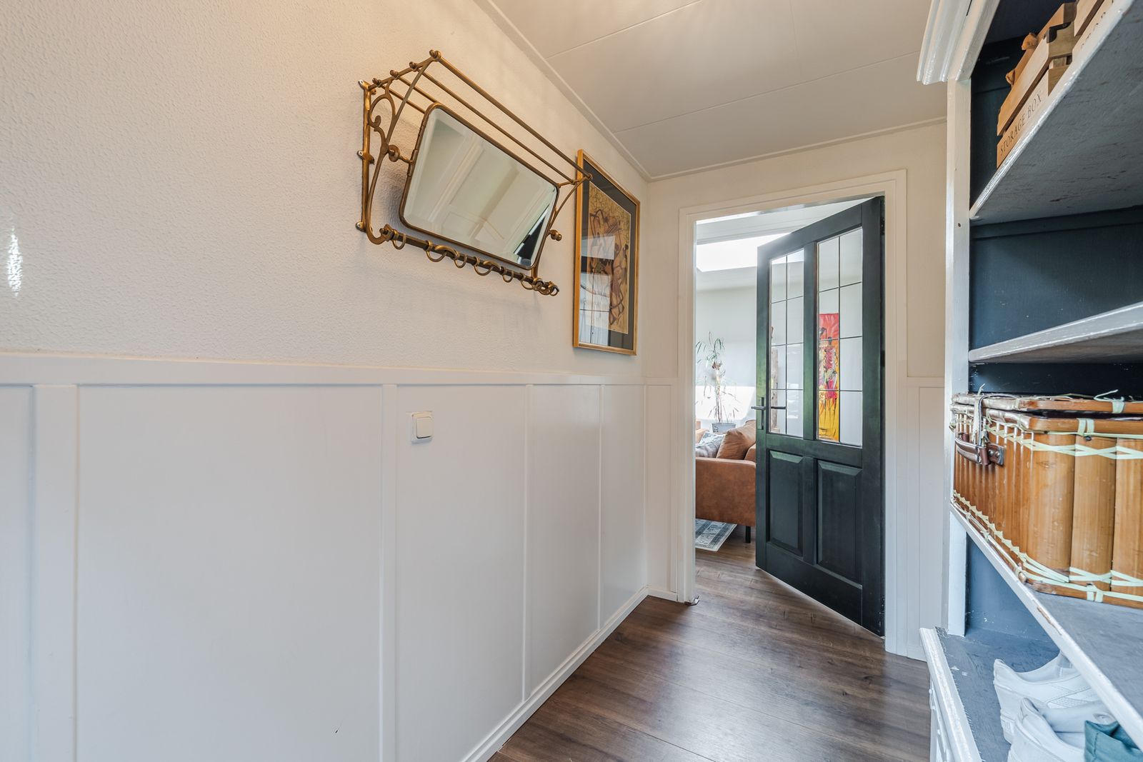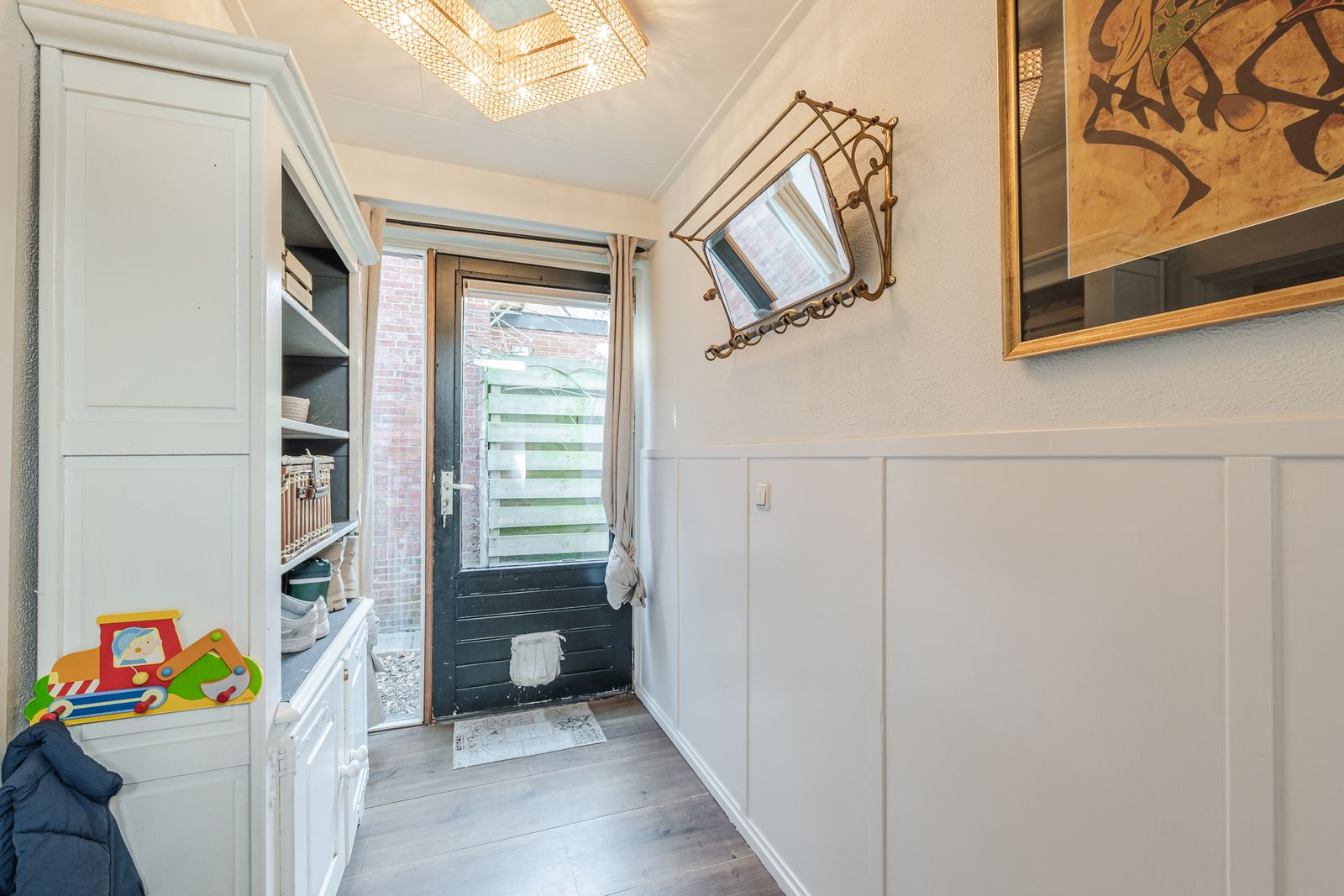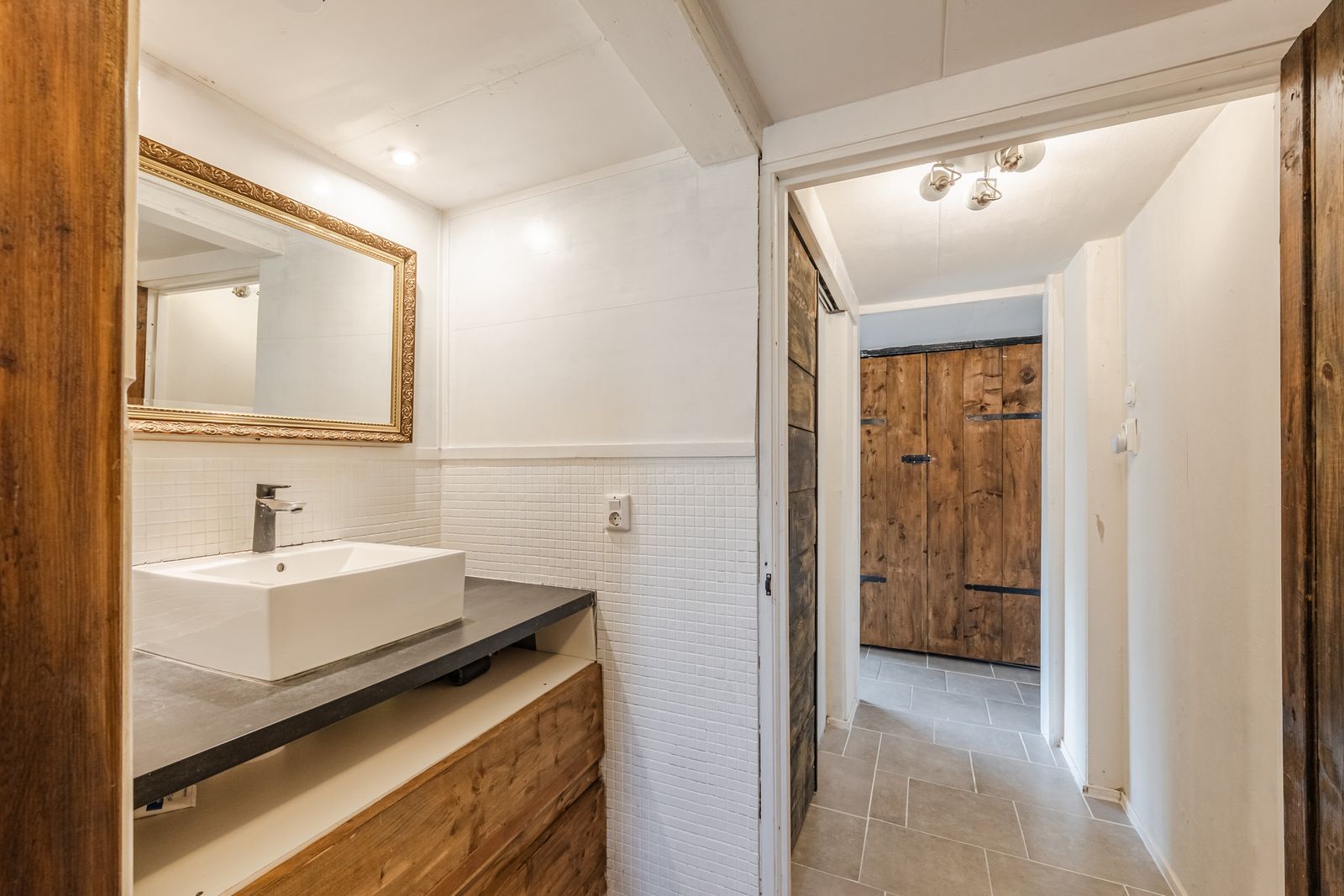Bij binnenkomst via de zij-entree loop u via de hal vernieuwde keuken in, compleet met moderne keukenapparatuur. Aan de voorzijde van de woning vindt u een sfeervolle eetkamer met balkenplafond en laminaatvloer, perfect voor gezellige avonden met familie en vrienden. Vanuit de centrale hal is de badkamer bereikbaar, en biedt alle benodigde voorzieningen, waaronder een toilet, wastafelmeubel en douche. De wasmachineaansluiting en de cv-installatie bevinden zich in een afgesloten ruimte.