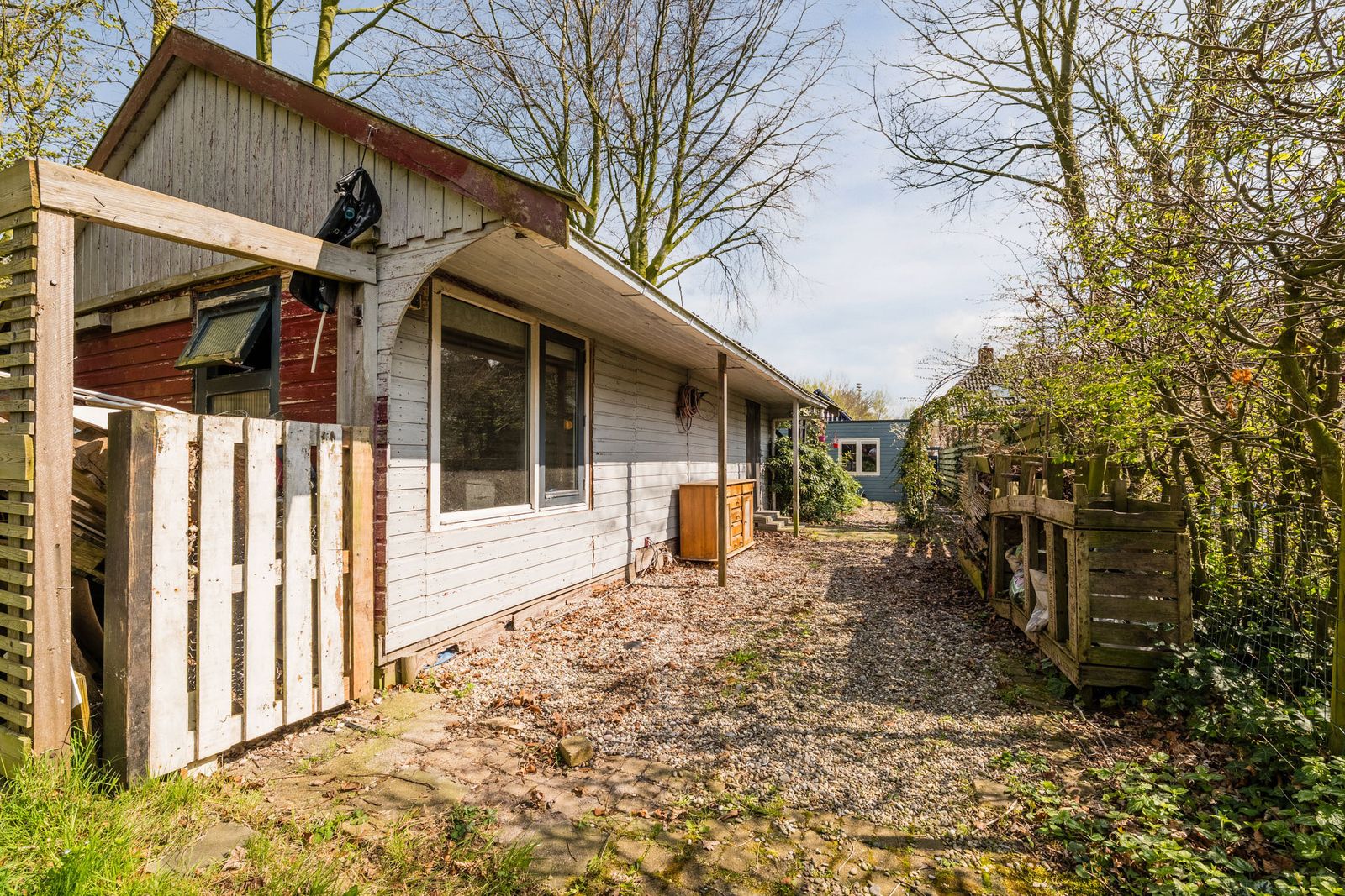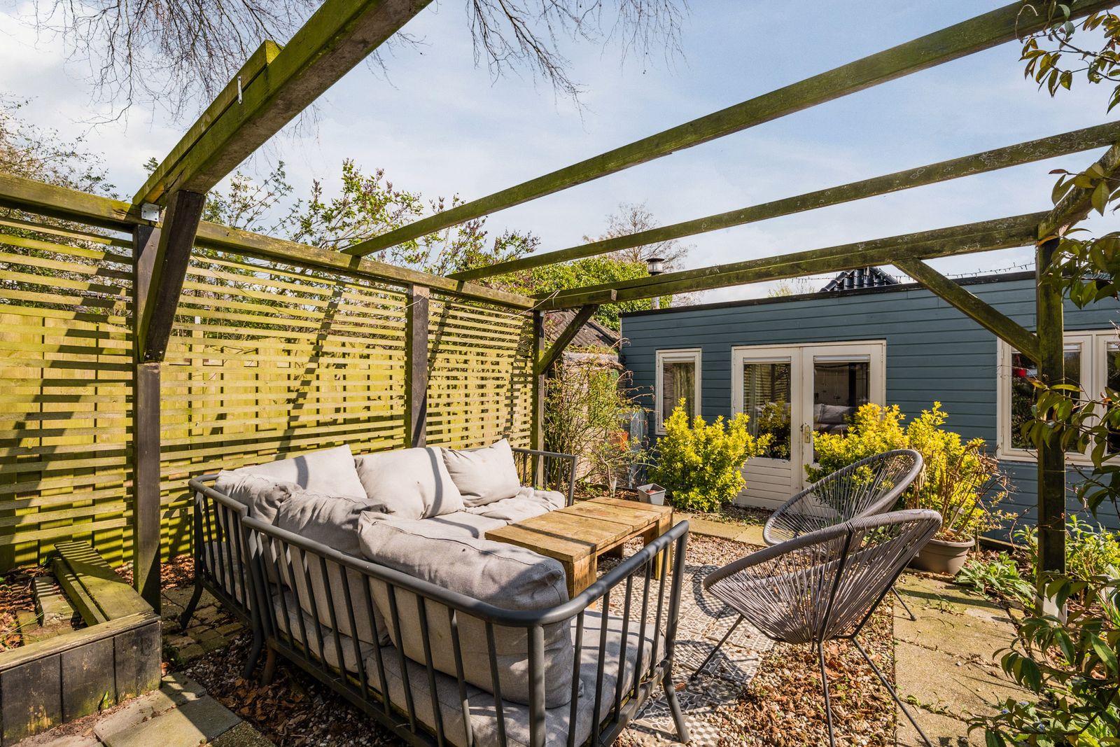 + Een handige vrijstaande houten tuinschuur biedt extra opslagruimte of een hobbyruimte.