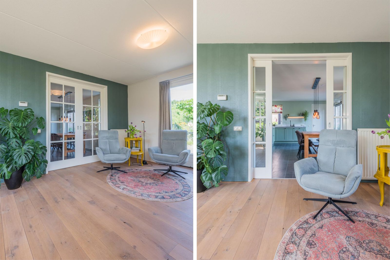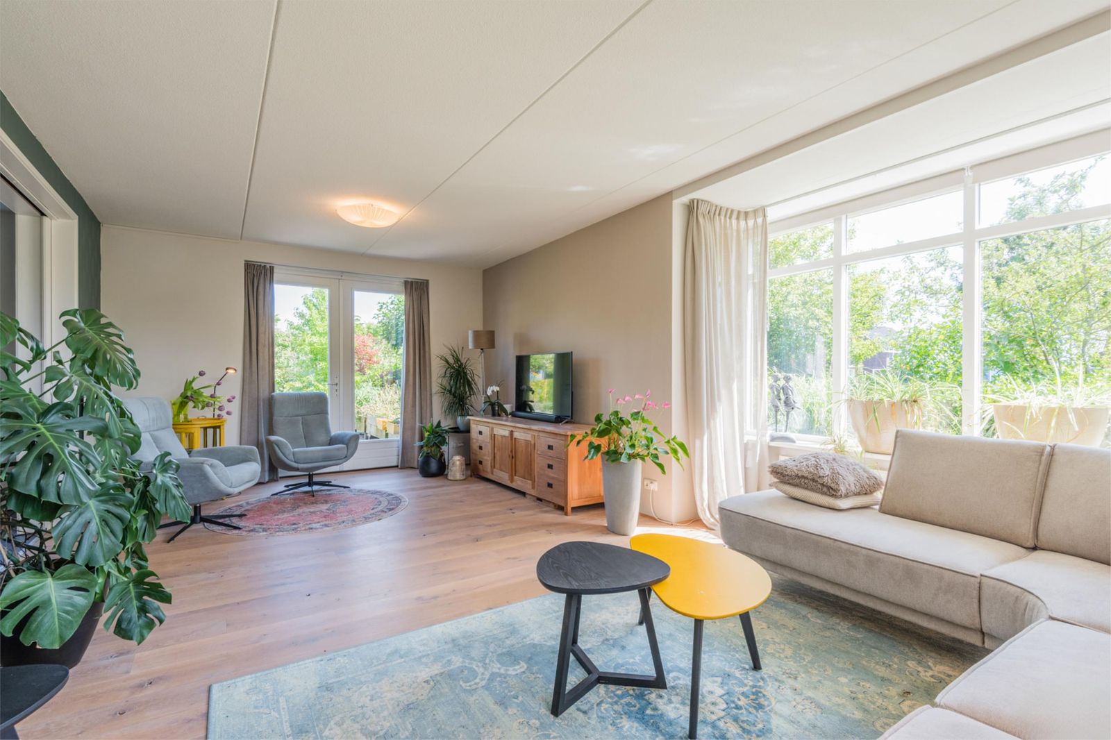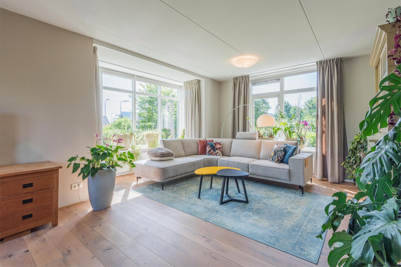 Ruime woonkamer: Geniet van de lichte en ruime woonkamer met grote ramen die zorgen voor veel natuurlijk licht door erker en openslaande deuren. In de kamer ligt een mooie houten vloer.