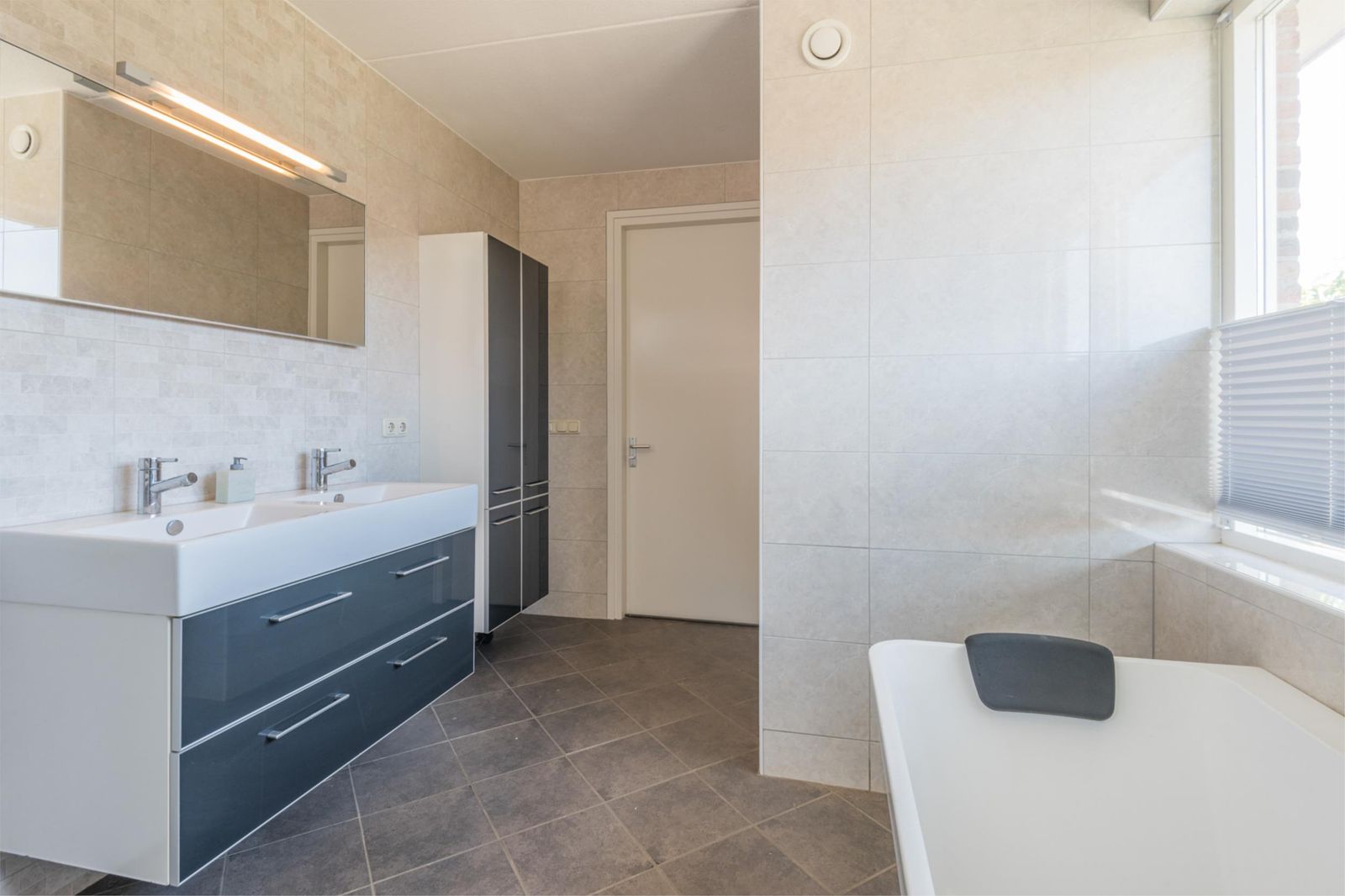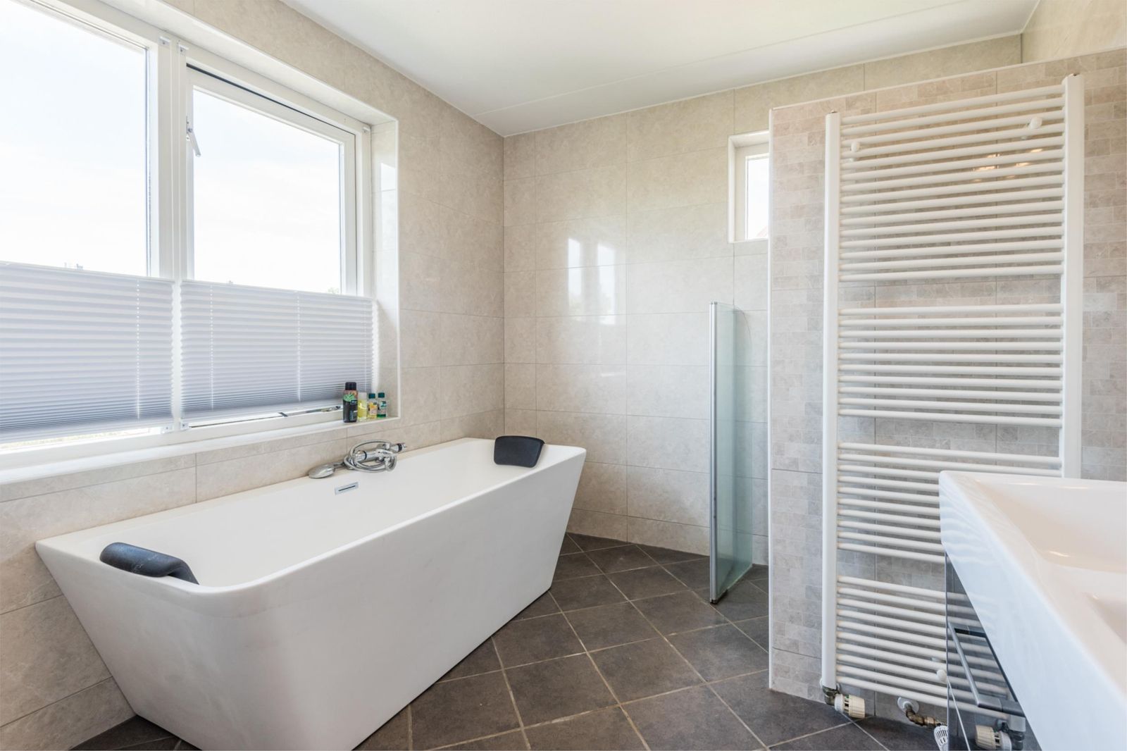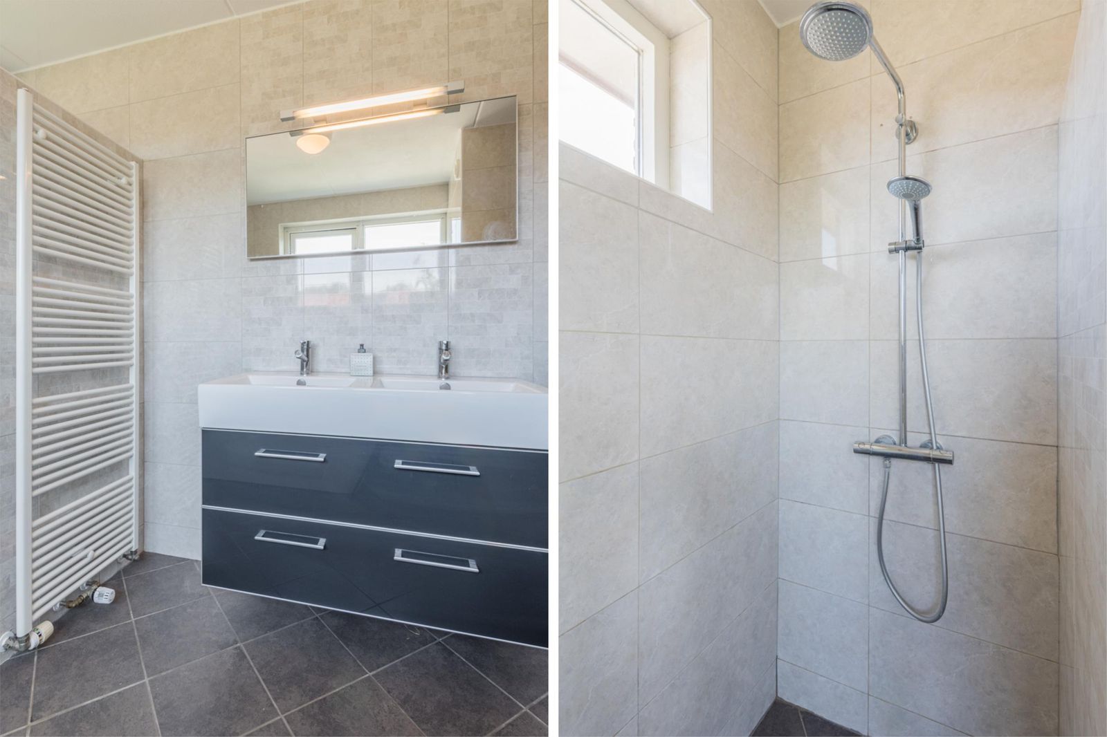 Badkamer: Een moderne luxe en ruime badkamer met een inloopdouche, nieuw groot bad en een ruime dubbele wastafel met veel opbergruimte.