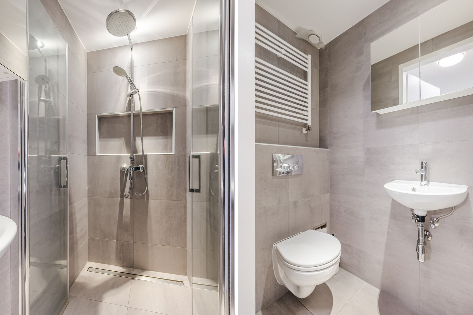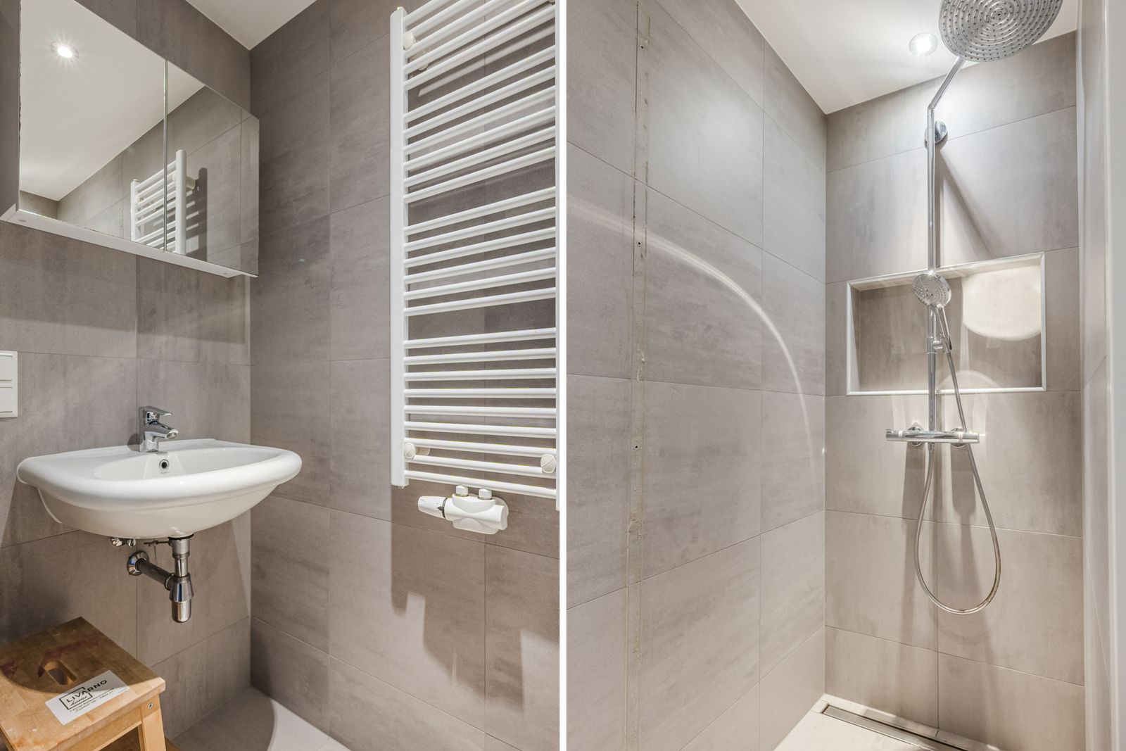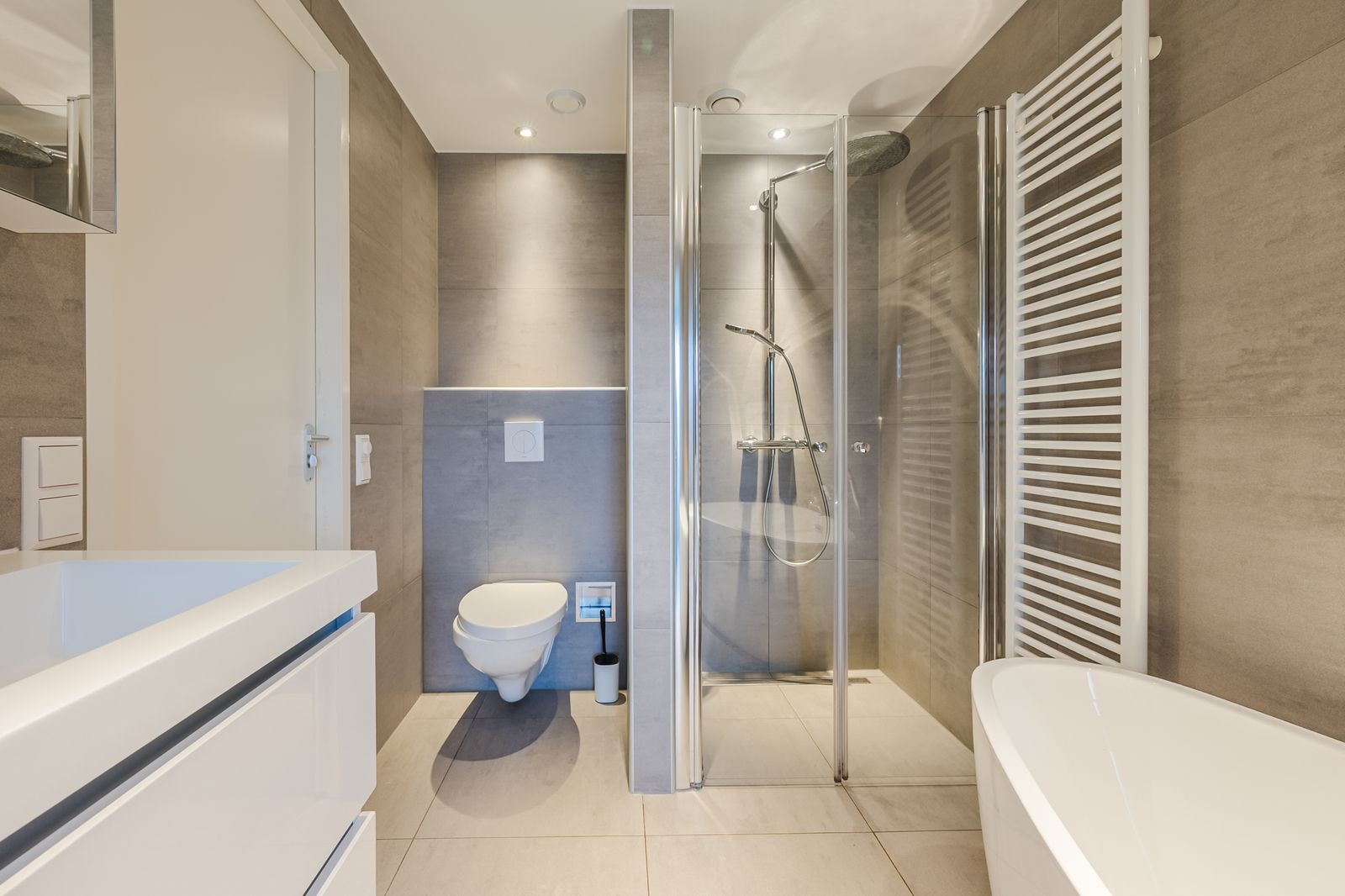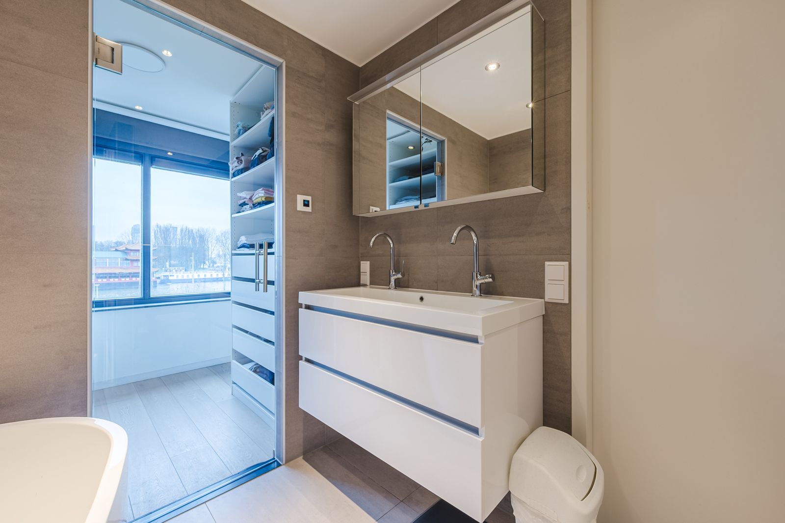 In totaal drie badkamers, elk met een inloopdouche en vloerverwarming. De hoofdbadkamer beschikt daarnaast over een ligbad, dubbele wastafel en kastjes achter de spiegels.