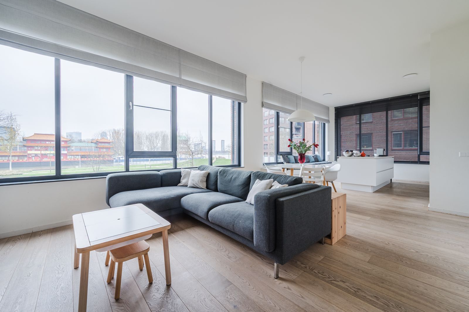 Lichte woonkamer en moderne keuken over de volle verdieping. Dankzij de plafondhoogte van 3,2 meter voelt deze ruimte extra ruimtelijk en luxe. Geniet van het panoramische uitzicht op de Euromast, Parkhaven en Nieuwe Maas. Screens zorgen voor comfort op zonnige dagen. De trap is slim langs de achterwand geplaatst, waardoor de indeling praktisch en ruimtelijk is. De renovatie onder architectuur uit 2017 geeft de woning een moderne, stijlvolle uitstraling.