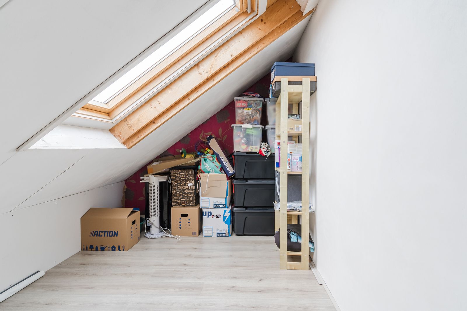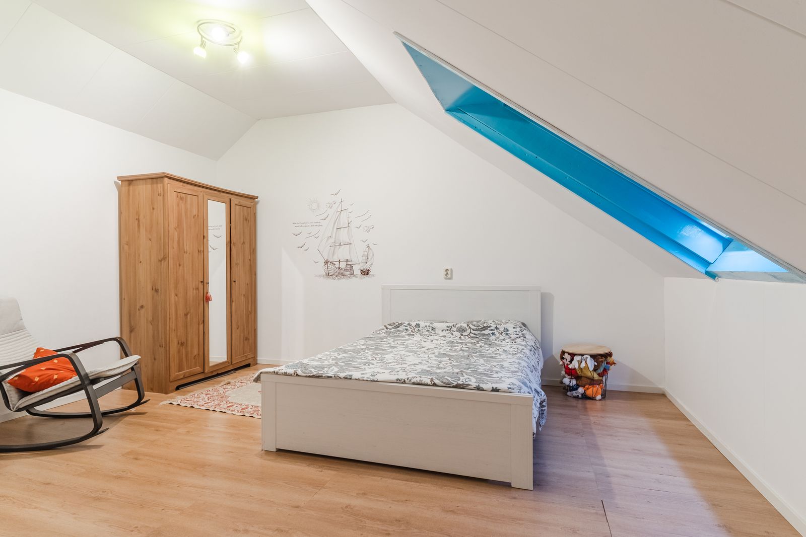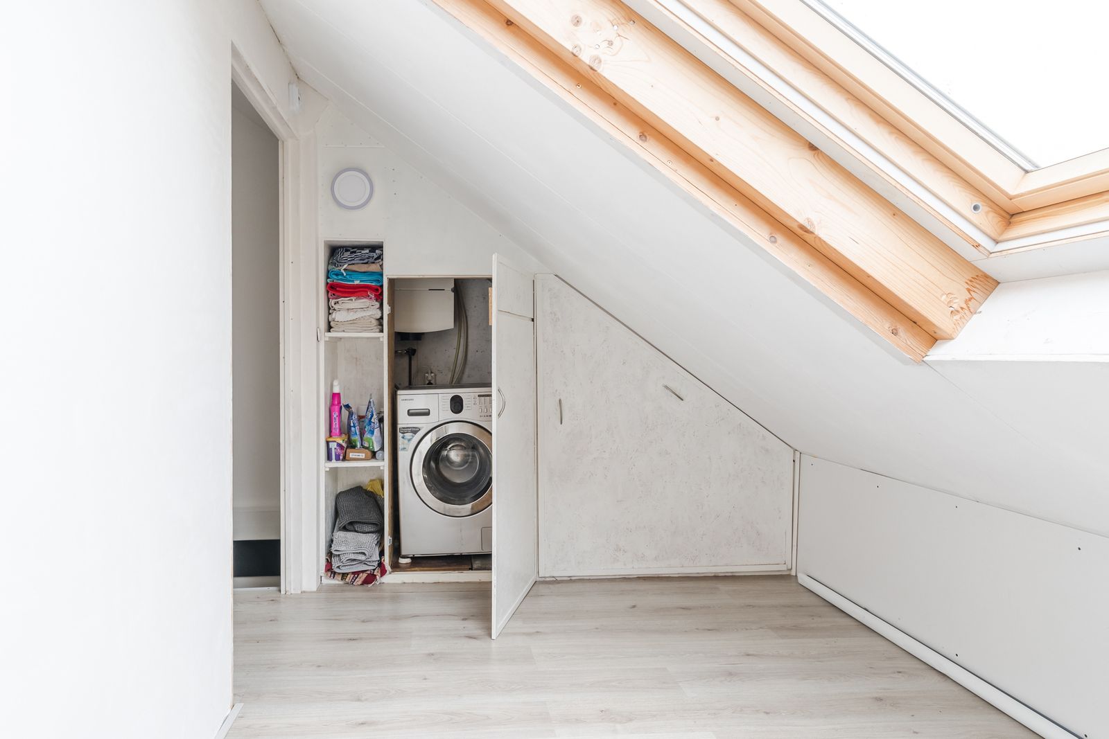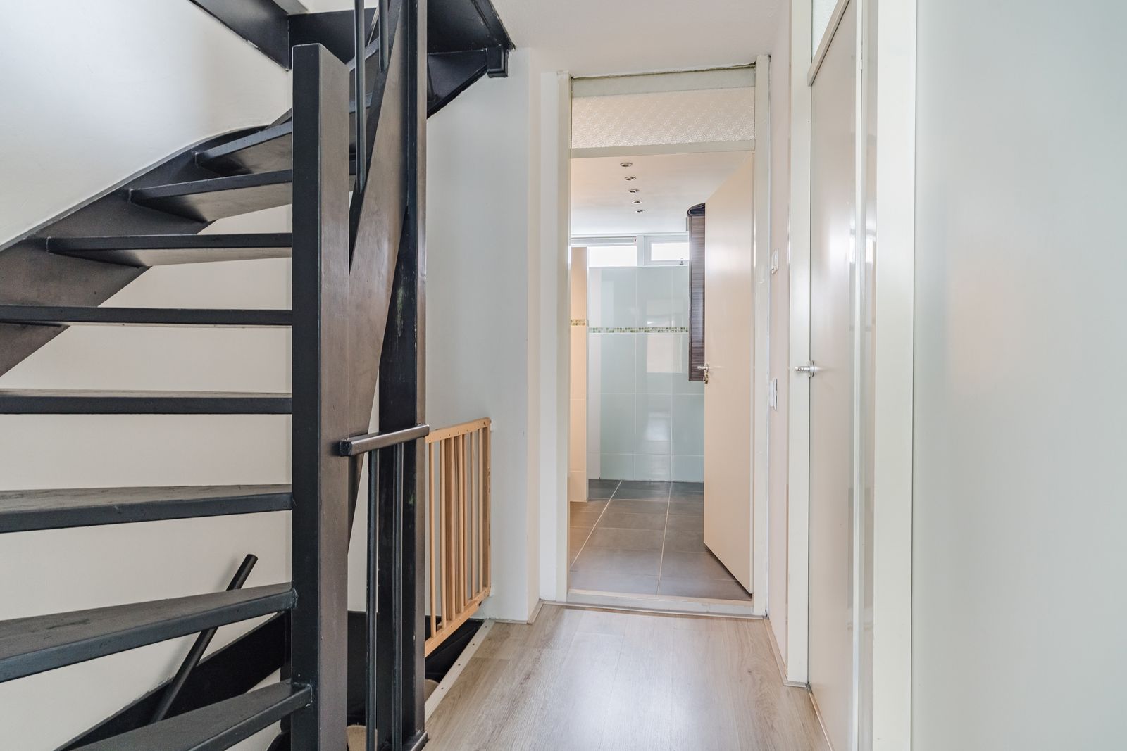 Tweede verdieping: Overloop met toegang tot een praktische kamer met kast voor de cv-opstelling en wasmachineaansluiting. Daarnaast vind je hier een verrassend ruime vijfde slaapkamer aan de voorzijde, perfect als master bedroom, werkruimte of chillkamer voor tieners.