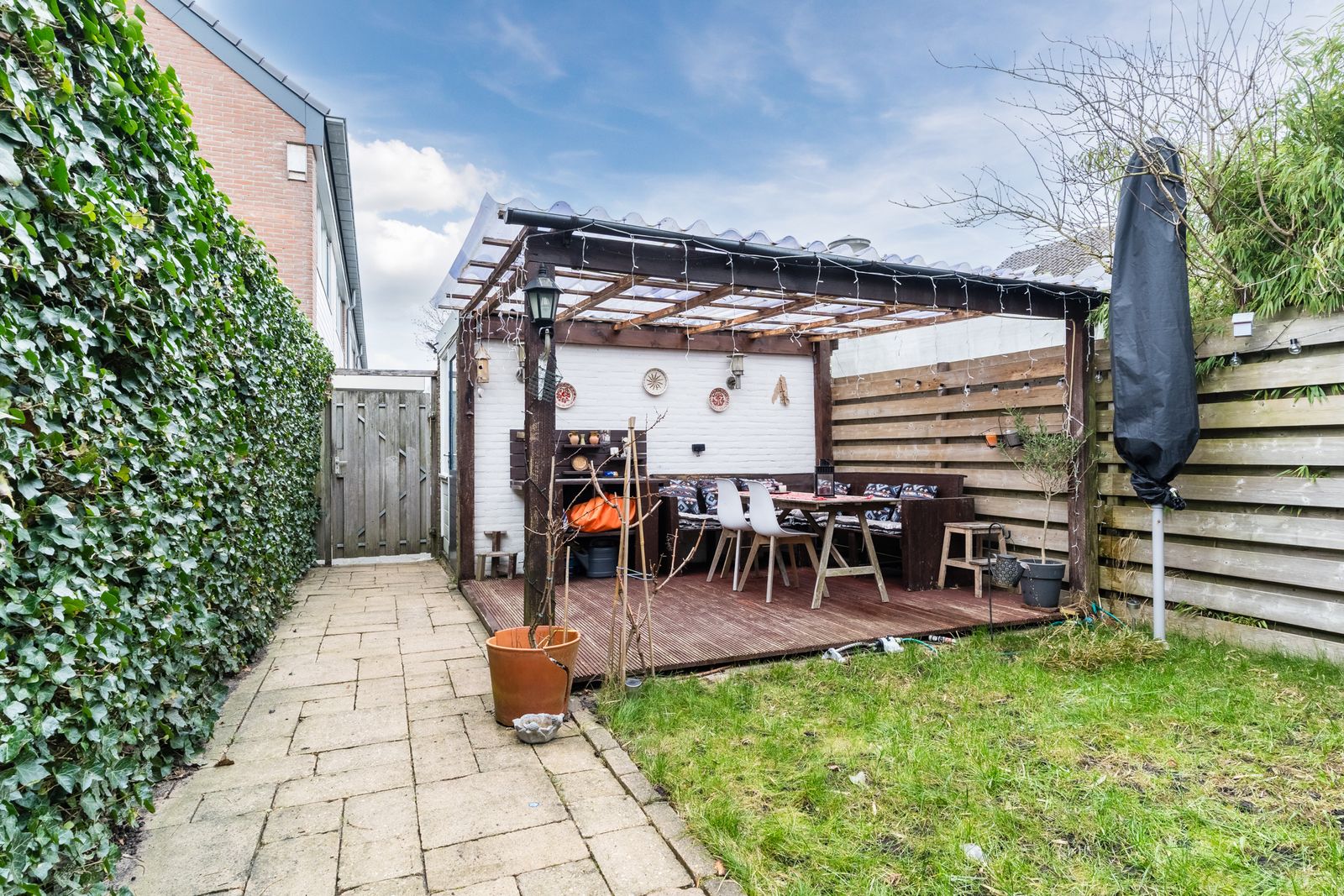 De onderhoudsvriendelijke achtertuin met gezellige overkapping, ligt op het noordwesten, waardoor je in de middag en avond heerlijk van de zon kunt genieten. Achterin staat een stenen berging met elektra en er is een handige achterom, ideaal voor fietsen en spelende kinderen.