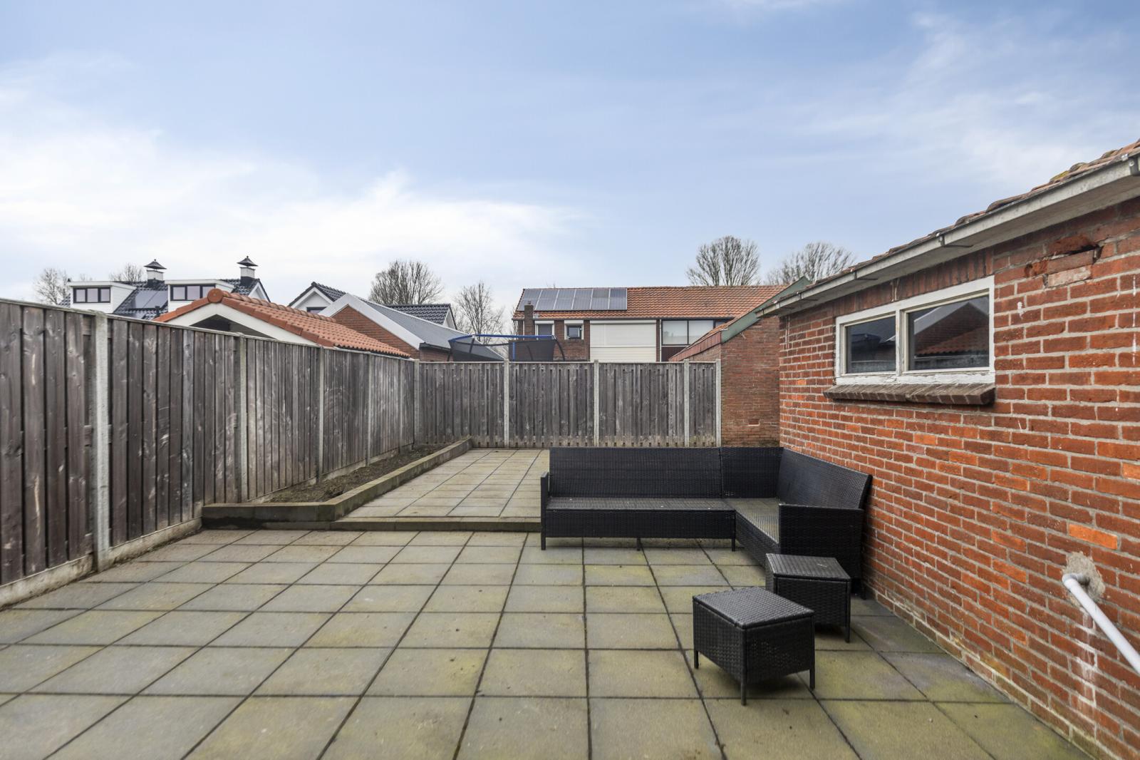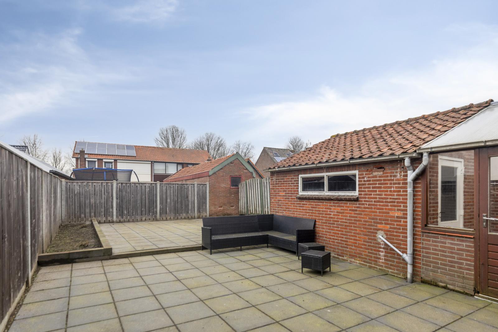 De achtertuin is gelegen op het noordoosten en volledig bestraat, waardoor deze onderhoudsvriendelijk is ingericht. Dankzij de eigen achterom is de tuin ook praktisch in gebruik. Een fijne buitenruimte om in alle rust te zitten of om gezellig buiten te eten.