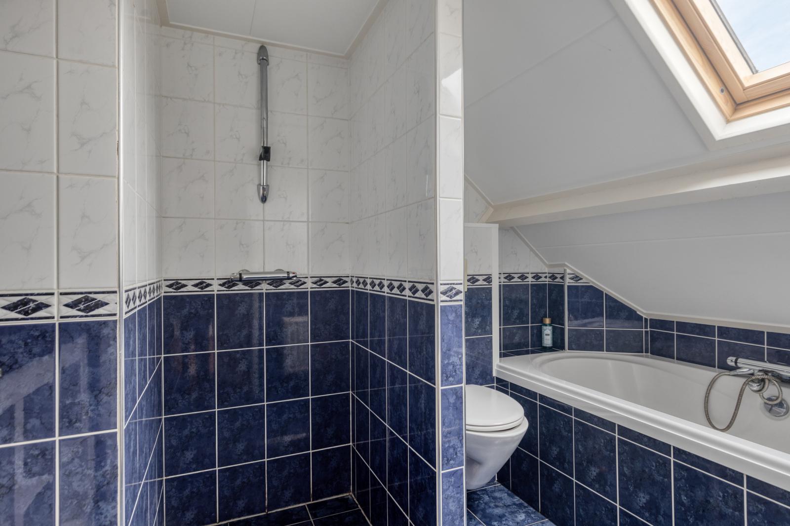 De badkamer is gedateerd maar compleet uitgevoerd met een douche, ligbad, toilet en wastafel.