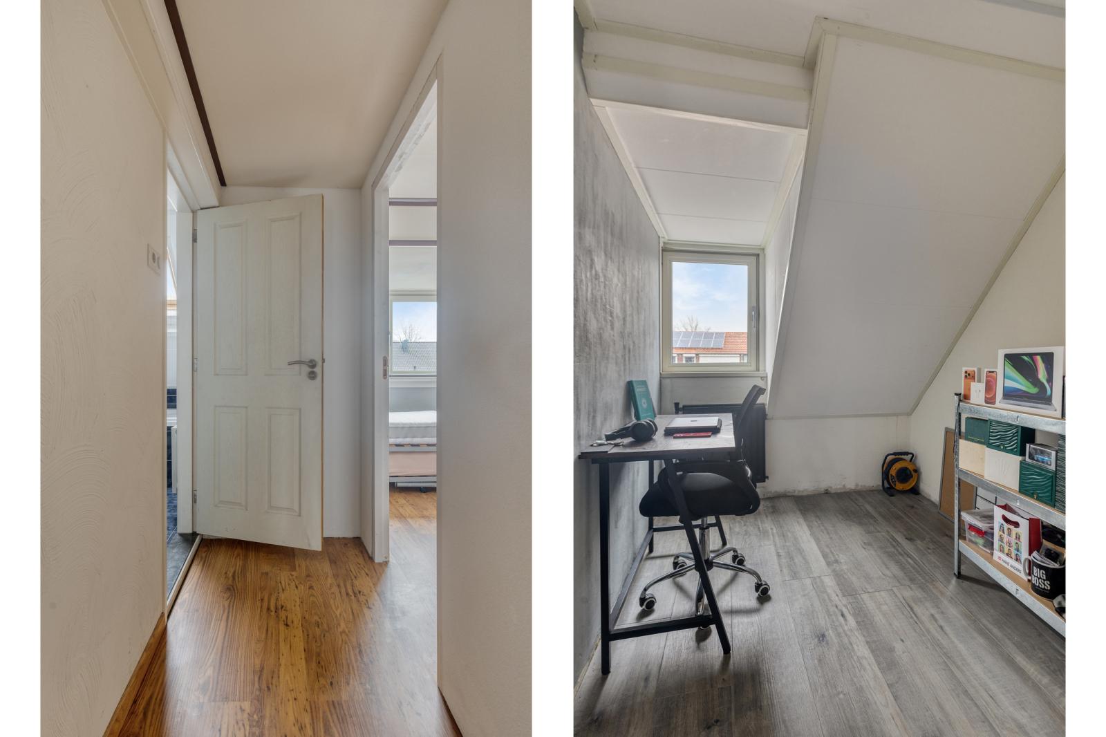 Via de vaste trap bereik je de eerste verdieping. Hier kom je uit op een flinke overloop met ruimte voor een bureau. Er zijn twee slaapkamers. Beide kamers beschikken over een dakkapel en zijn prettig van formaat en goed in te delen.