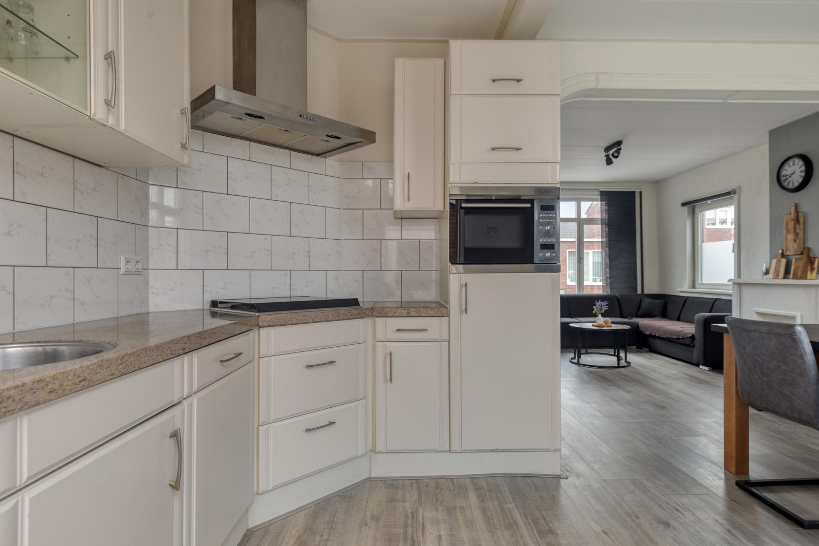 De woonkamer staat in open verbinding met de keuken, wat zorgt voor een open en betrokken leefruimte. De keuken is praktisch ingedeeld en biedt toegang tot de ruime bijkeuken. De bijkeuken beschikt over een wasmachine aansluiting en achterdeur naar de tuin. De inpandig bereikbare berging is ideaal voor voorraad, fietsen of hobbyspullen.
