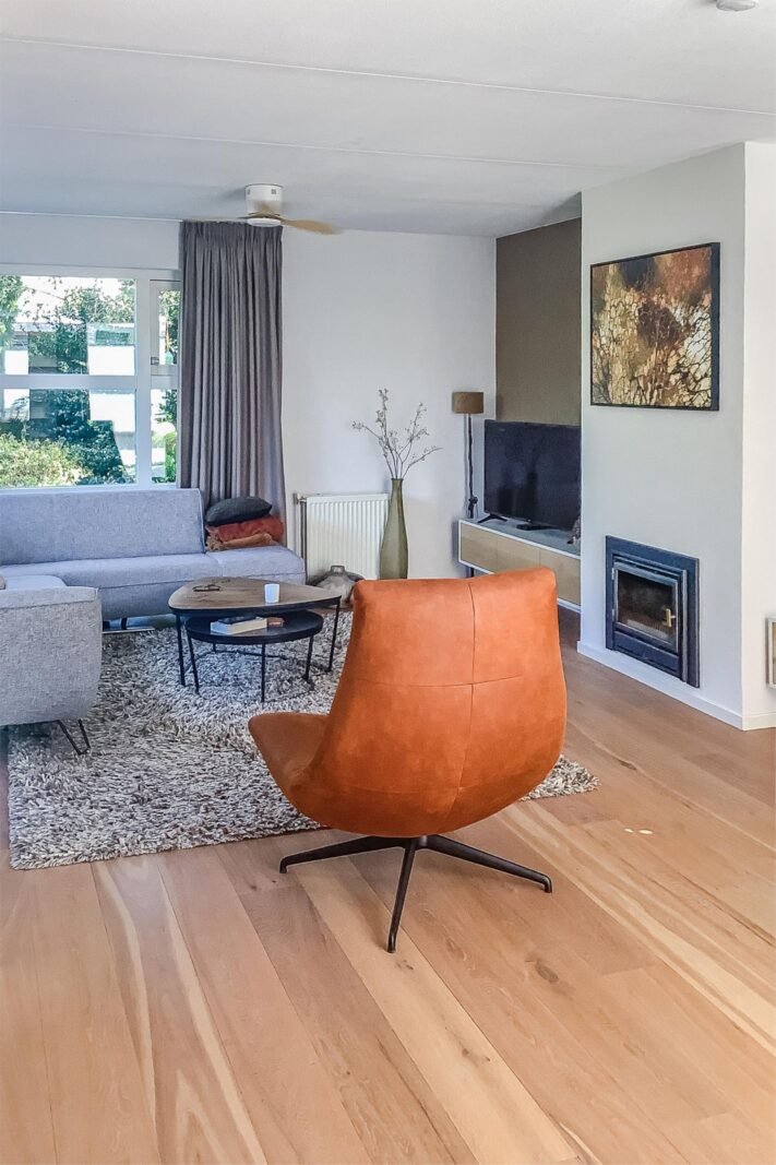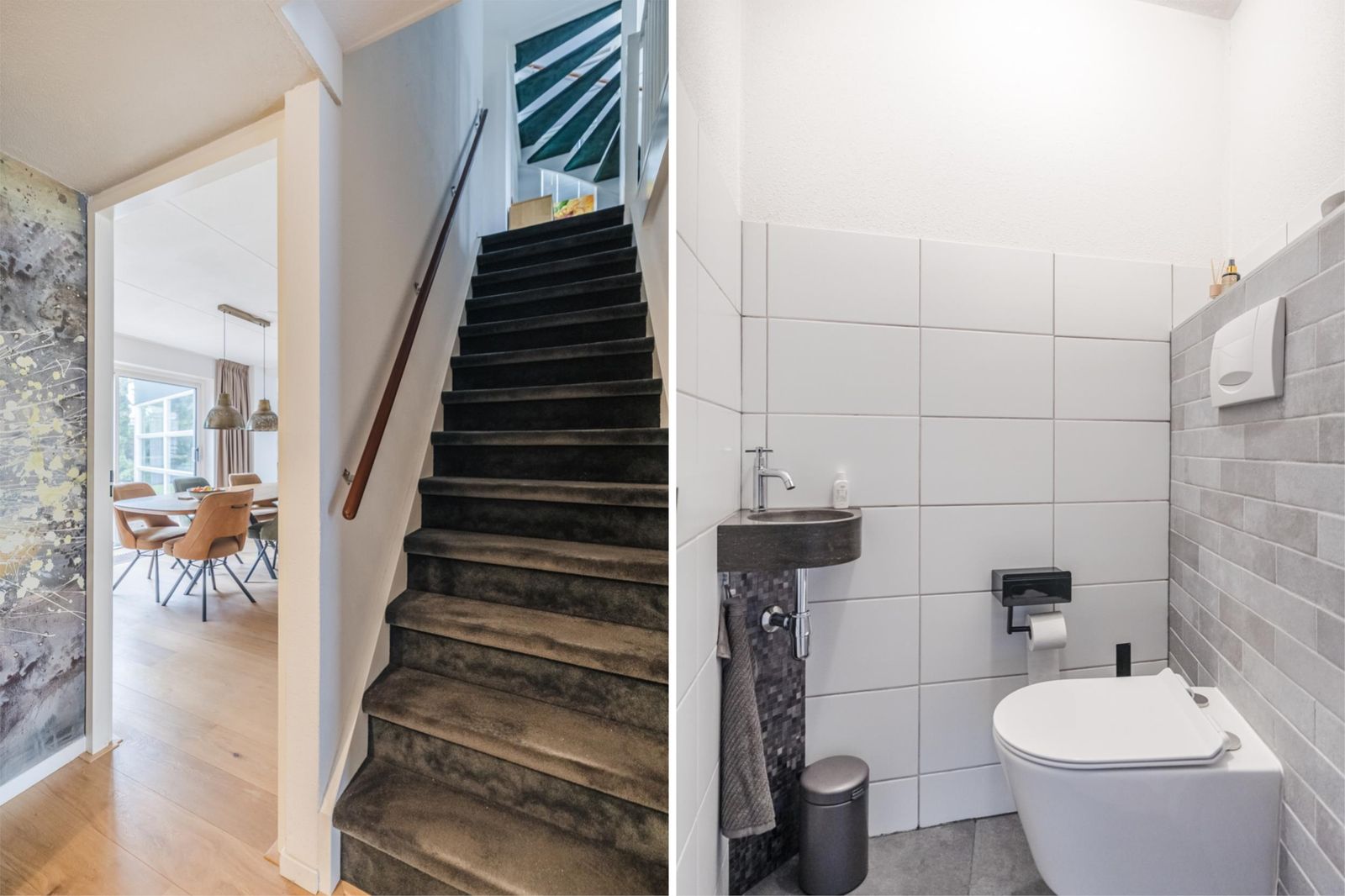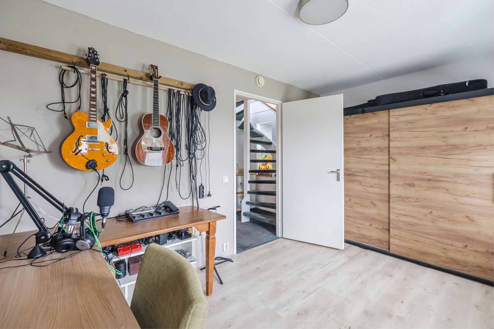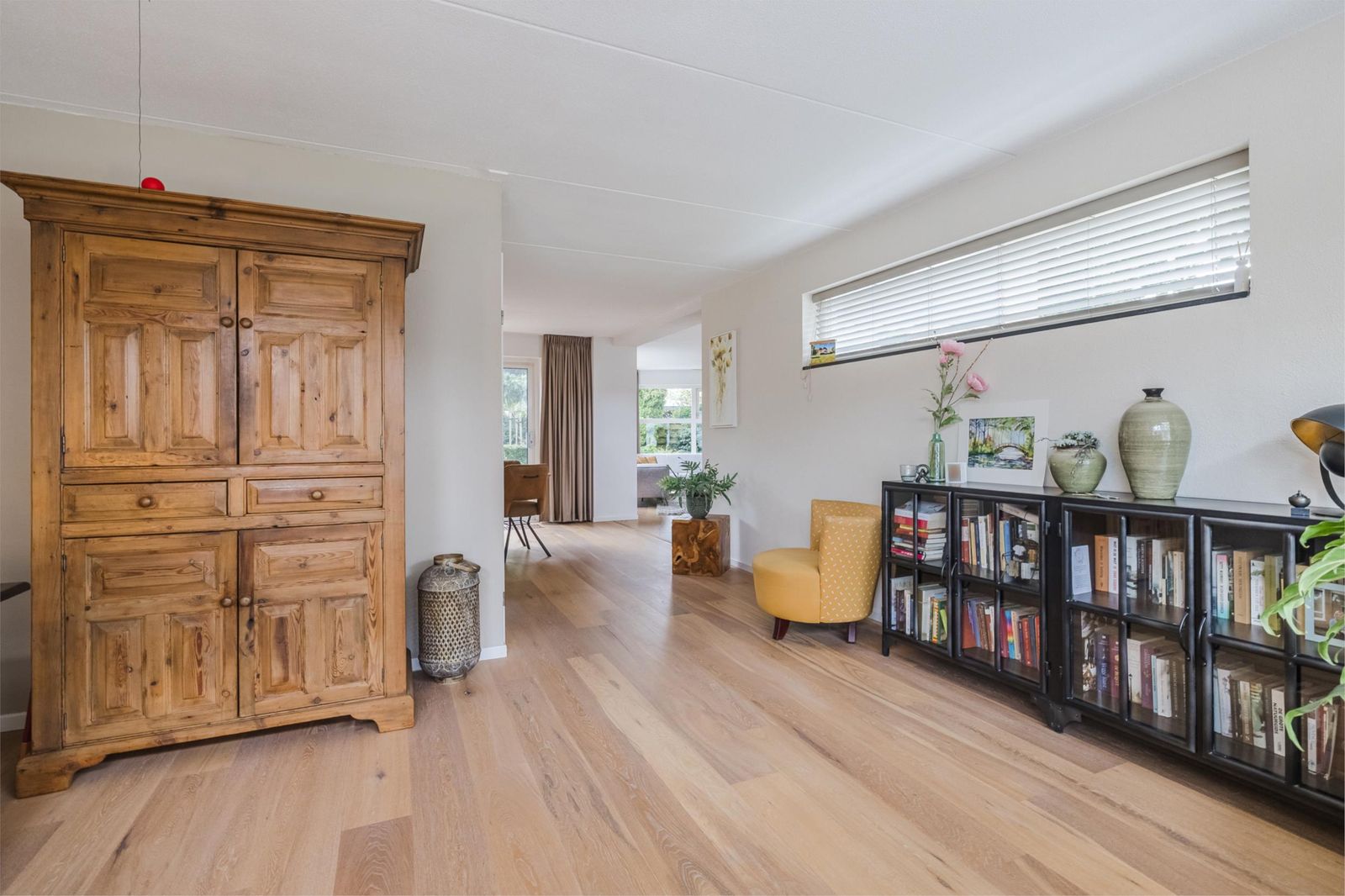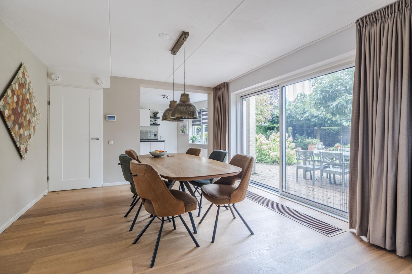 Indeling Begane grond: ruime hal, met meterkast en toilet. Er is sprake van lichte woonkamer, een extra tuingerichte woonkamer met houtkachel, eetkamer en keuken die in elkaar overvloeien en voorzien van een mooie houten vloer. Met een schuifpui naar de tuin.