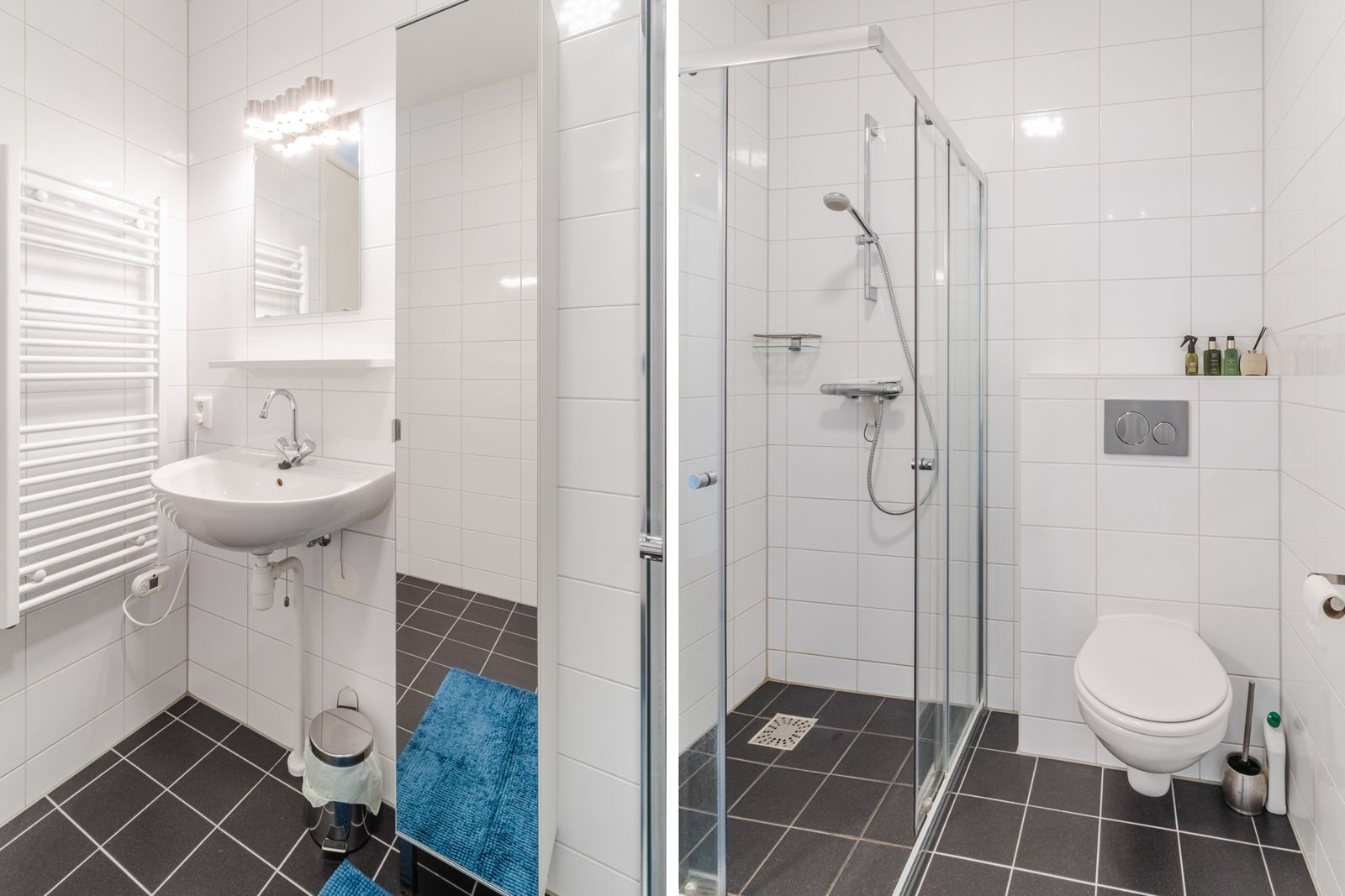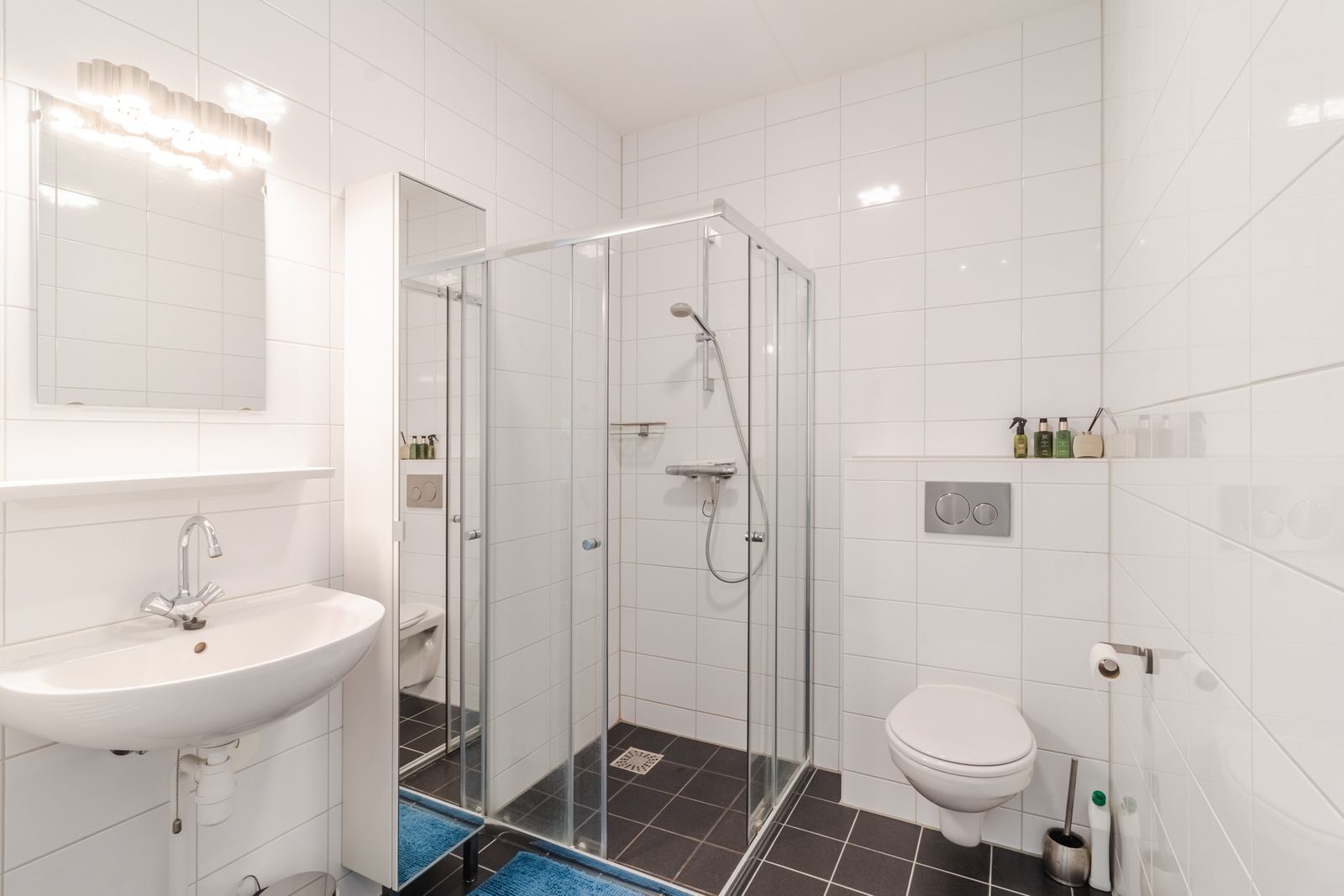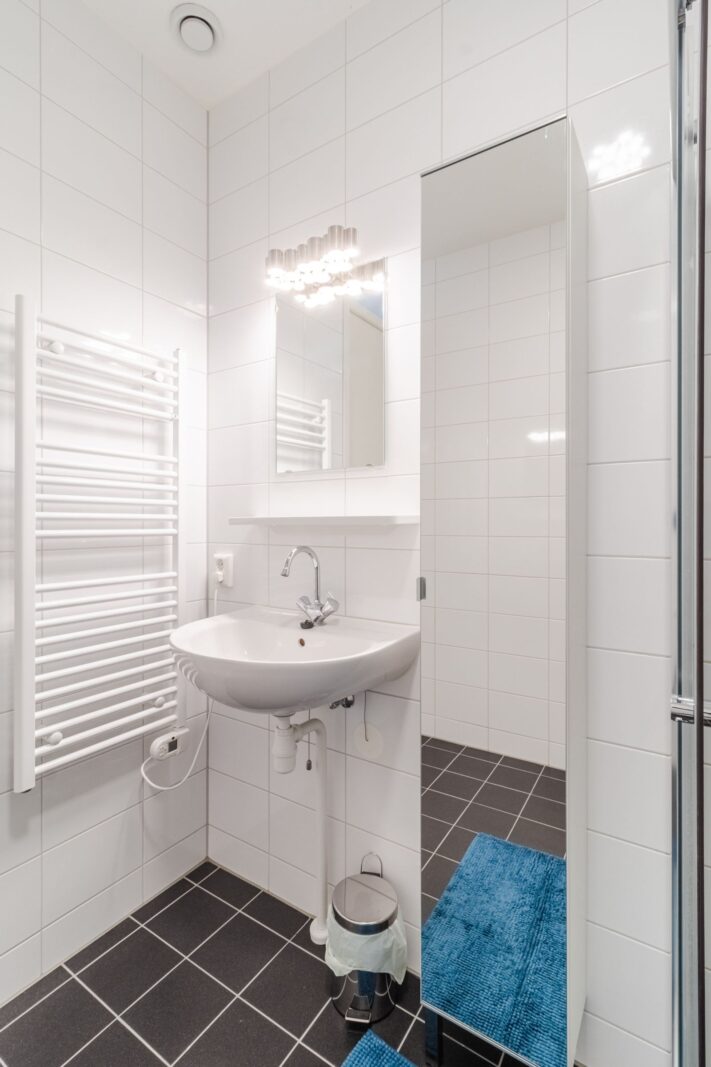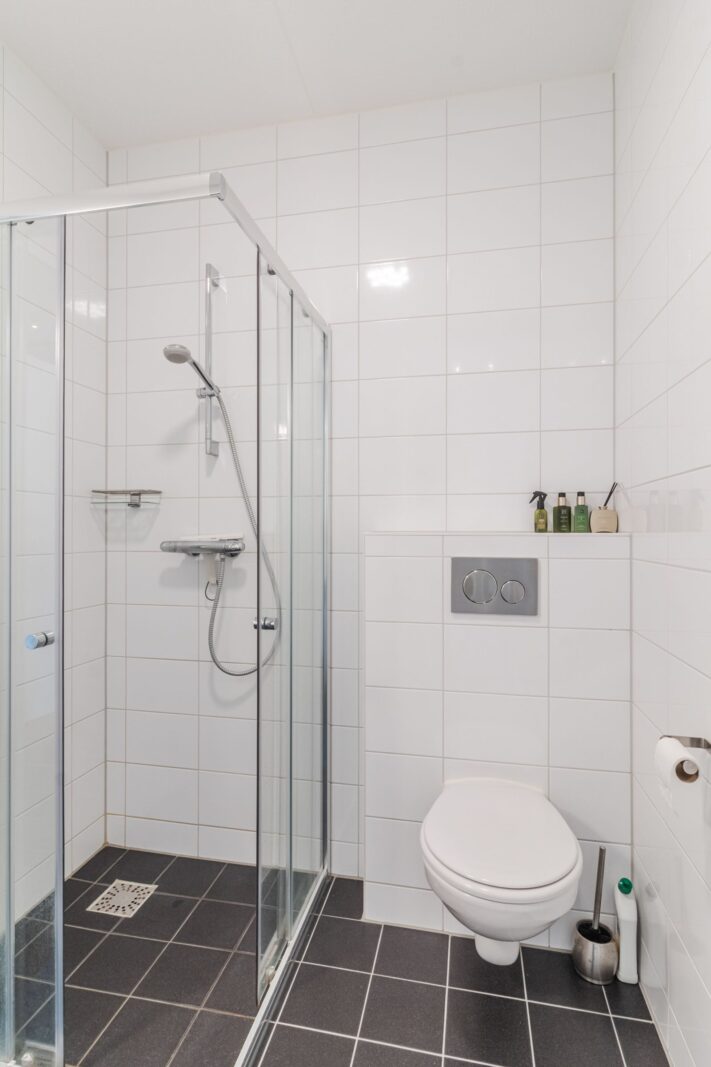 - Nette badkamer: voorzien van douche, wastafelmeubel met spiegel en toilet.