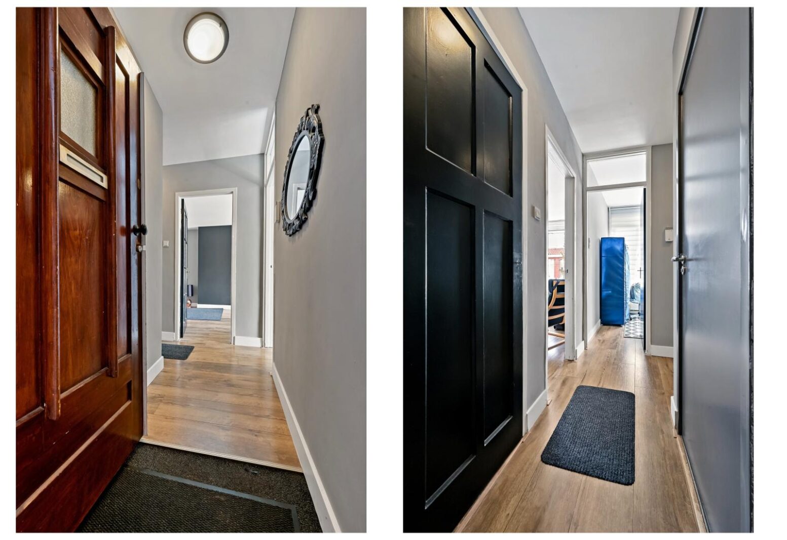 Toegang via het open portiek. Je komt binnen in een centrale hal met toegang tot het vernieuwde toilet, een slaapkamer aan de voorzijde, de ruime woonkamer en de open keuken aan de achterzijde. De woonkamer is licht en royaal, en staat in open verbinding met de keuken. Vanuit de keuken heb je toegang tot het balkon. De recent gemoderniseerde badkamer bevindt zich ook op deze verdieping en is voorzien van een inloopdouche, strak wastafelmeubel en moderne betegeling.