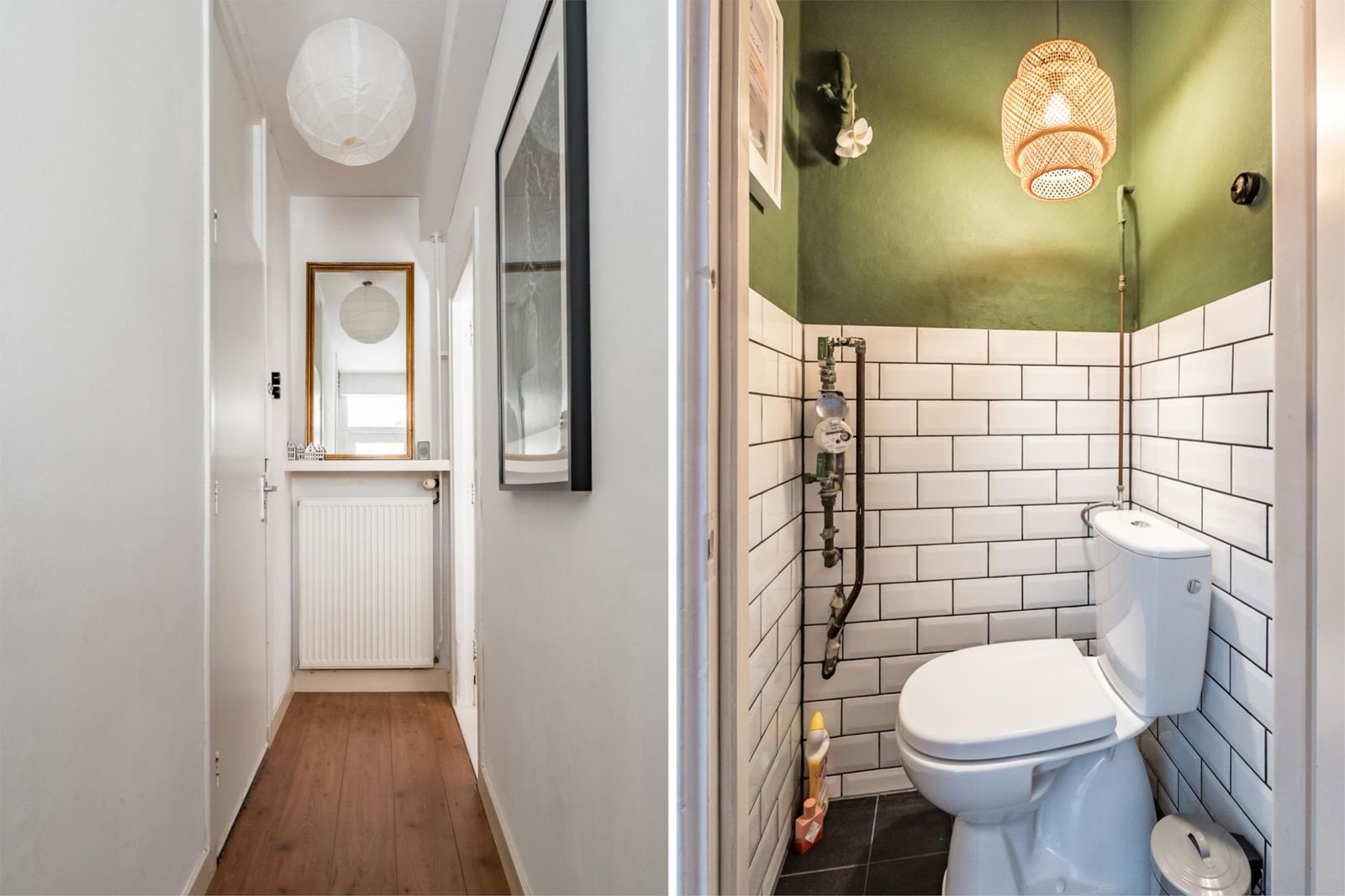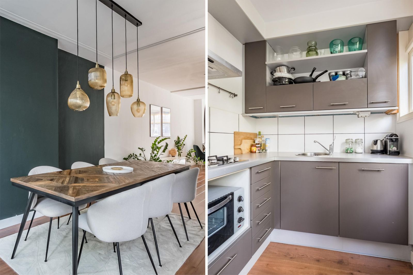 Aan de voorzijde bevindt zich het ruime zitgedeelte, waar de originele glas-in-lood bovenramen in houten kozijnen zorgen voor extra sfeer en karakter. Het eetgedeelte ligt aan de achterzijde en sluit direct aan op de keuken. Vanuit hier heb je toegang tot het balkon (ca.2m²) en de hal met separaat toilet, een praktische trap-/voorraadkast en een plek voor de koelkast.