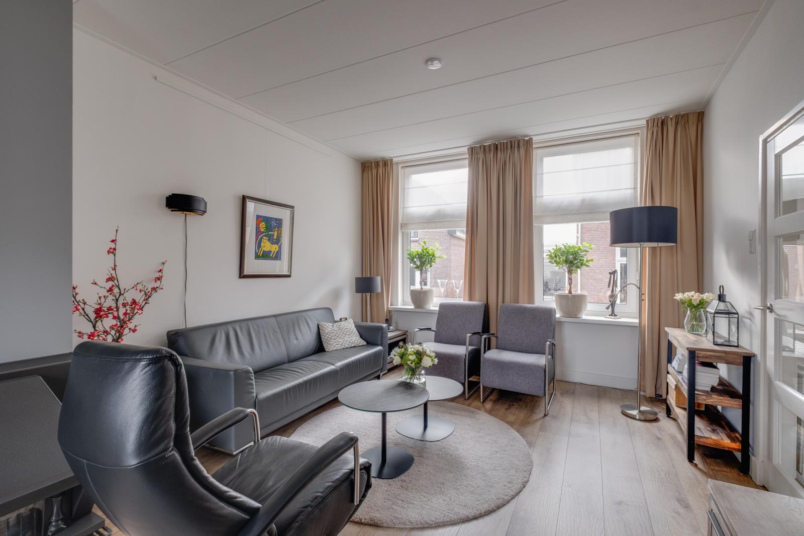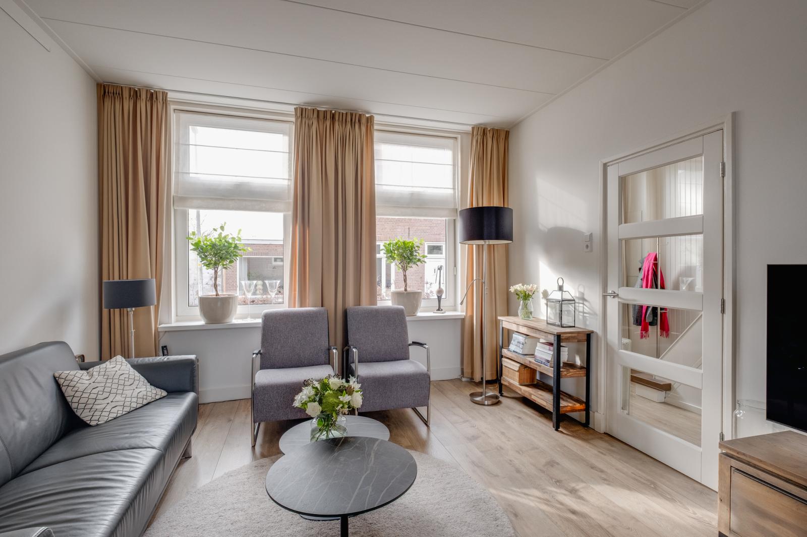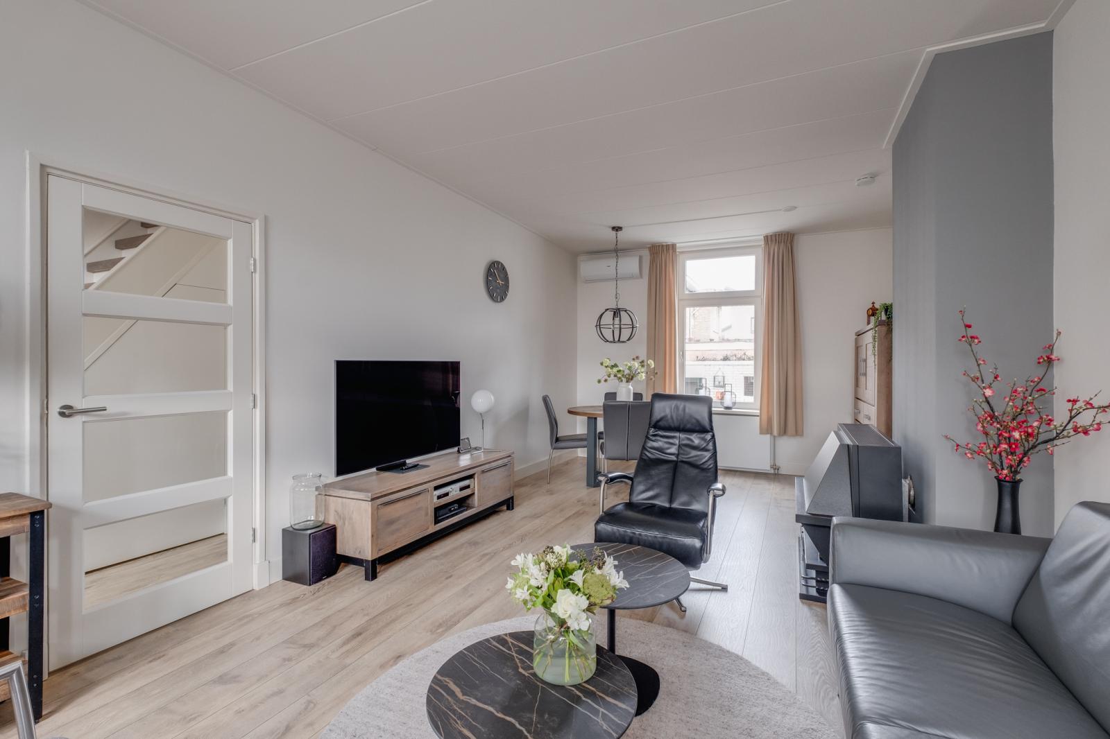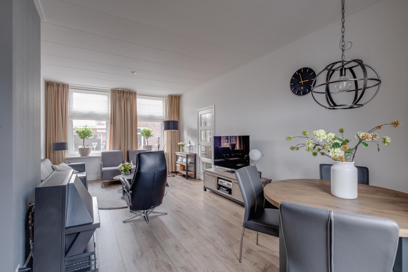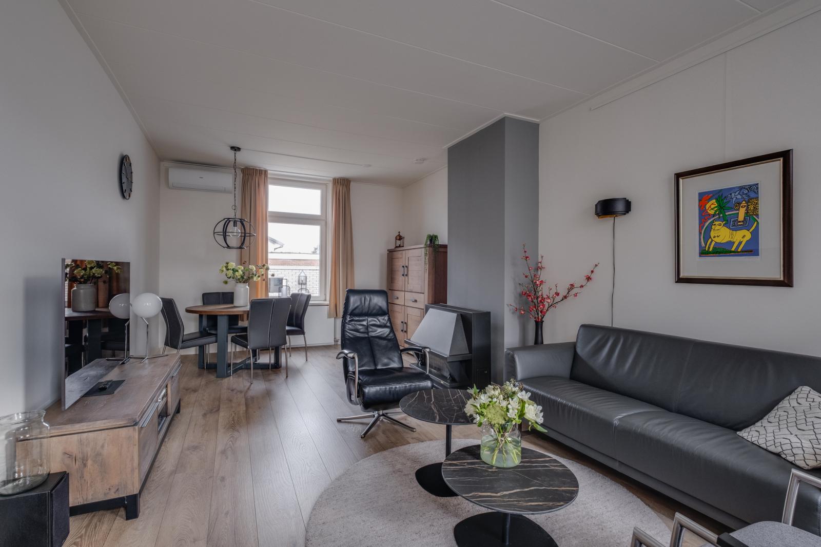 - Lichte woonkamer en een dichte keuken met inbouwapparatuur