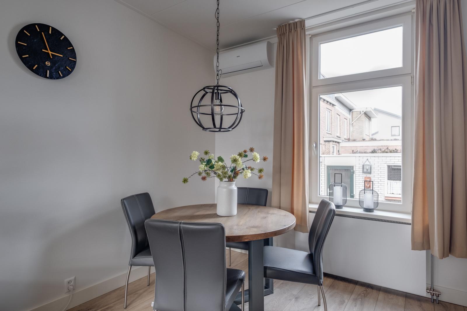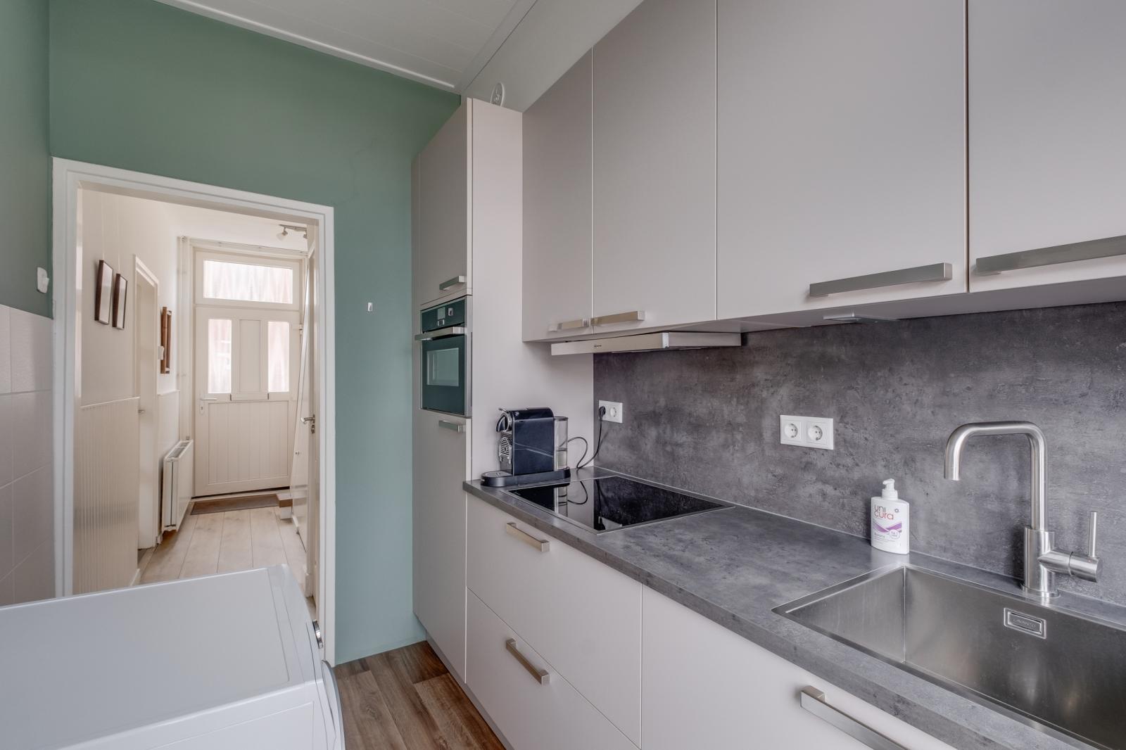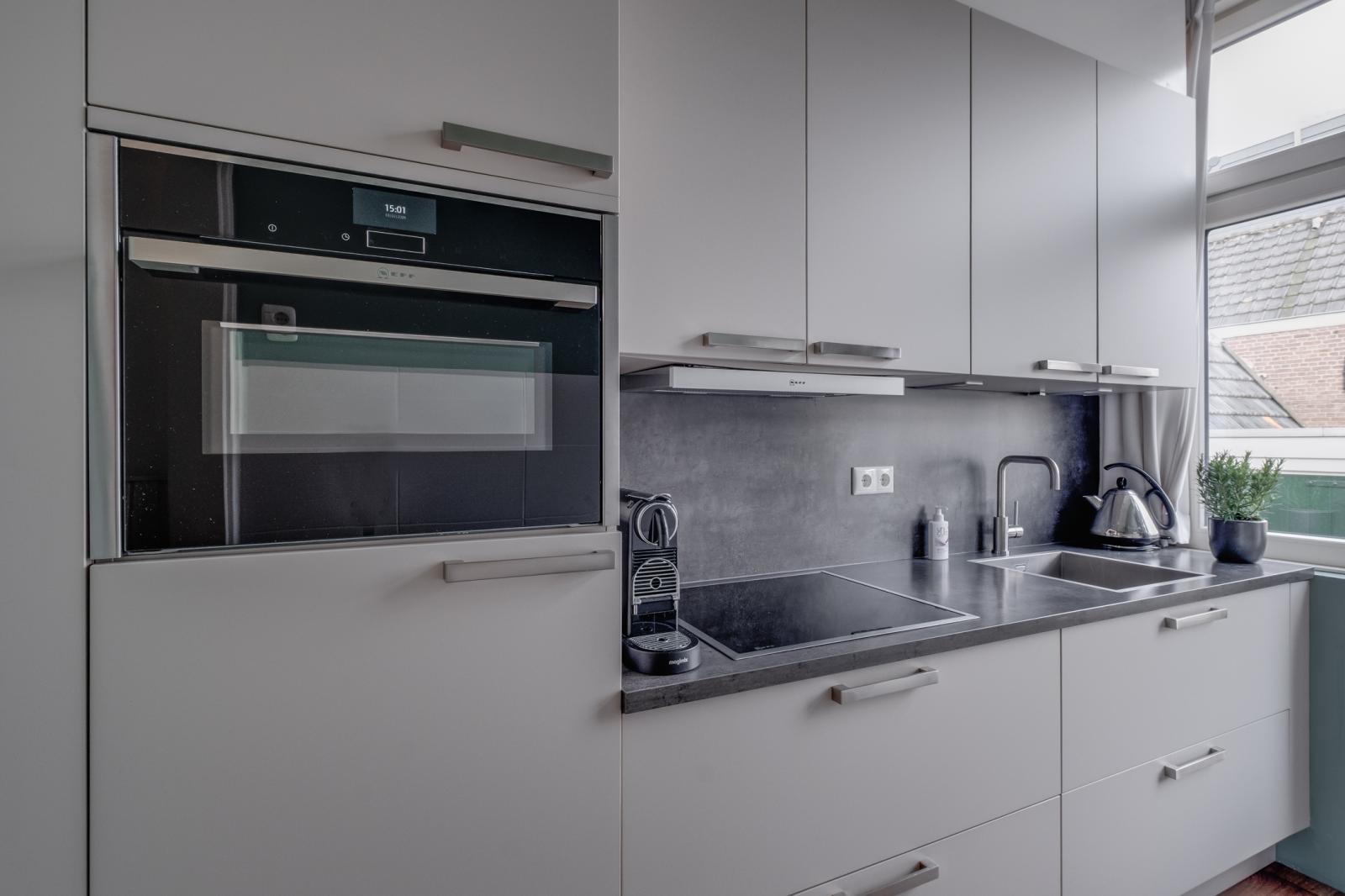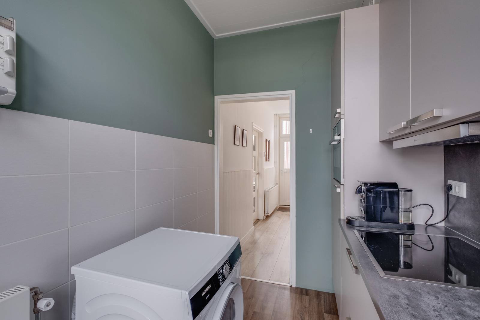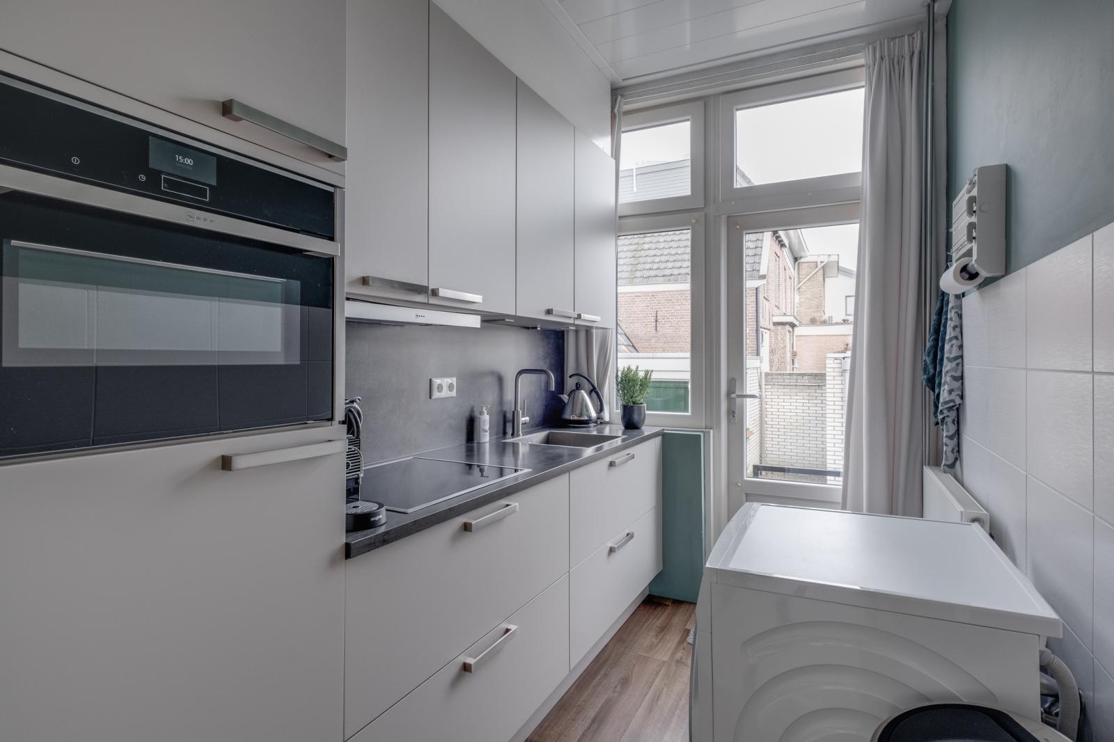 - Lichte woonkamer en een dichte keuken met inbouwapparatuur