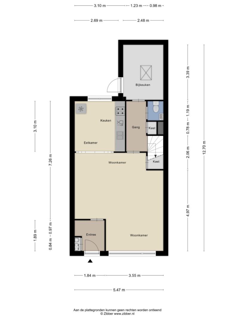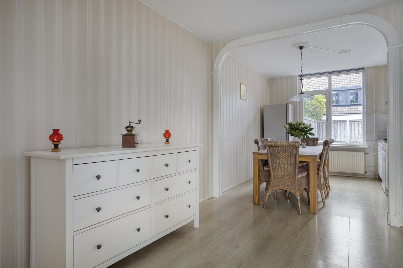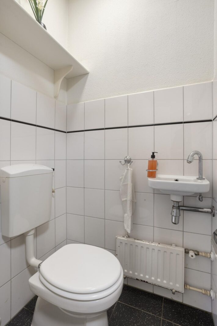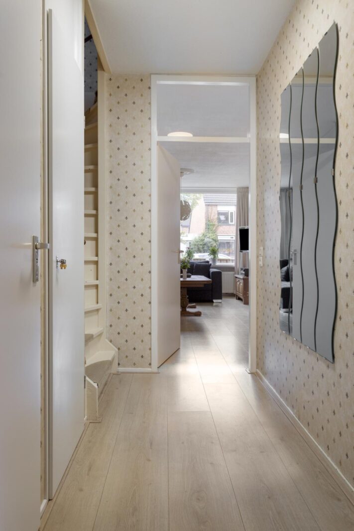 Aan de achterzijde van de woning bevindt zich een tweede hal. Deze biedt toegang tot de toiletruimte, de trap naar de eerste verdieping en de praktische bijkeuken. Deze extra hal maakt het wonen efficiënt en zorgt voor een logische indeling van de begane grond.