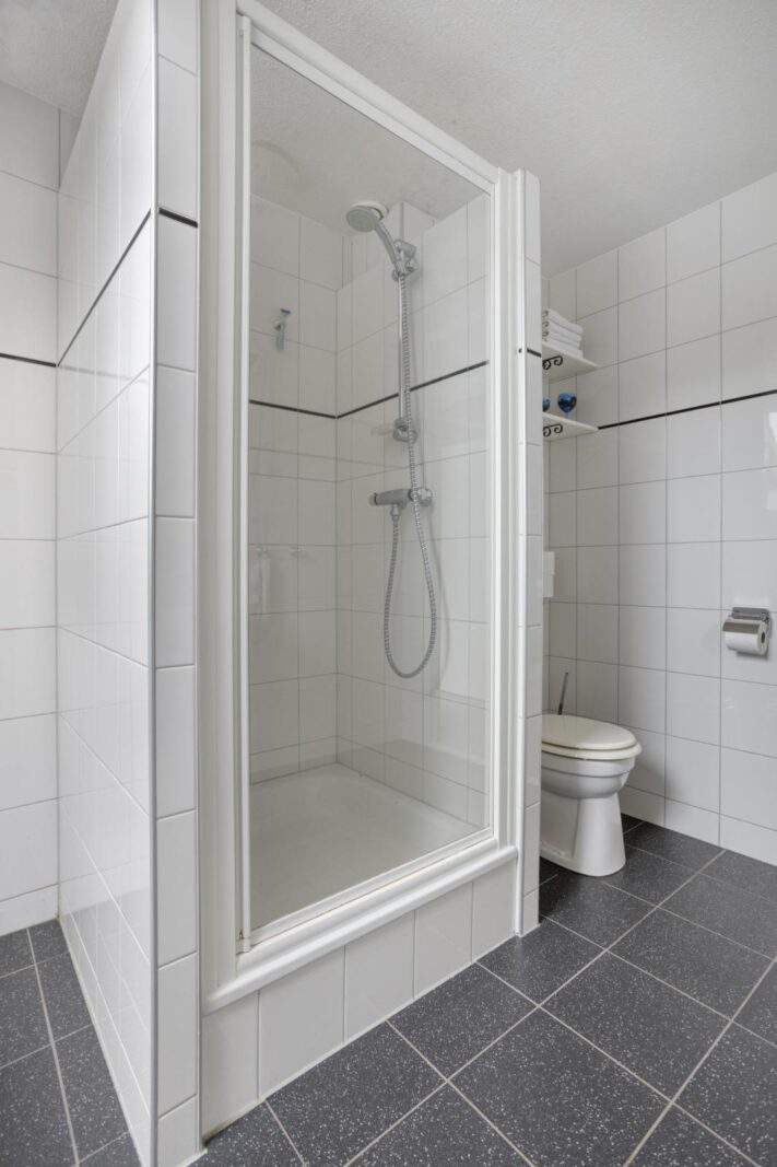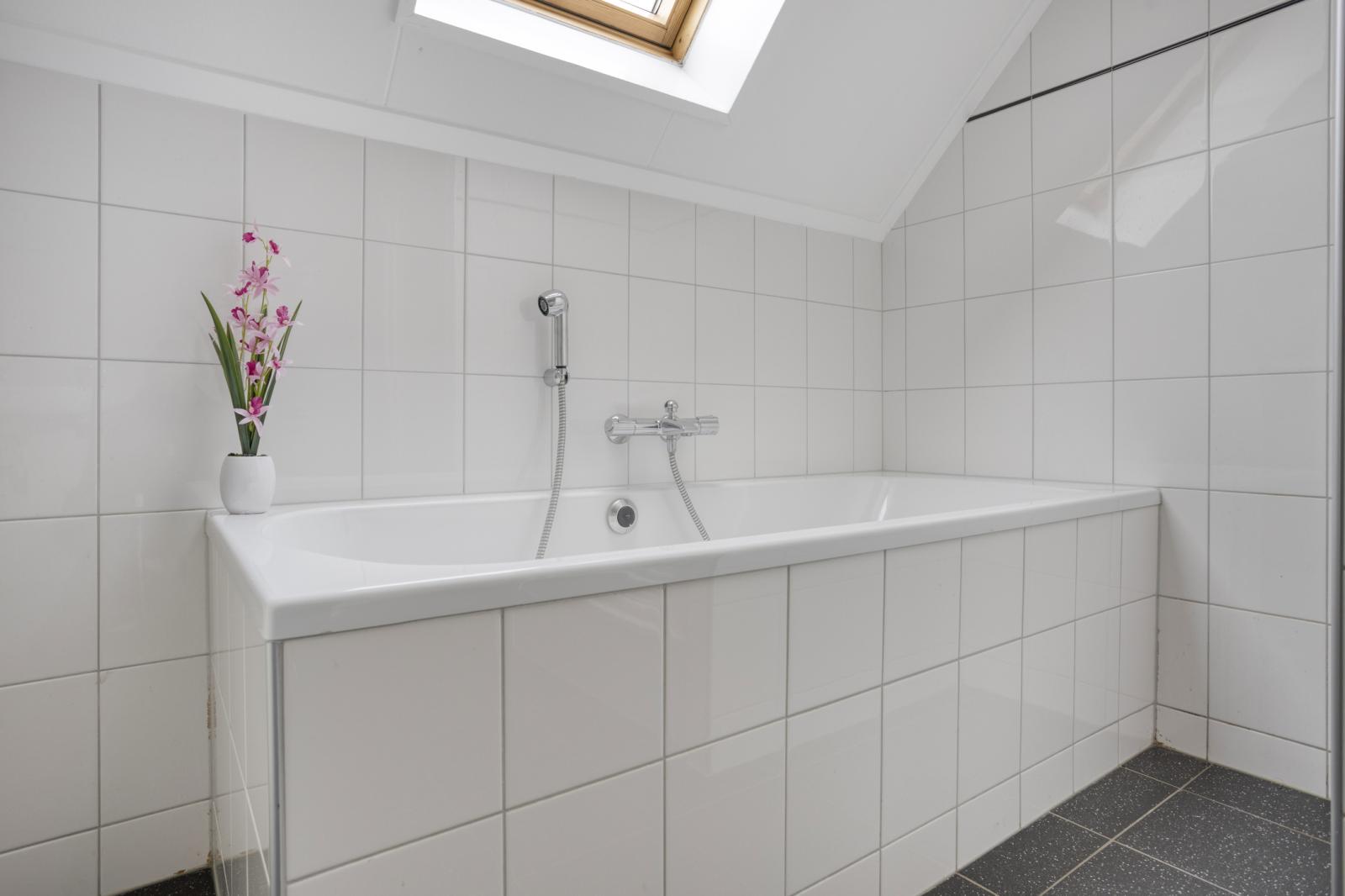De ruime badkamer grenst aan de overloop en is volledig betegeld. Deze is voorzien van een royale douchecabine, ligbad, wastafel met spiegel en een staand toilet. De nette en neutrale afwerking biedt een solide basis, die desgewenst naar eigen smaak gemoderniseerd kan worden.