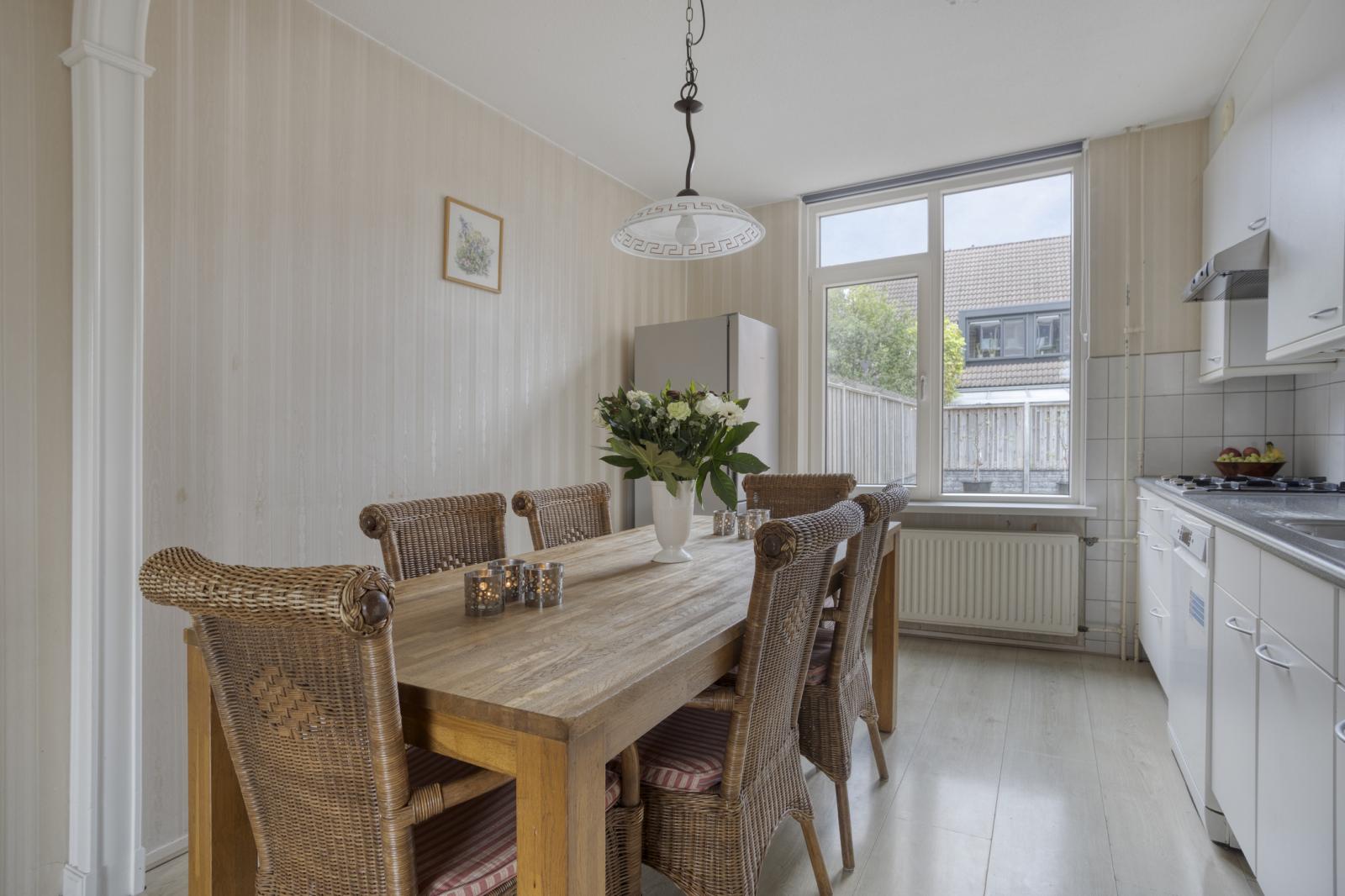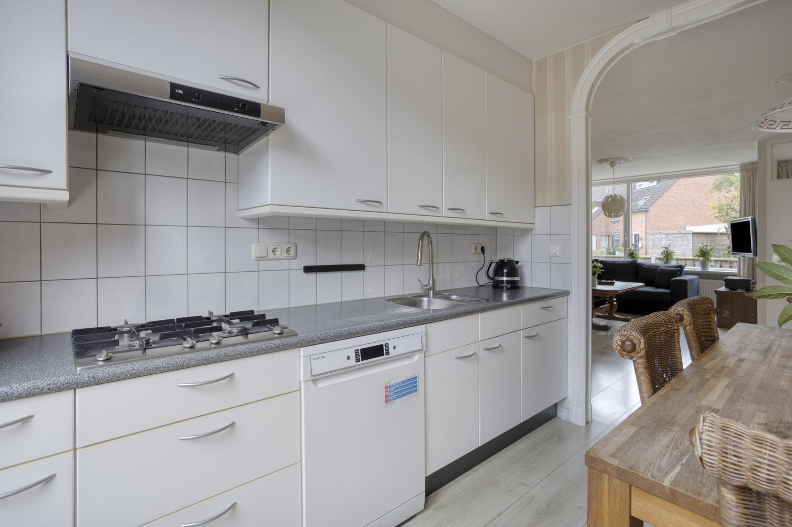 Een open keuken aan de achterzijde grenst direct aan de eetkamer en is voorzien van een langwerpig aanrecht met gasfornuis, afzuigkap, spoelbak met kraan en vaatwasser. De losstaande koelkast maakt het geheel compleet. Hoewel de keuken ruim en functioneel is, biedt deze tevens de mogelijkheid voor modernisering naar eigen smaak.