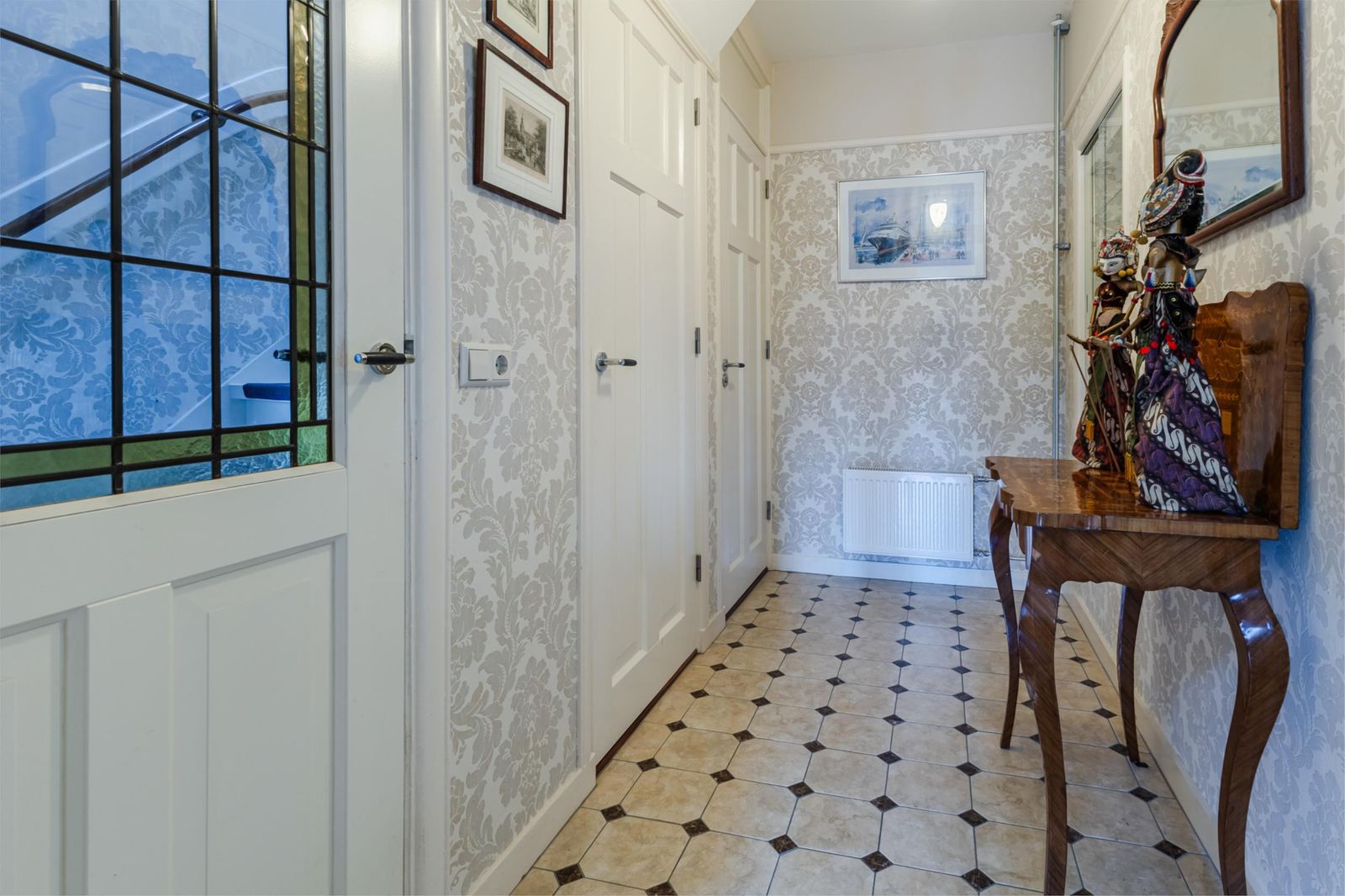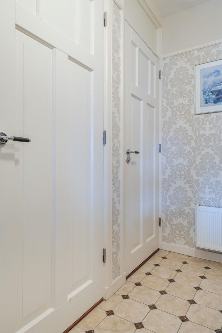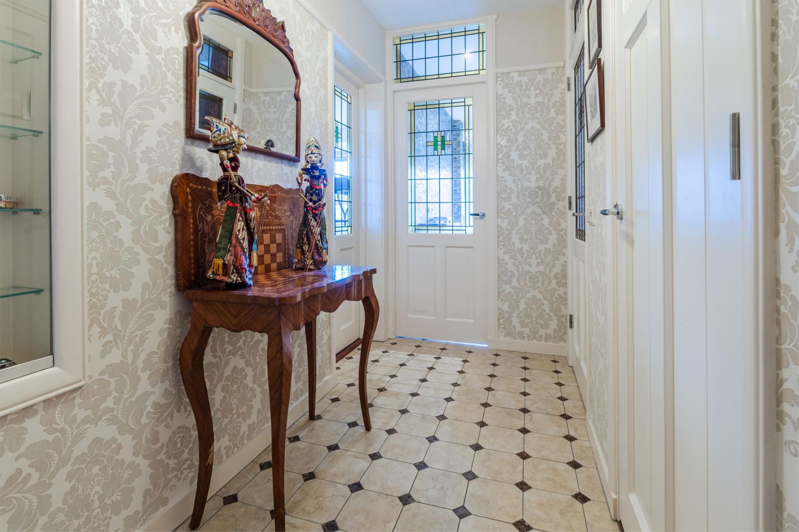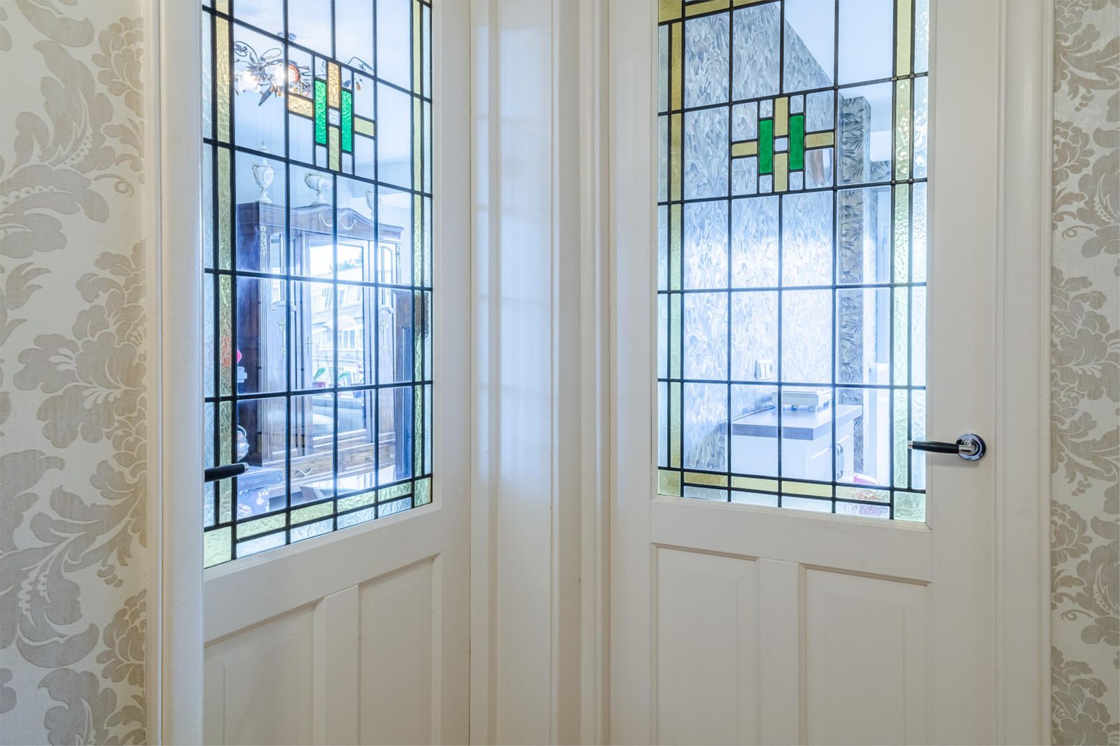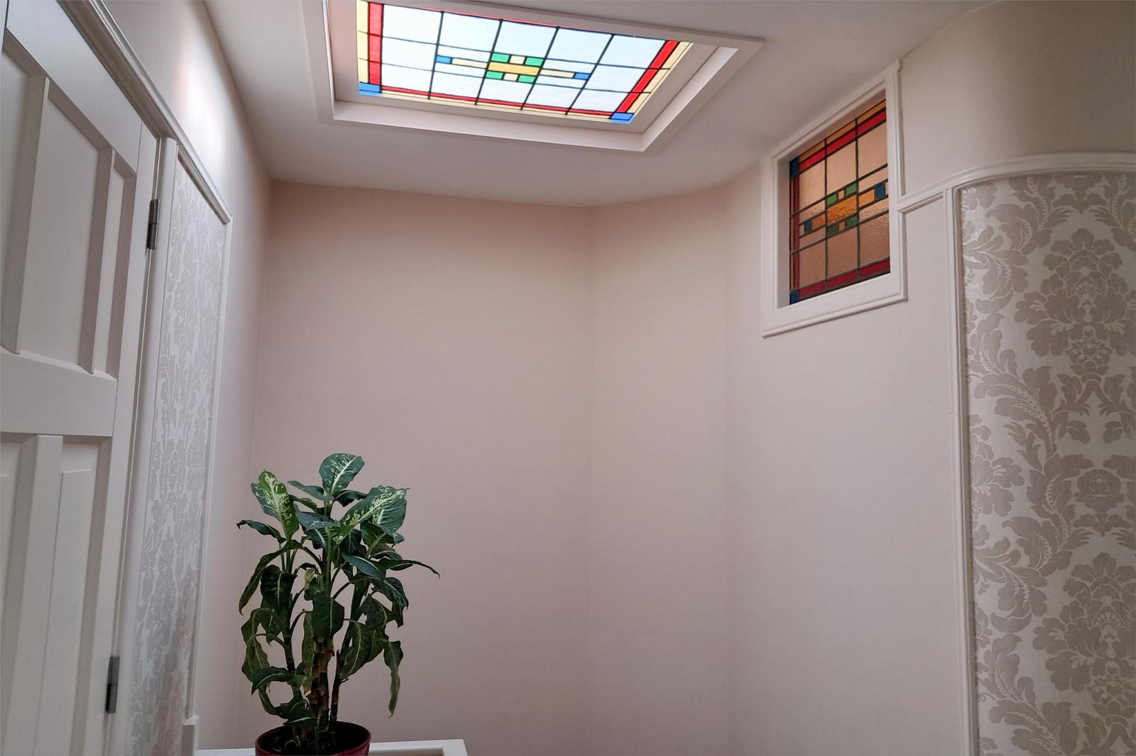 De woning strekt zich uit over de derde en vierde verdieping en voelt direct warm en uitnodigend aan. De entreehal is een echte blikvanger met een karakteristieke tegelvloer, nieuwe glas-in-looddeuren en een ingebouwde vitrinekast. Hier bevinden zich ook het toilet en de meterkast.