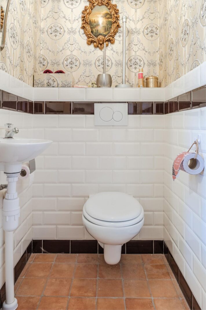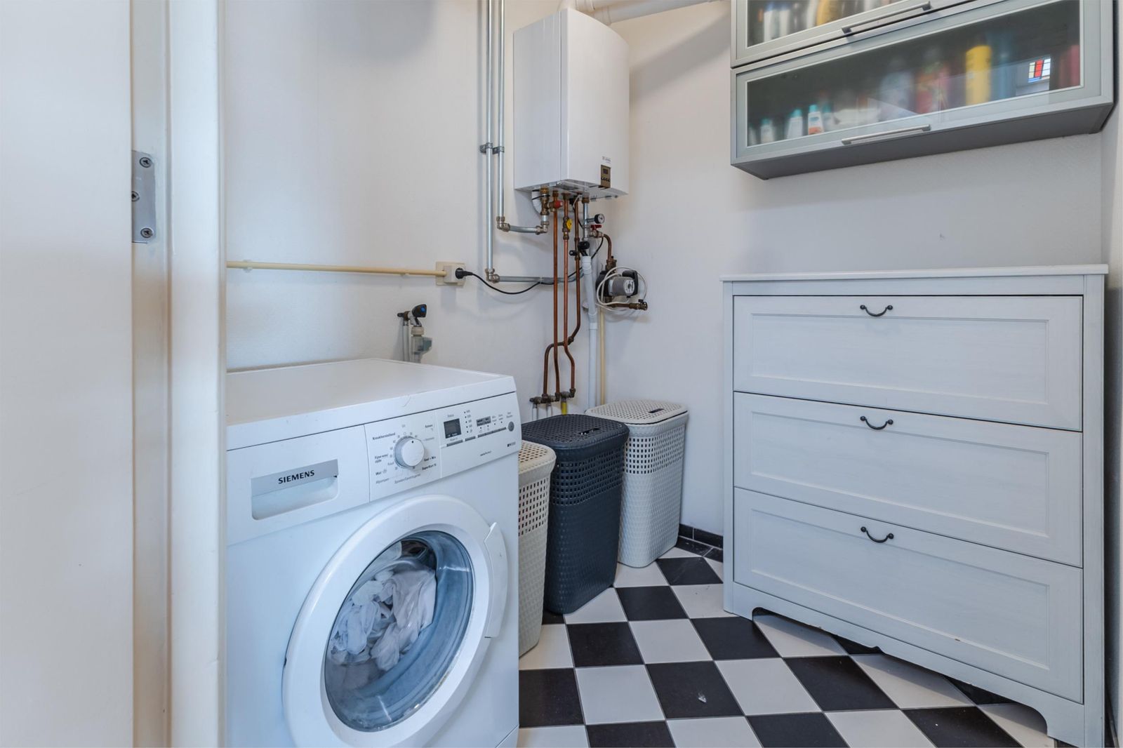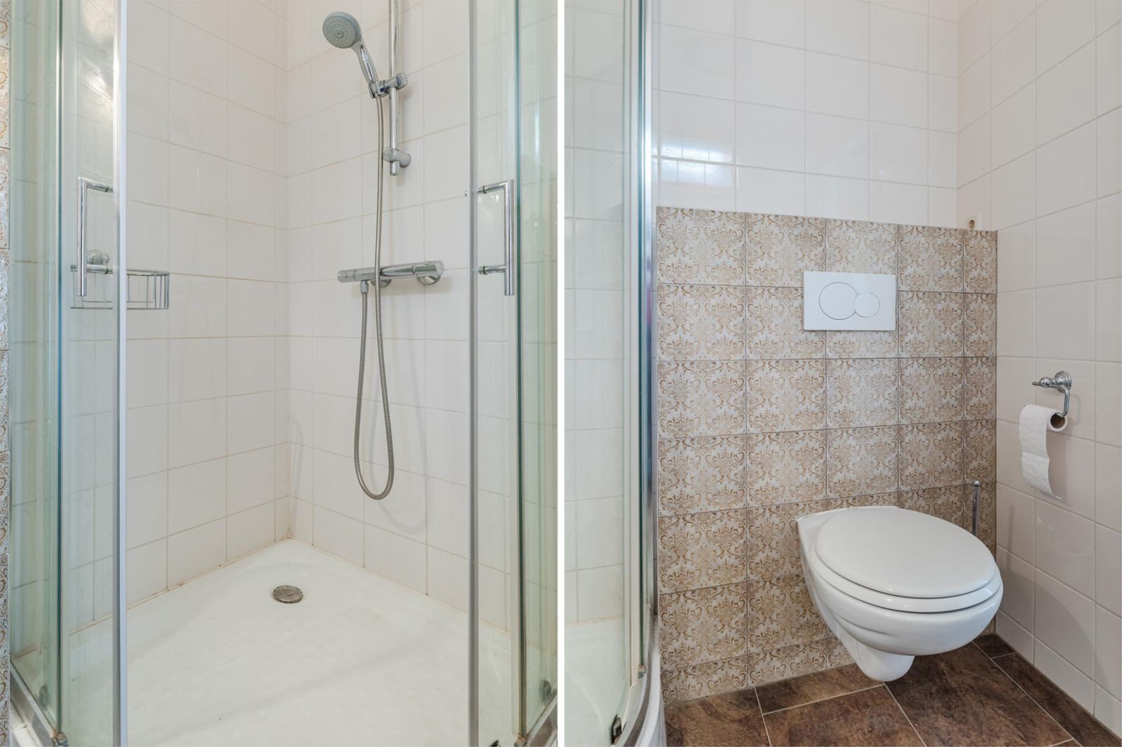 De badkamer heeft een wastafel, douche en wc. In het washok zijn de wasmachineaansluiting en de cv-ketel. Boven de overloop is een glas-in-lood daklicht met ingebouwde led-verlichting.