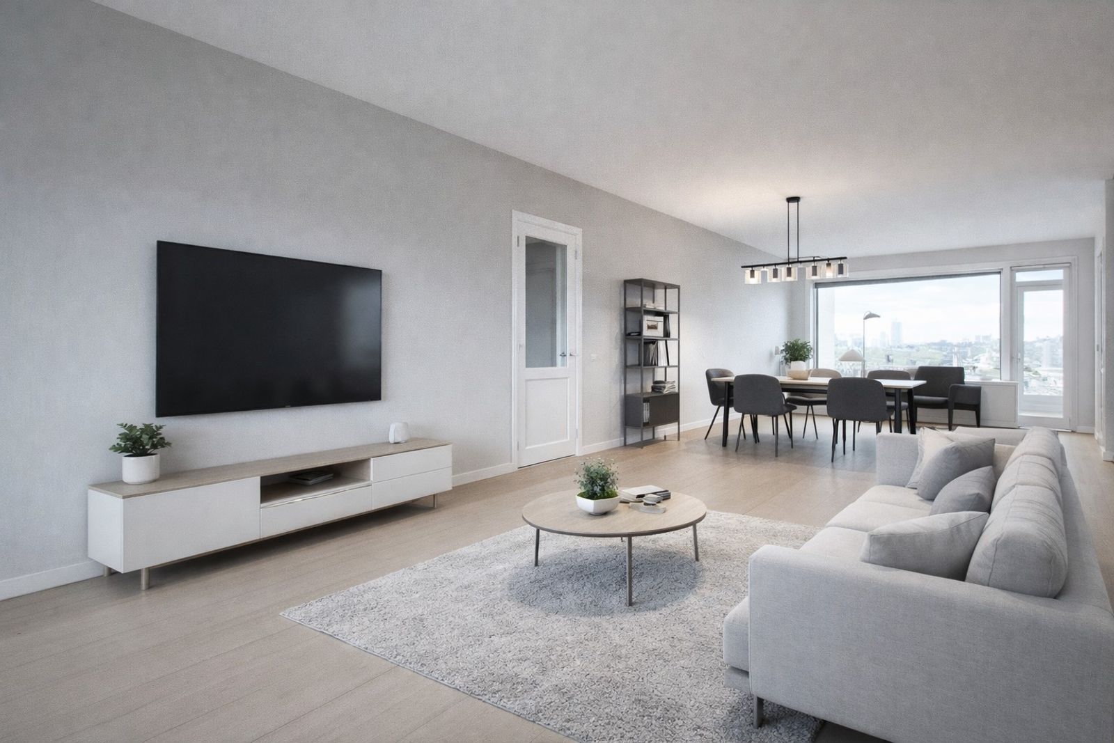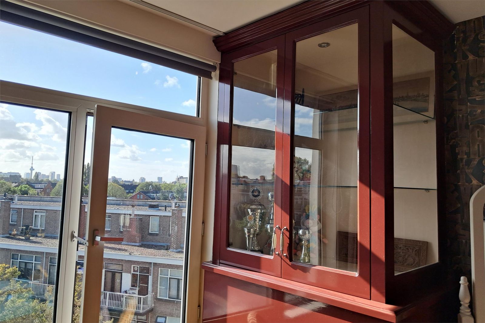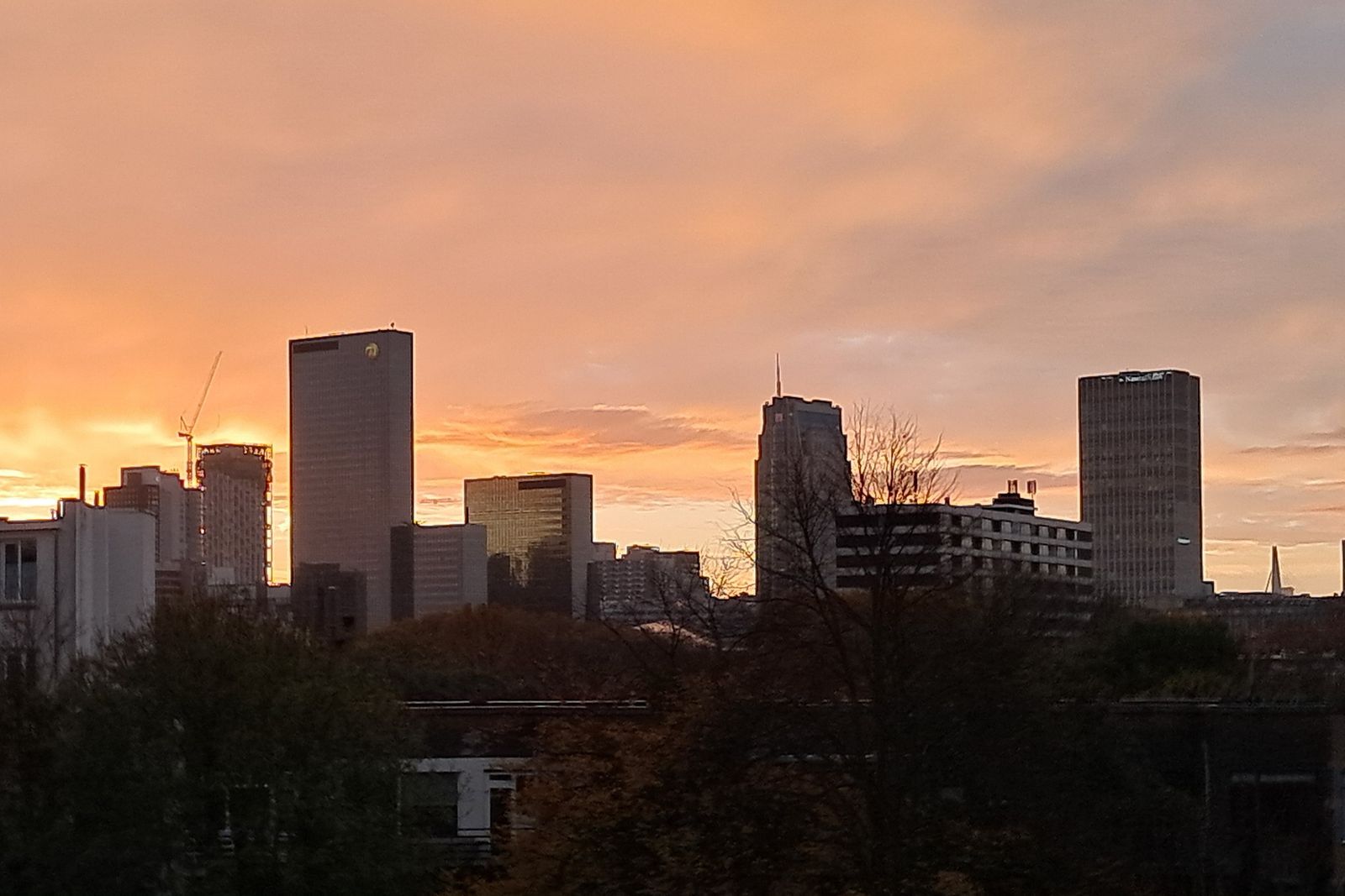 De royale woonkamer is licht, lang en veelzijdig in te delen. Er is ruimte voor een comfortabele zithoek, een grote eettafel en bijvoorbeeld een speelhoek of werkplek. De open haard zorgt in de winter voor extra sfeer, terwijl de centrale verwarming (recent aangelegd) het hele jaar door comfort biedt. Het plafond en de wanden zijn recent vernieuwd en strak afgewerkt. Vanuit het inpandige balkon aan de achterzijde geniet je van een fraai uitzicht op de skyline van Rotterdam een uitzicht dat nooit verveelt.