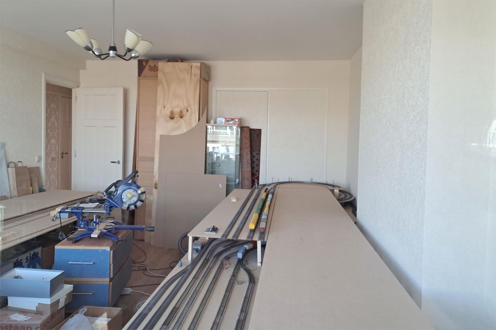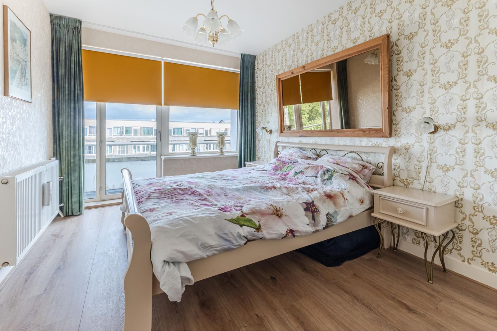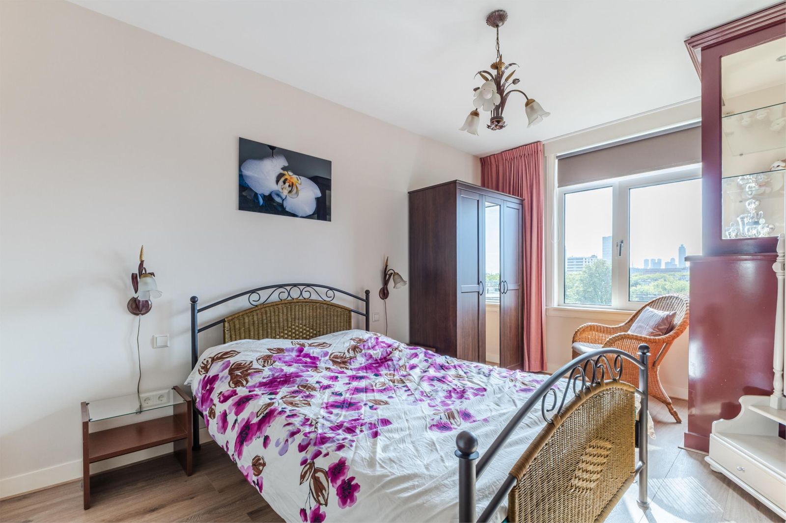 De grote slaapkamer achter heeft een kleine inloopkast en een kastenwand met ingebouwde tv. In deze kastenwand kan je bijvoorbeeld schoenen kwijt. Er is een fraaie baldakijn met sfeerverlichting, en vanaf het balkon hier heb je een nog beter zicht op de skyline. In de kleine slaapkamer achter is een mooie vitrinekast.