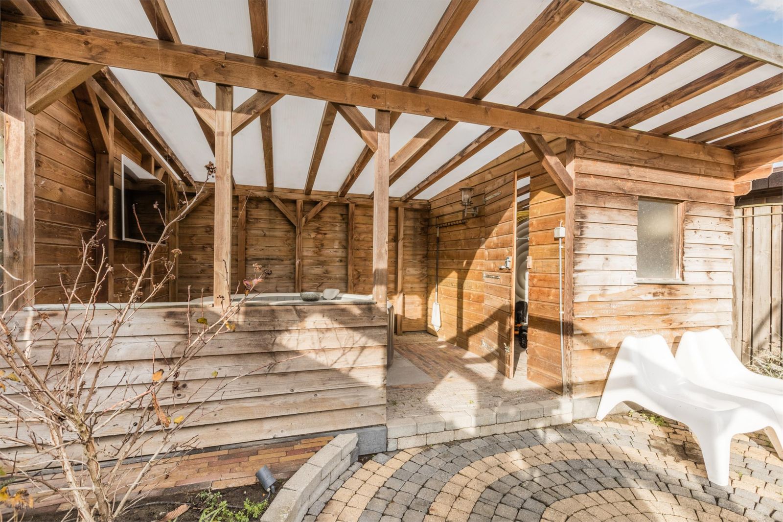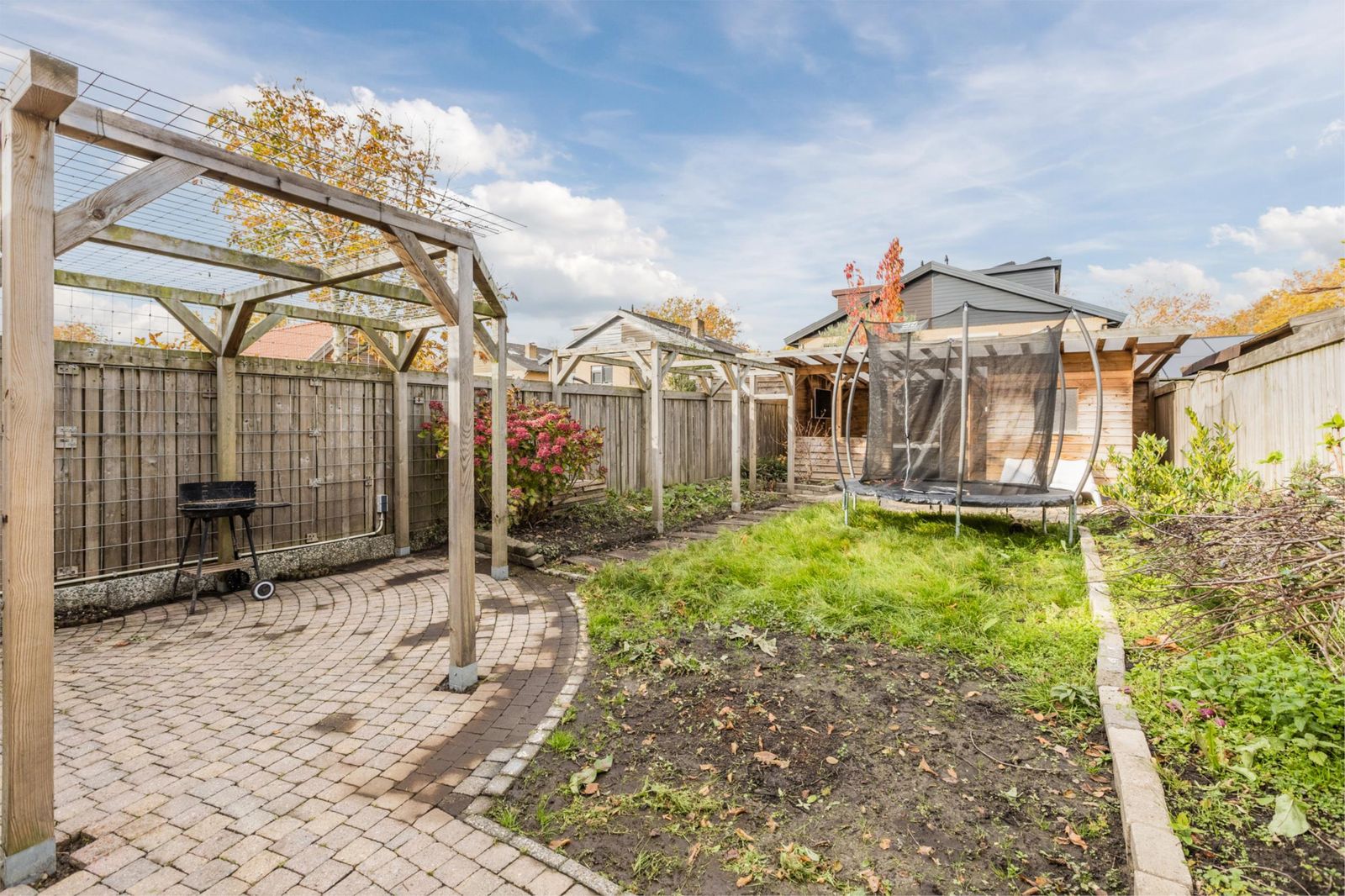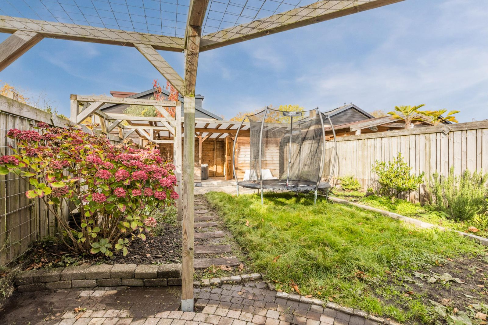 De 22 meter diepe achtertuin biedt veel mogelijkheden en is aangelegd met een combinatie van sierbestrating en groen. Achterin de tuin bevindt zich een overkapping met extra bergruimte, ideaal voor bijvoorbeeld een jacuzzi, loungeset of buitenkeuken.