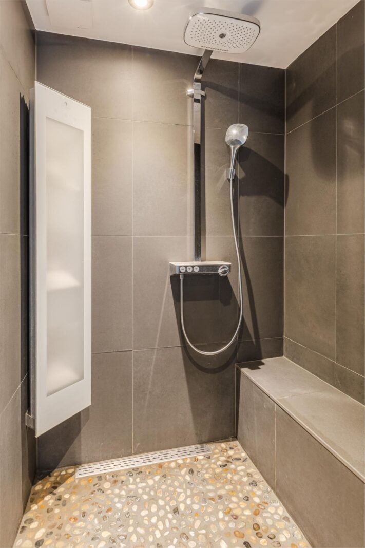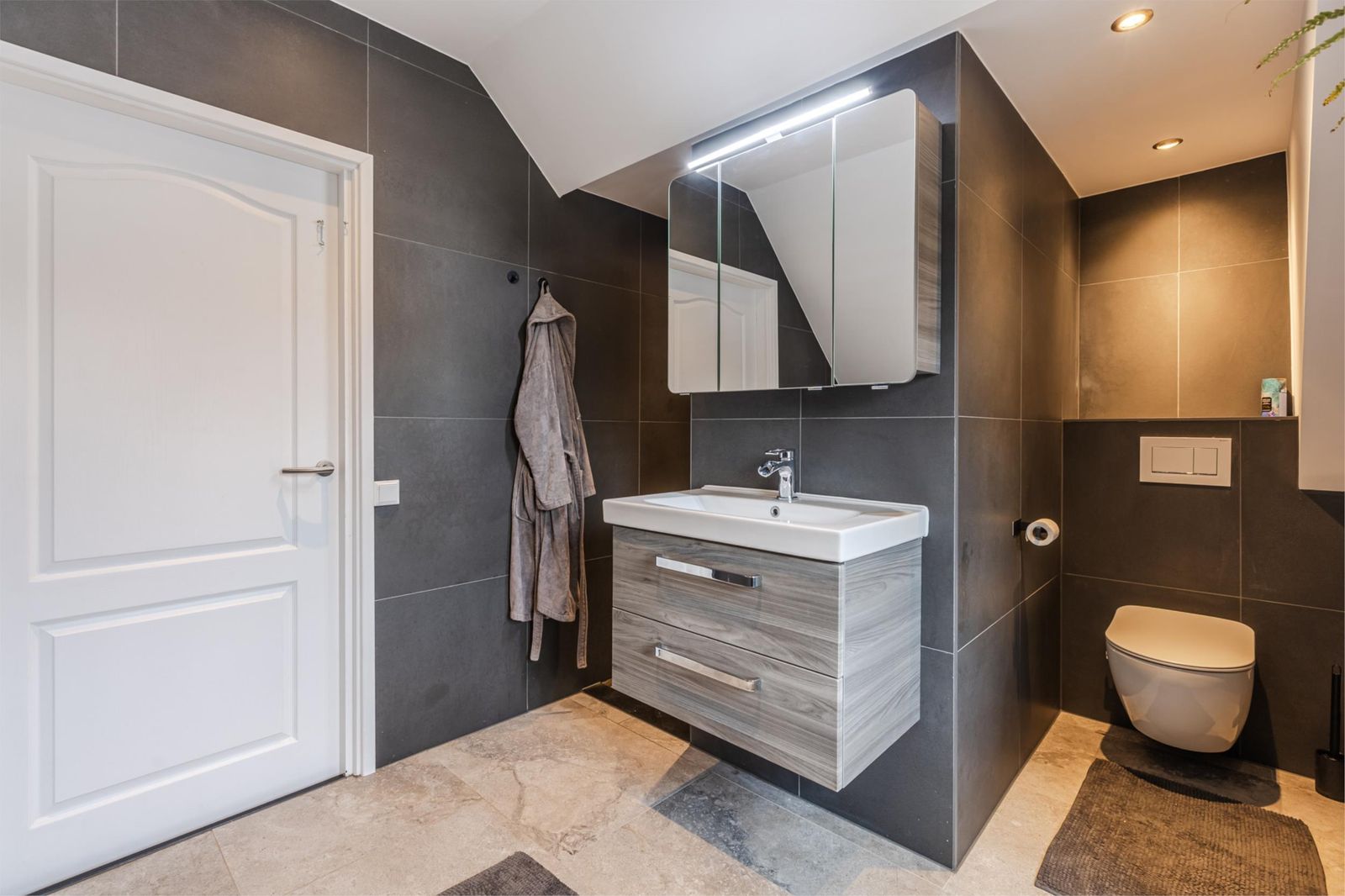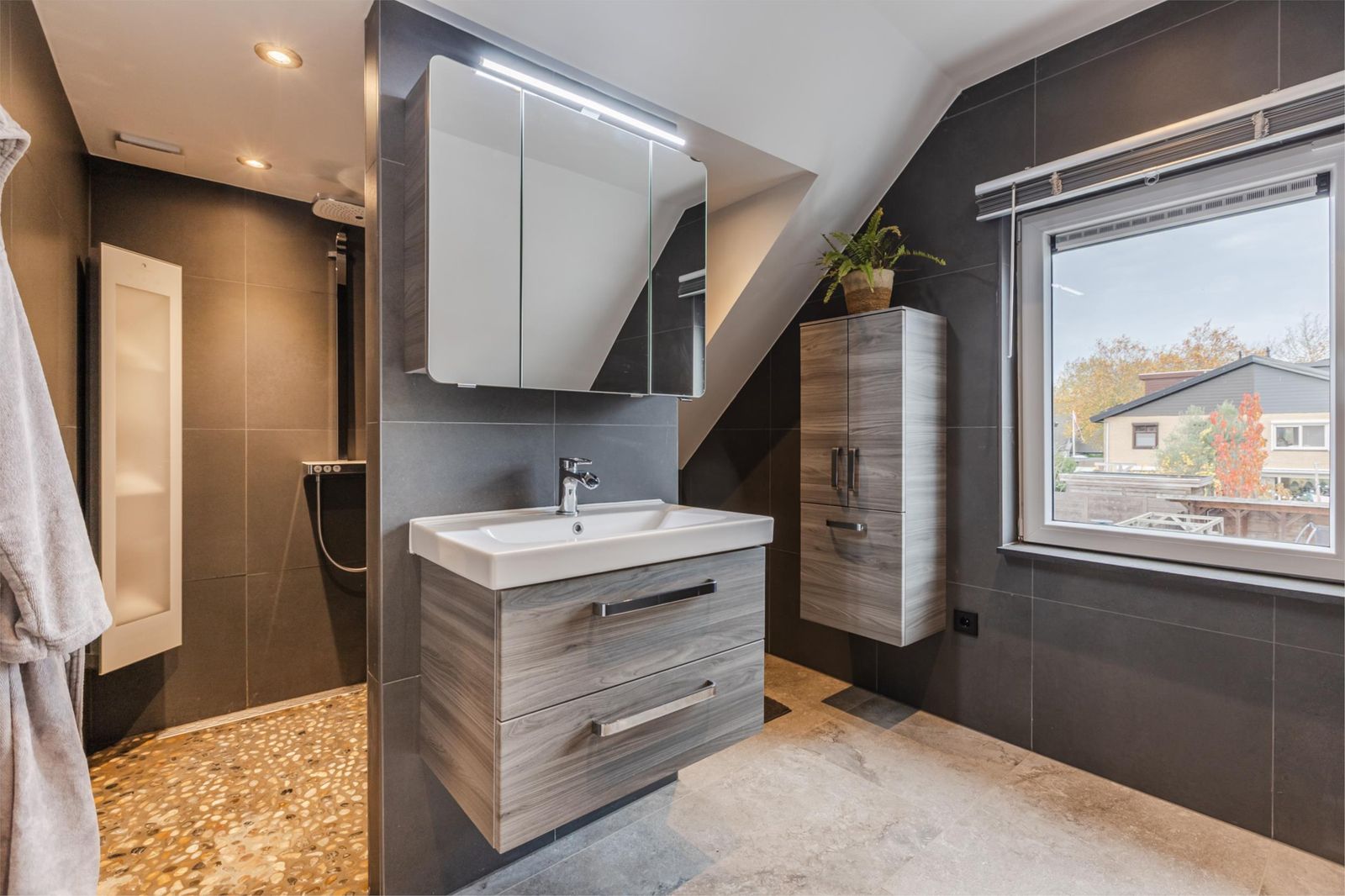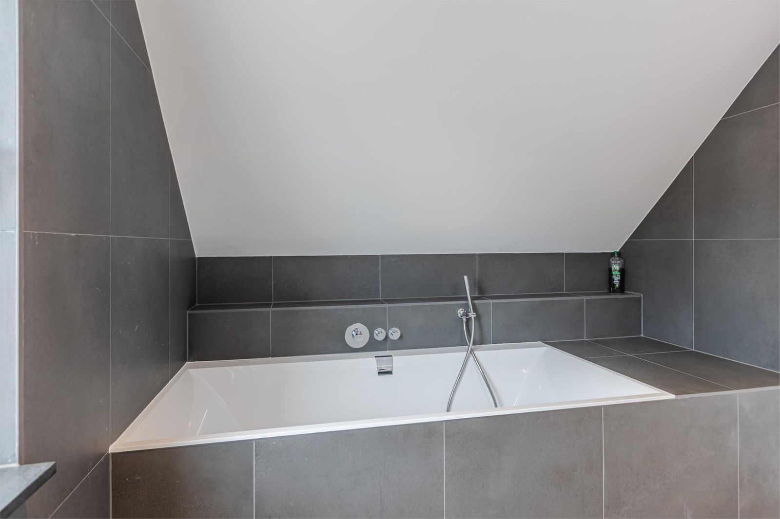 De moderne badkamer (2023) is voorzien van vloerverwarming, een ligbad, aparte douche met Sunshower (ter overname), wandcloset, wastafelmeubel en apart toilet.