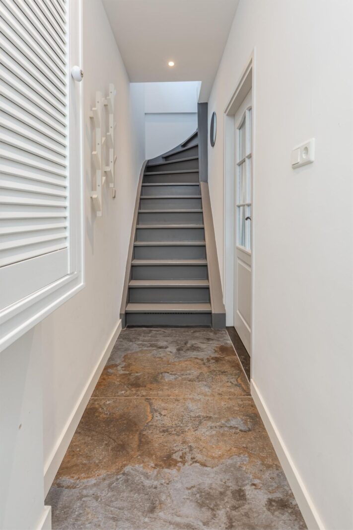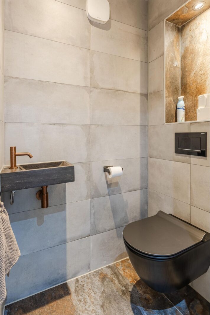 Vanuit de woonkamer is de bijkeuken bereikbaar. Hier bevinden zich de aansluitingen voor wasmachine en droger, de cv-opstelling en het volledig gemoderniseerde toilet (2023), eveneens met vloerverwarming en inbouwspots.
