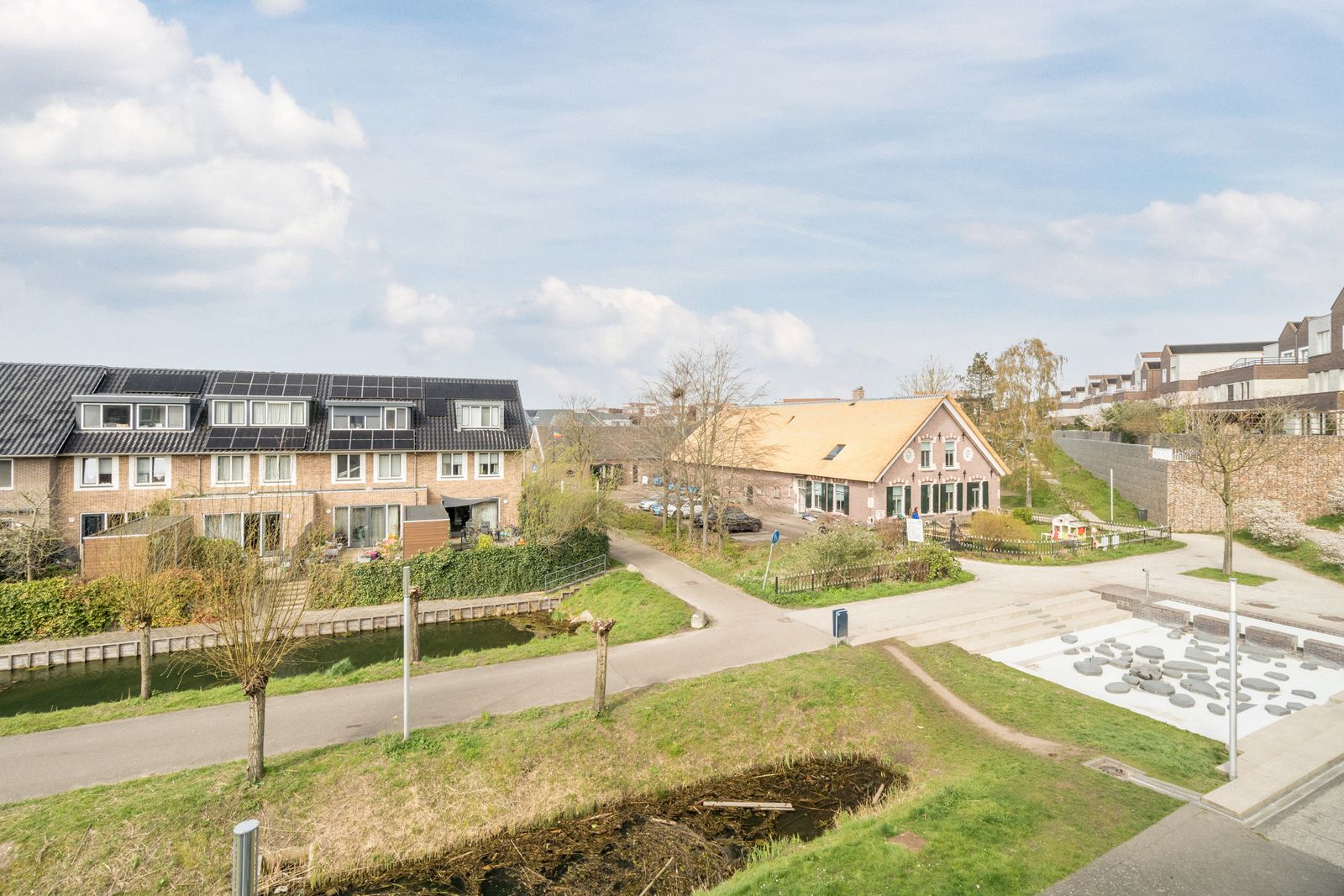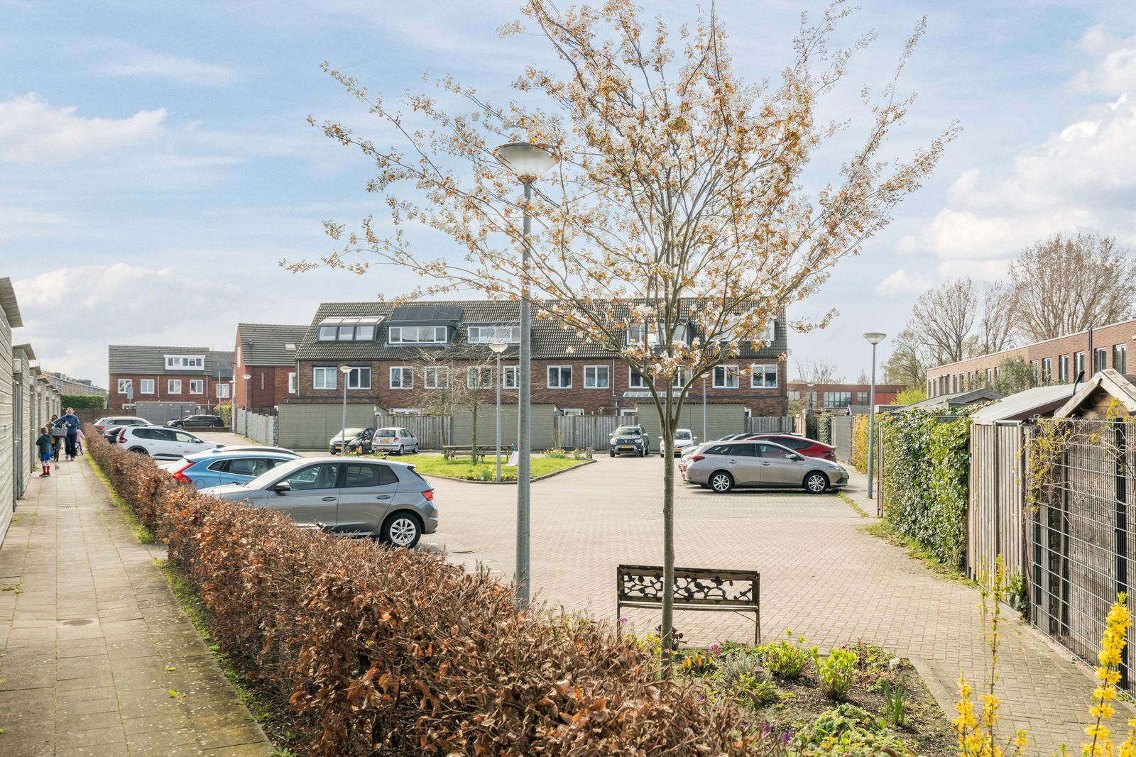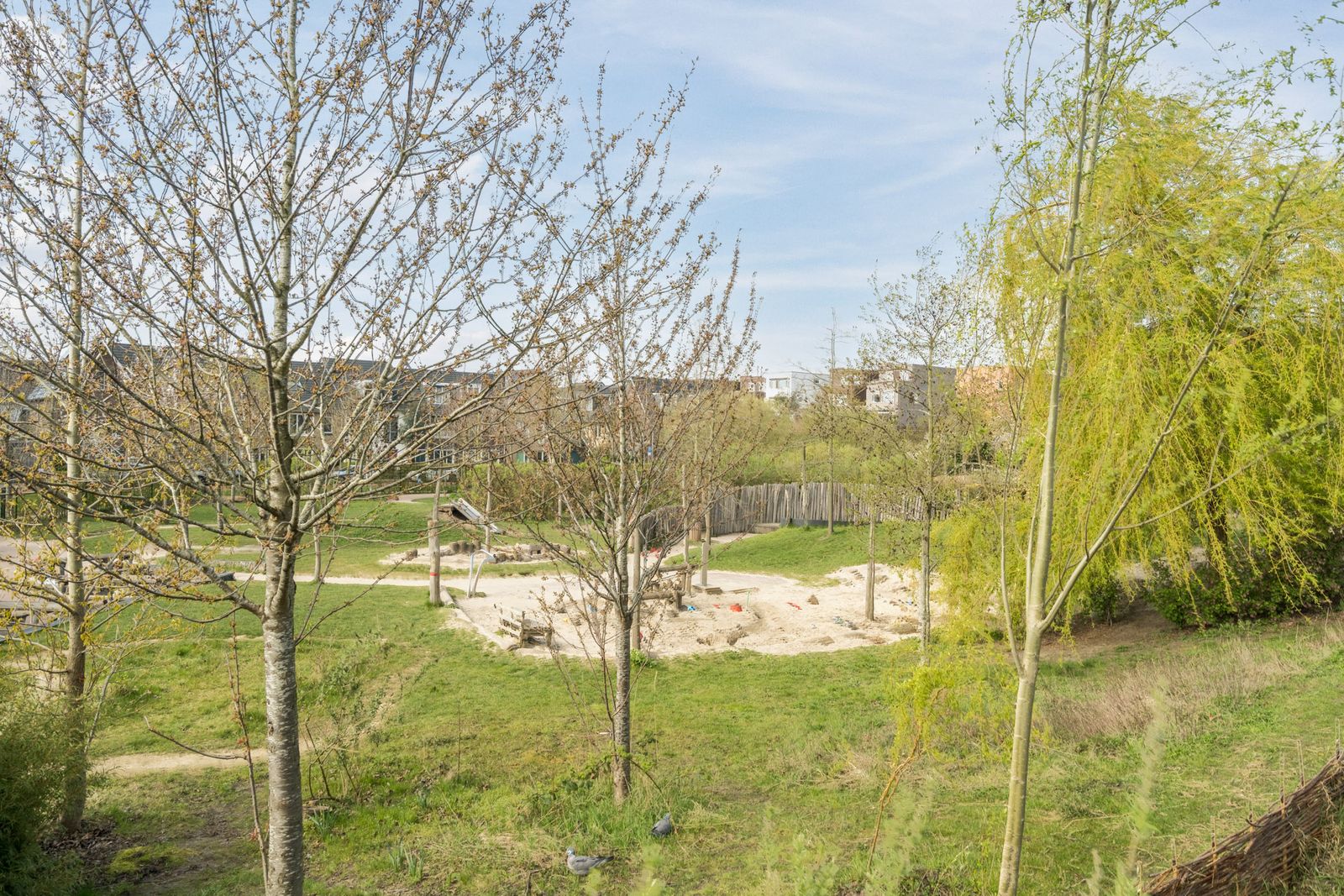 Aan de voorzijde van de woning ligt een zonneterras, gericht op het west-zuidwesten. Dat betekent volop zon vanaf het begin van de middag. Een ideale plek om te ontspannen en te borrelen in de avondzon. Daarnaast beschikt de woning over een eigen berging die behalve als opslagruimte ook prima dienst doet als fietsenstalling — perfect in deze groene, fietsvriendelijke wijk.