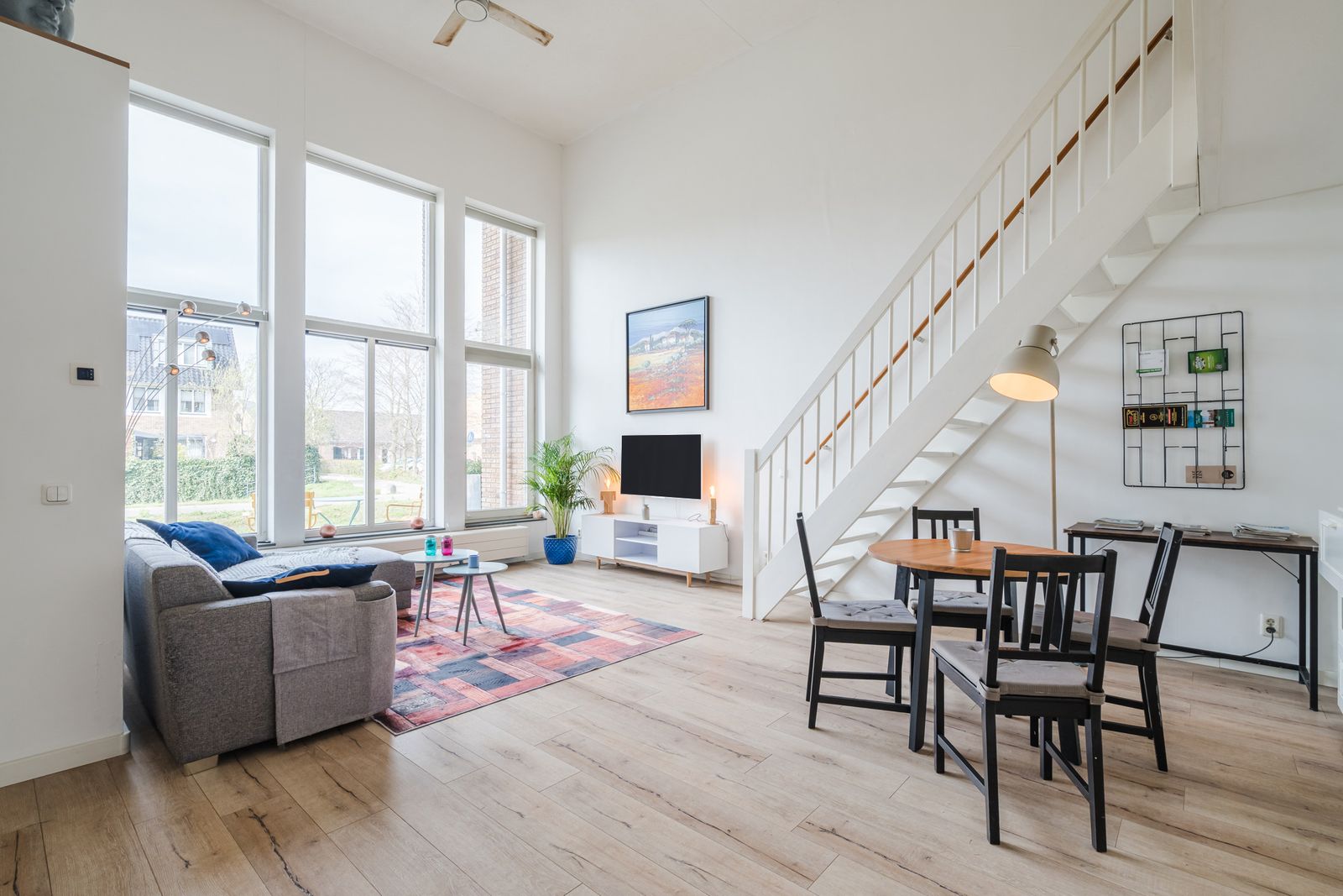 Bij binnenkomst valt meteen de indrukwekkende plafondhoogte van maar liefst 4,84 meter op. Het woongedeelte voelt hierdoor open, luchtig en bijna loftachtig. De grote raampartijen aan de voorzijde laten het daglicht rijkelijk binnenstromen en geven de woonkamer een warme, uitnodigende sfeer.