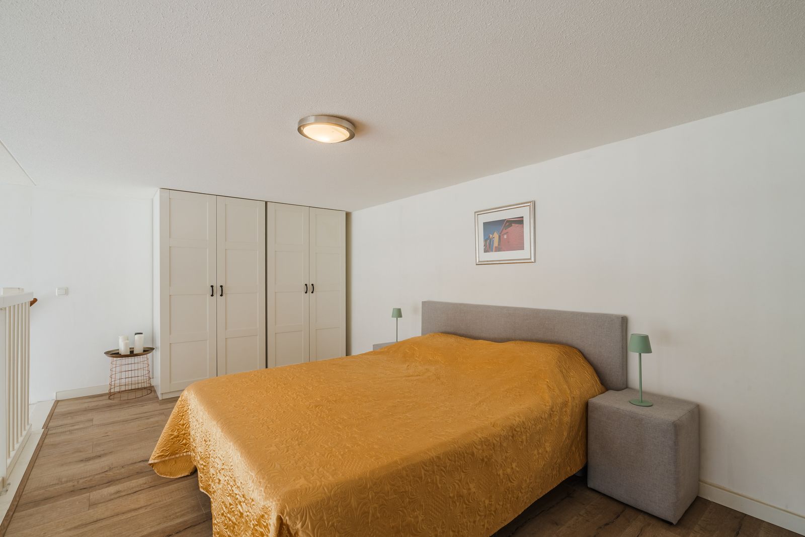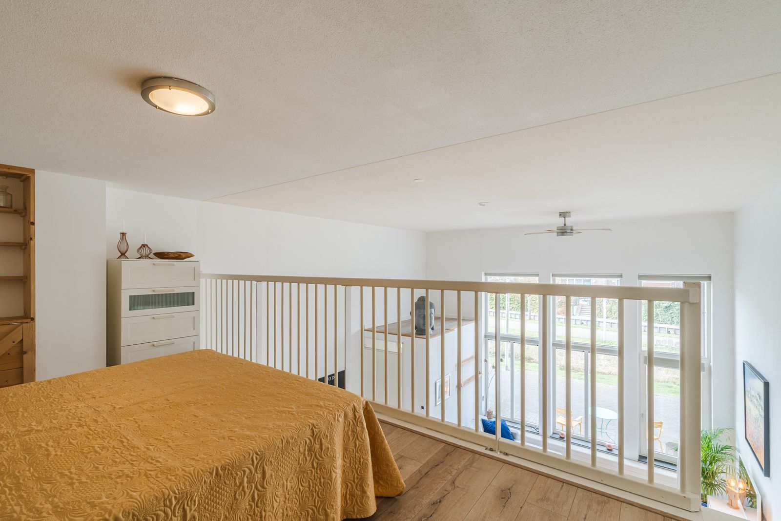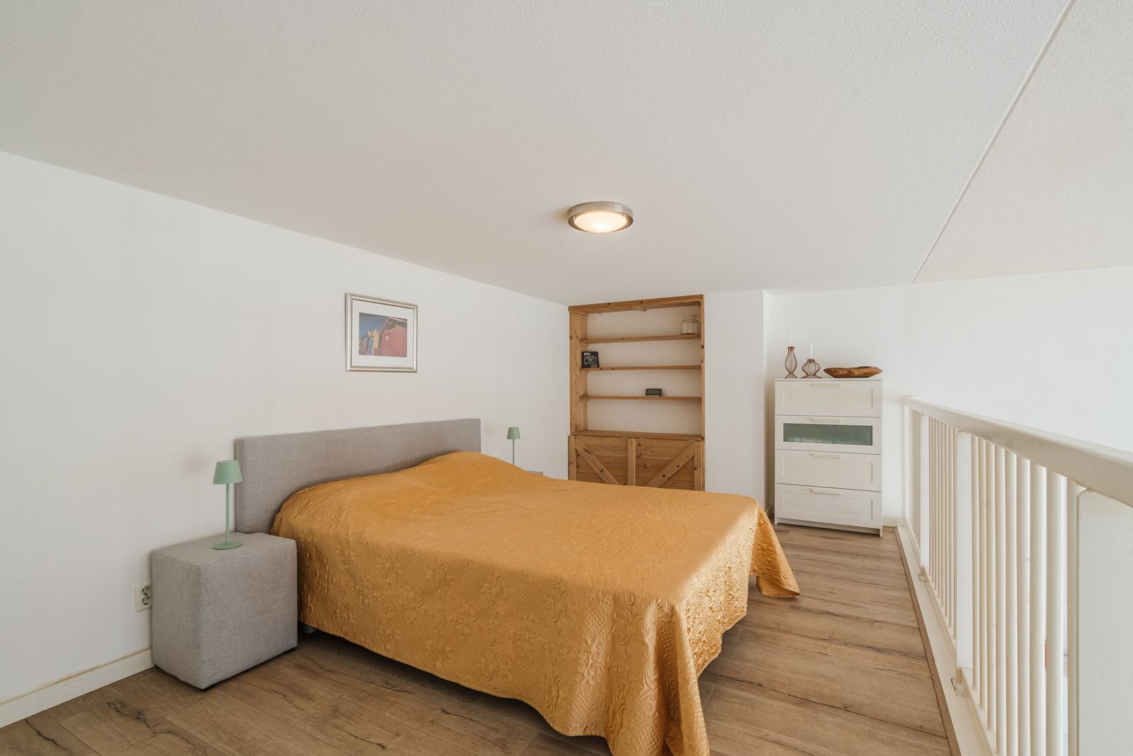 Via een open trap bereik je de slimme slaapvide, die de plafondhoogte van de woning optimaal benut en meer dan genoeg ruimte biedt voor een tweepersoons bed en meerdere opbergkasten. Er is desgewenst ook ruimte voor een thuiswerkplek. Zo blijft de volledige begane grond beschikbaar voor een royale leefruimte.