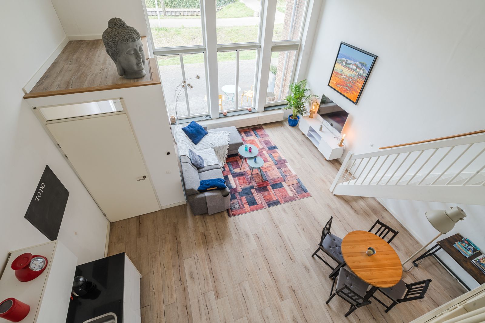 Upon entering, the impressive ceiling height of no less than 4.84 metres immediately catches the eye. This gives the living area an open, airy, almost loft-like atmosphere. The large front-facing windows allow daylight to pour in, giving the living room a warm and inviting feel.