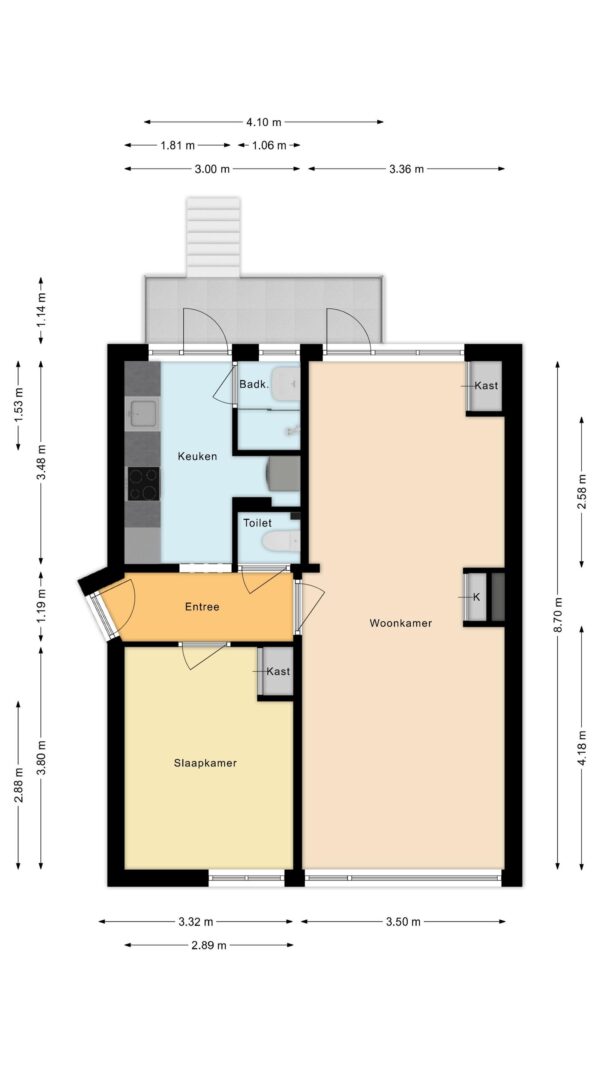 Entree/hal met toegang tot alle ruimtes. Ruime en lichte woon-eetkamer (voorheen twee kamers) met deur naar het balkon. Slaapkamer aan de voorzijde. Nette keuken met aansluiting voor de wasmachine en toegang tot de eenvoudige badkamer en tot het balkon en de tuin. Separaat toilet.