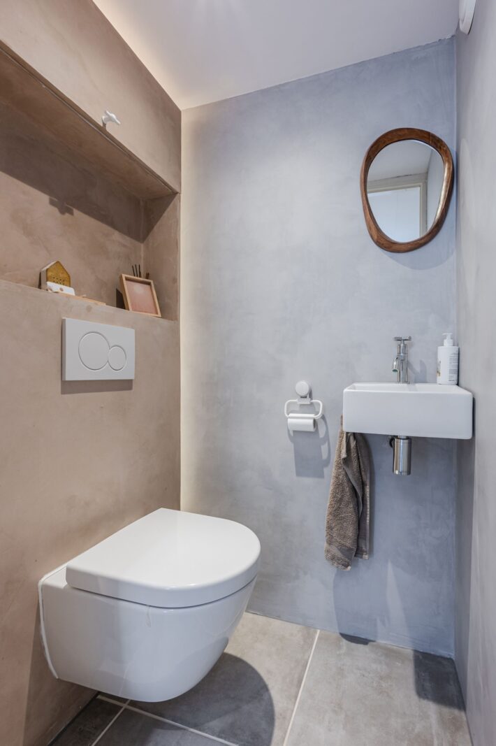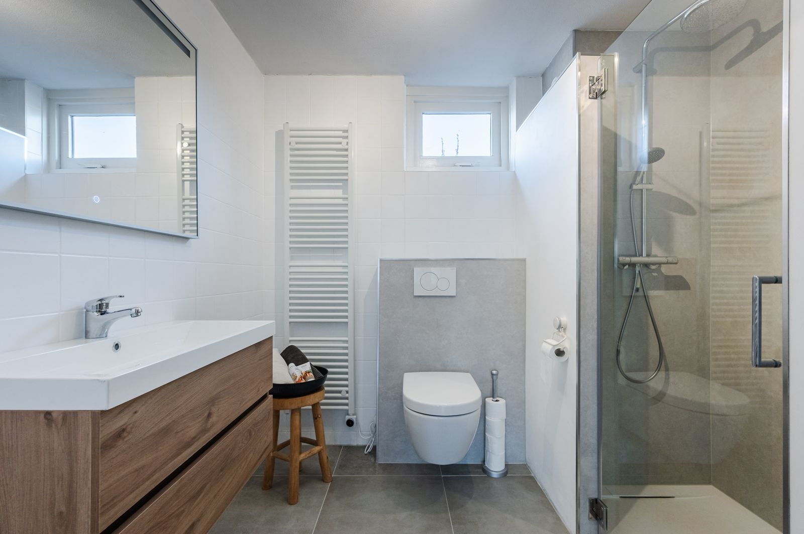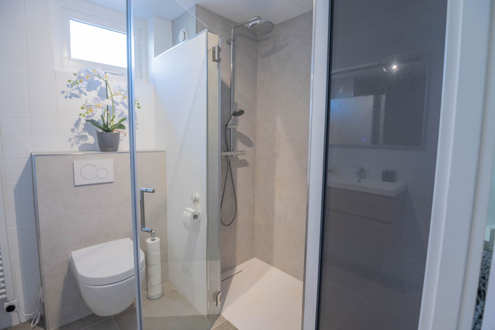 Eerste verdieping: overloop, drie ruime slaapkamers, badkamer (2025) met douche, wastafel en tweede toilet.