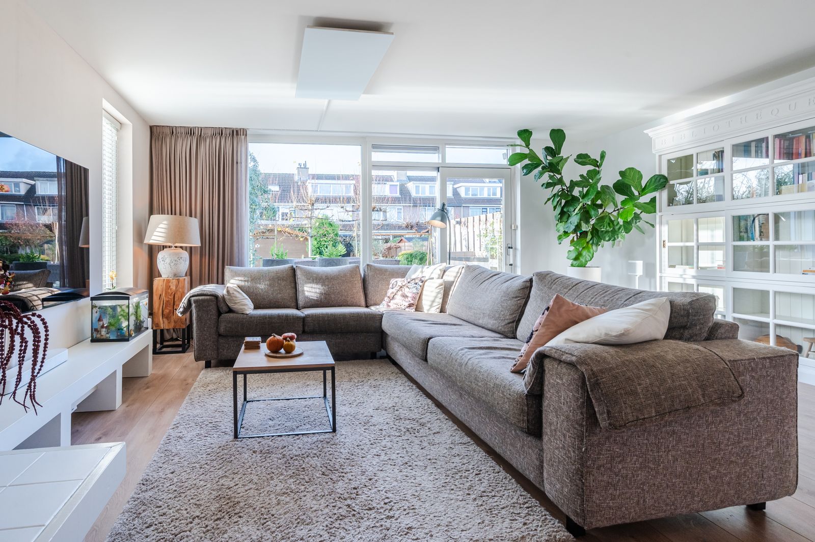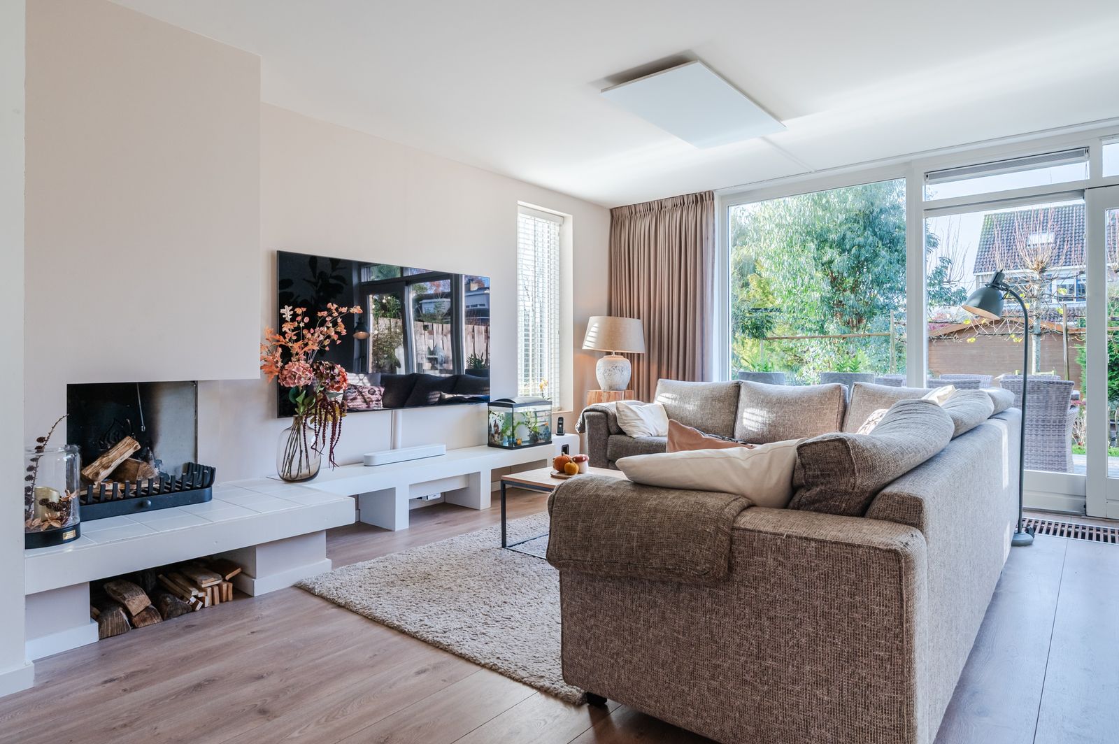 -Lichte en riante woonkamer met open haard, waar je geniet van warmte, gezelligheid én uitzicht op de groene achtertuin.